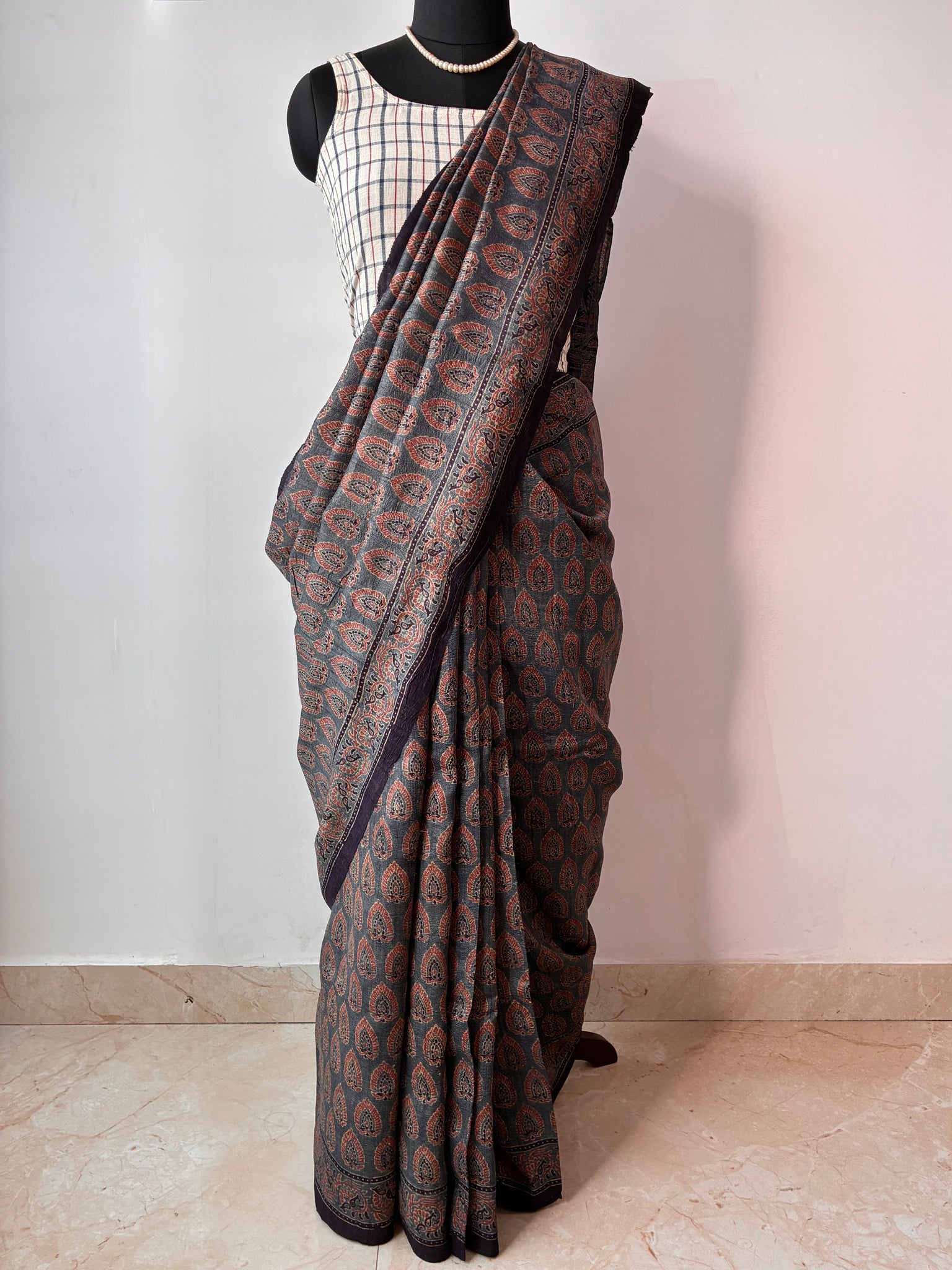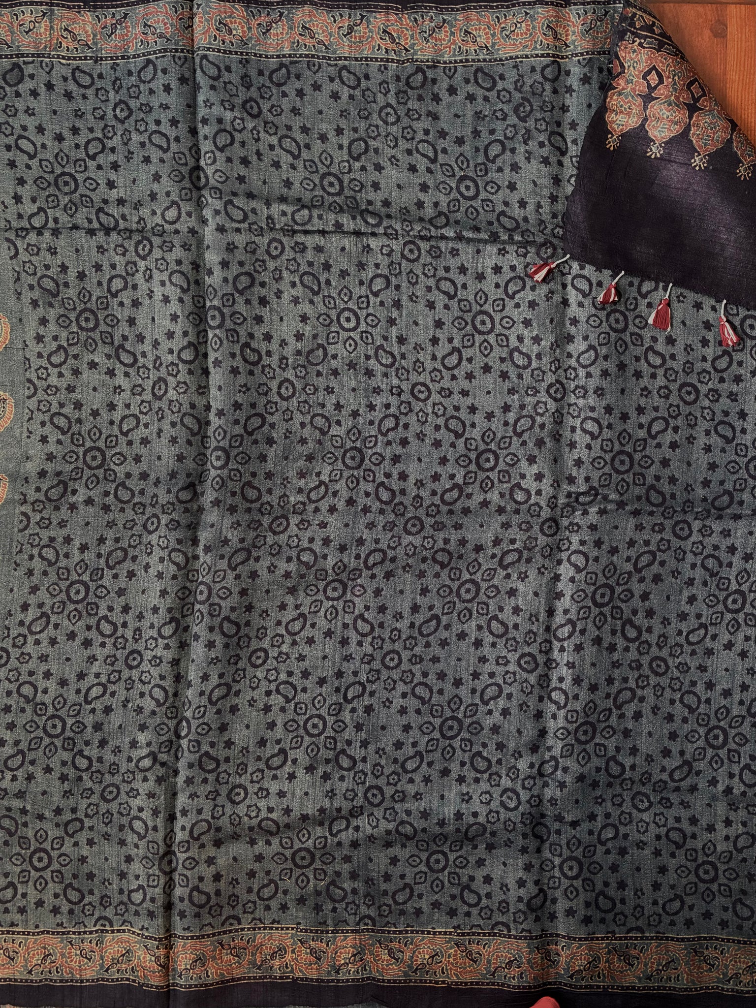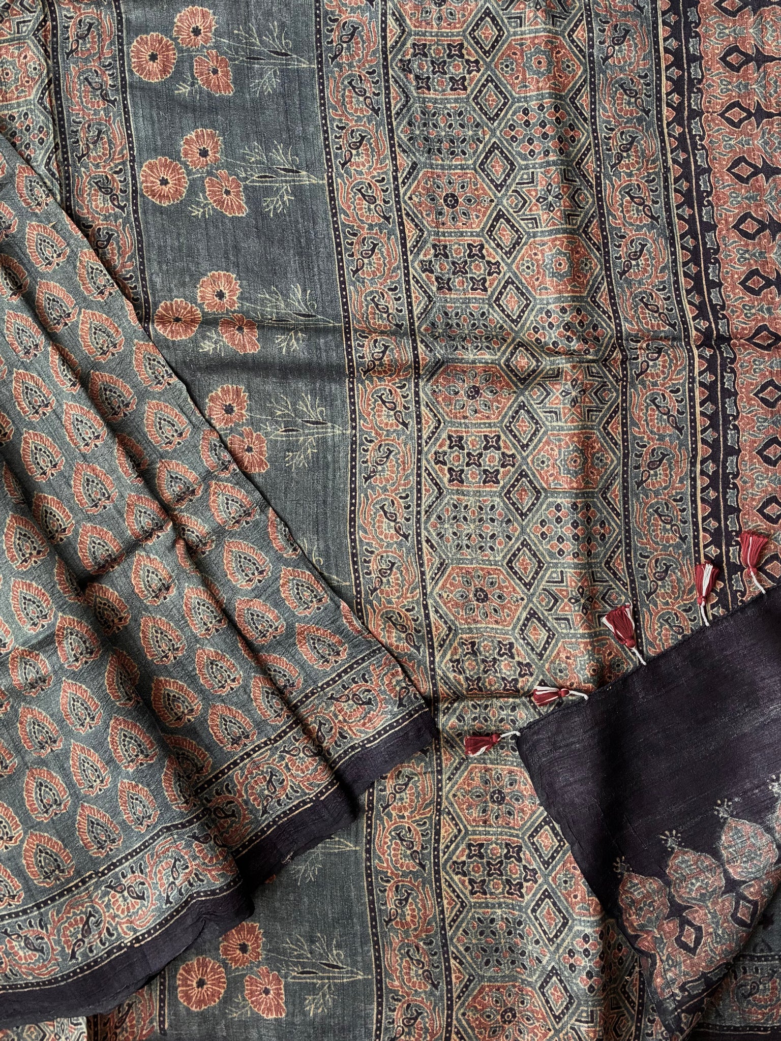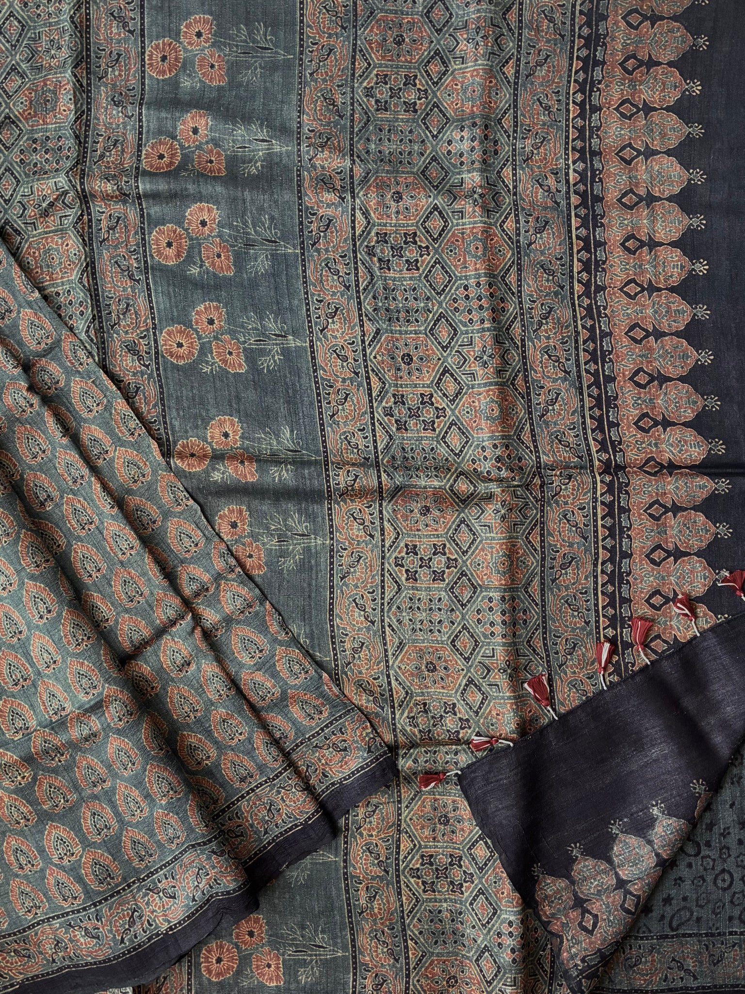 Ajrakh Tussar Silk Saree (block printed using natural dyes)