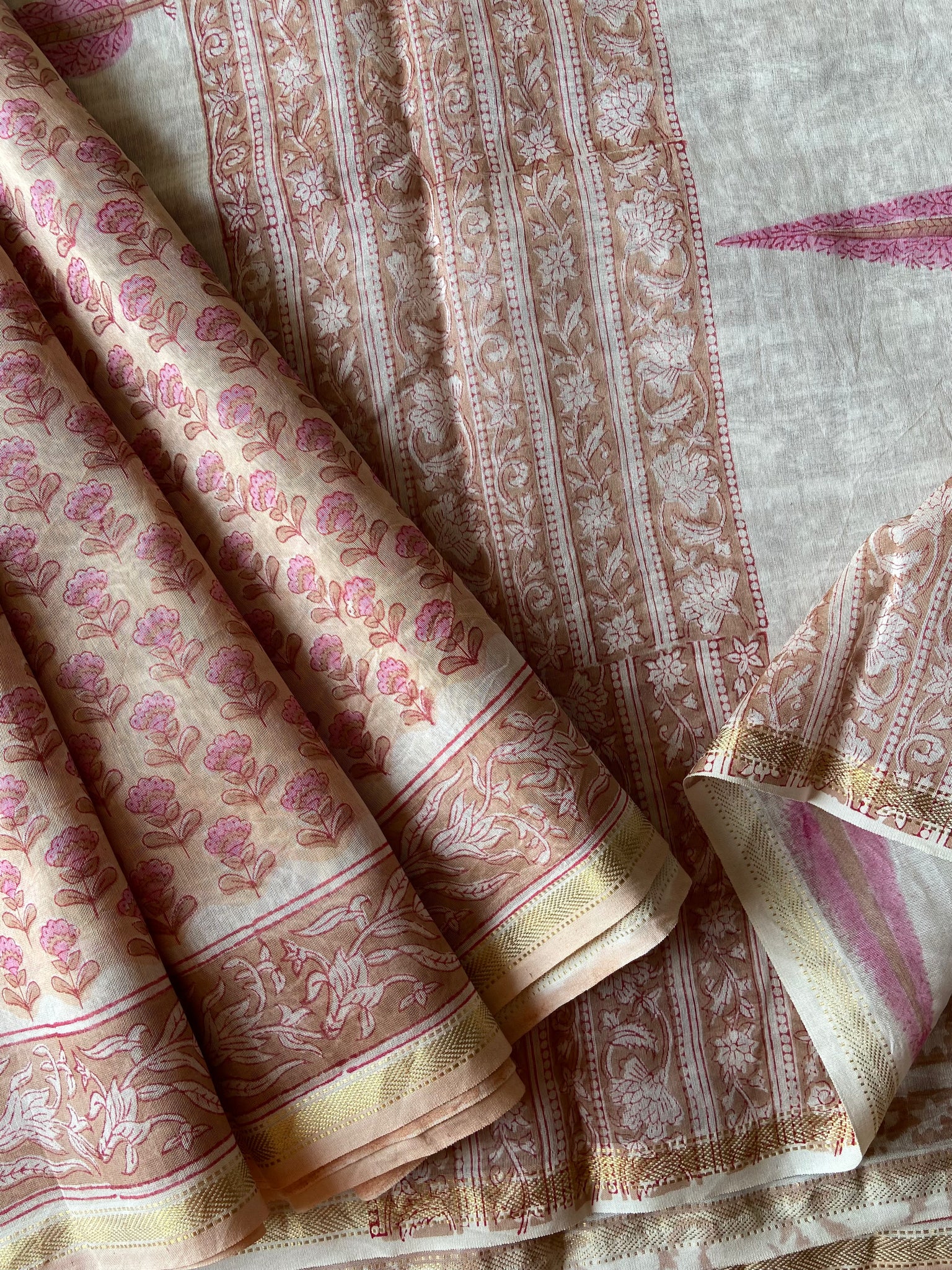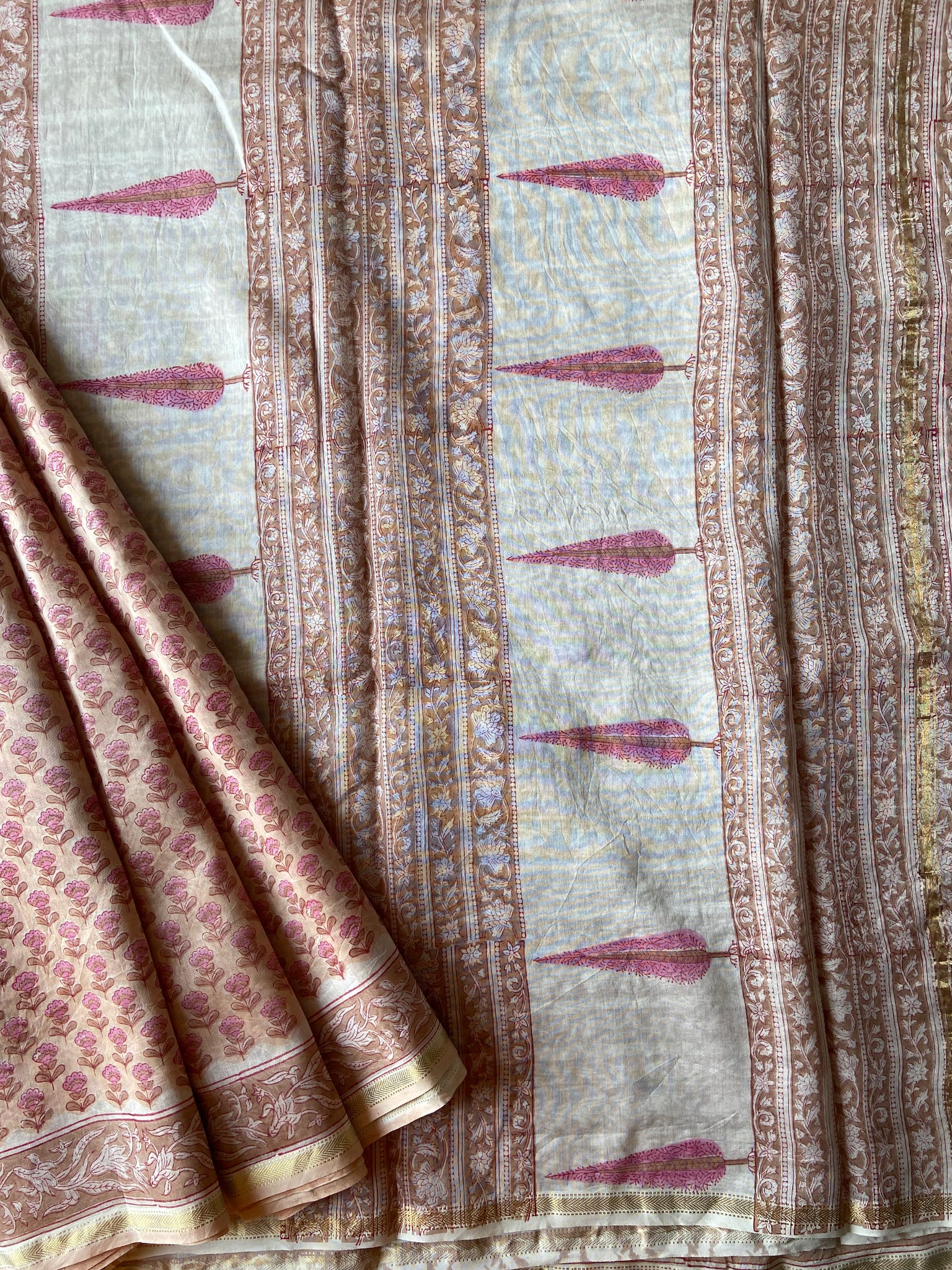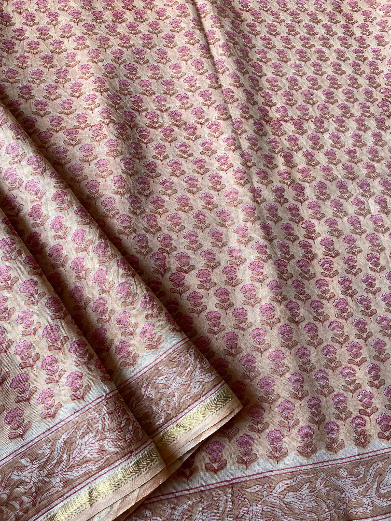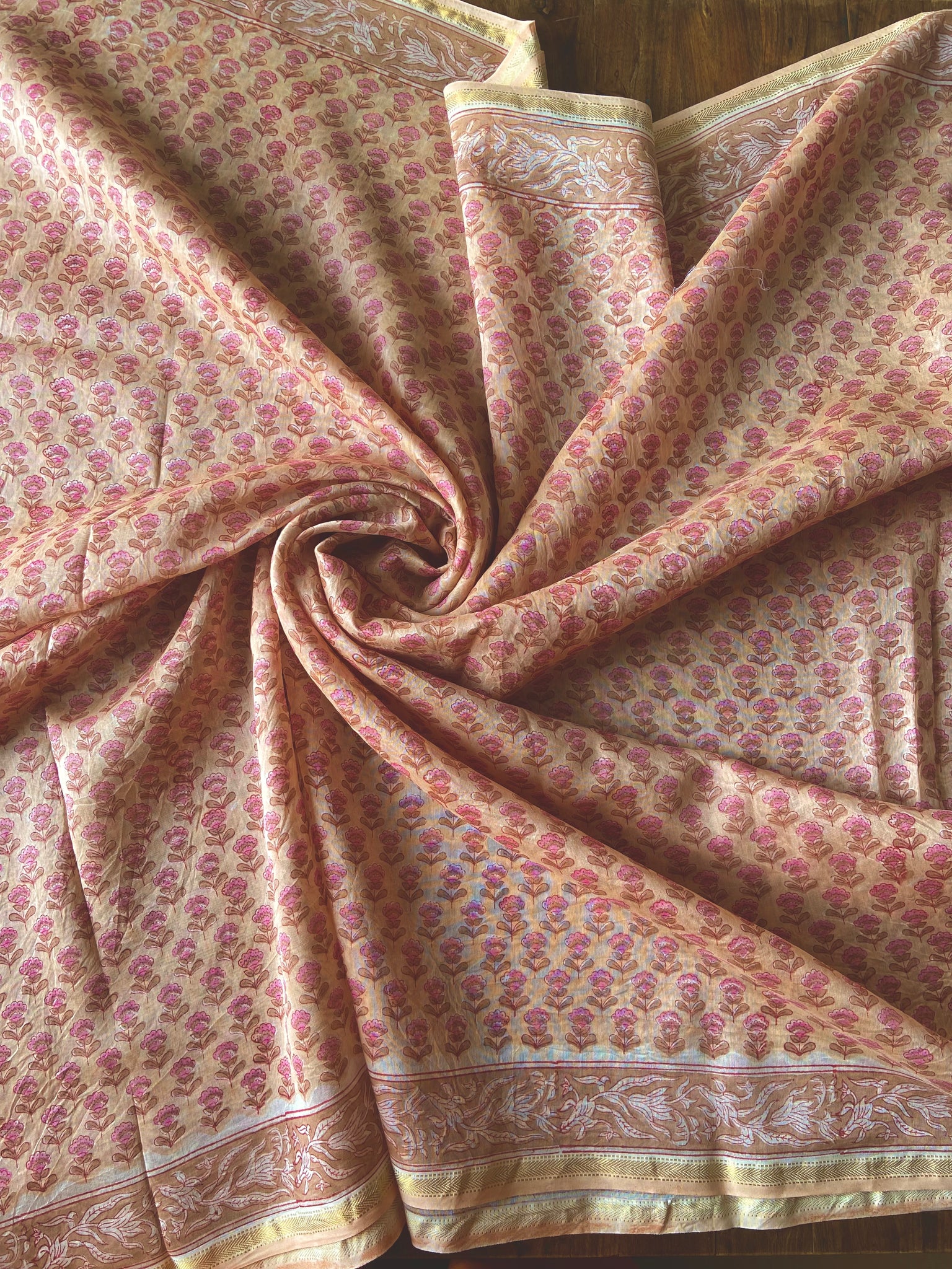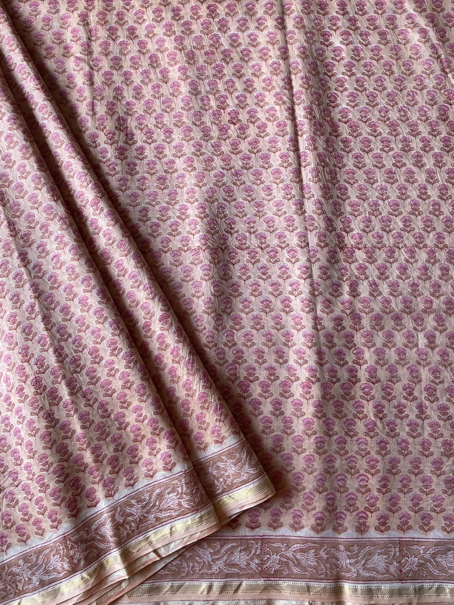 Fine Block-Printed Pure silk-cotton sarees that have been hand block-printed with wooden blocks multiple times to create detailed and intricate designs. These soft and easy to drape sarees come with running, matching blouse pieces. The fabric used is power-loom pure silk-cotton wrongly callied Chanderi/ Maheshwari depending upon the border design by some.