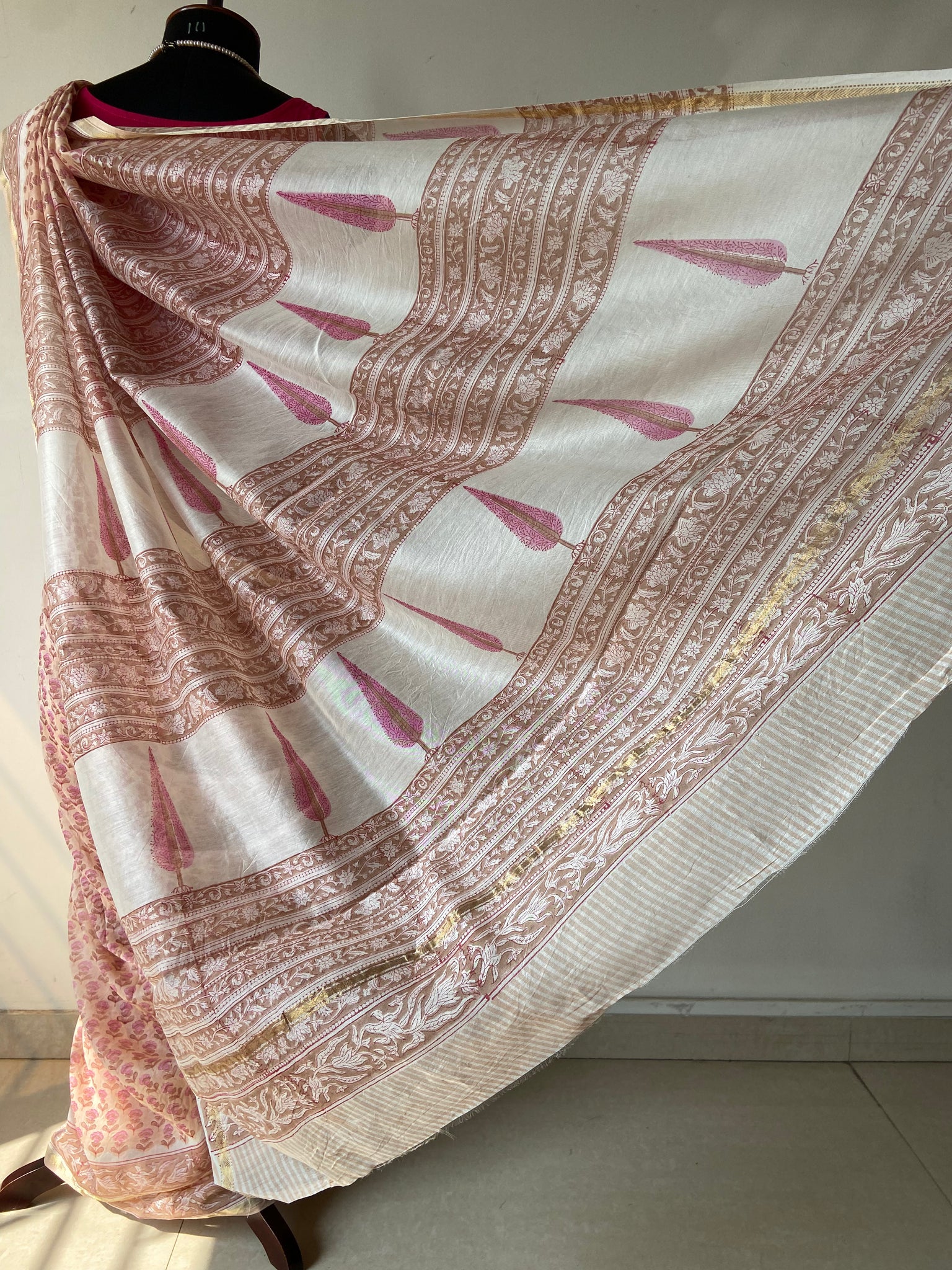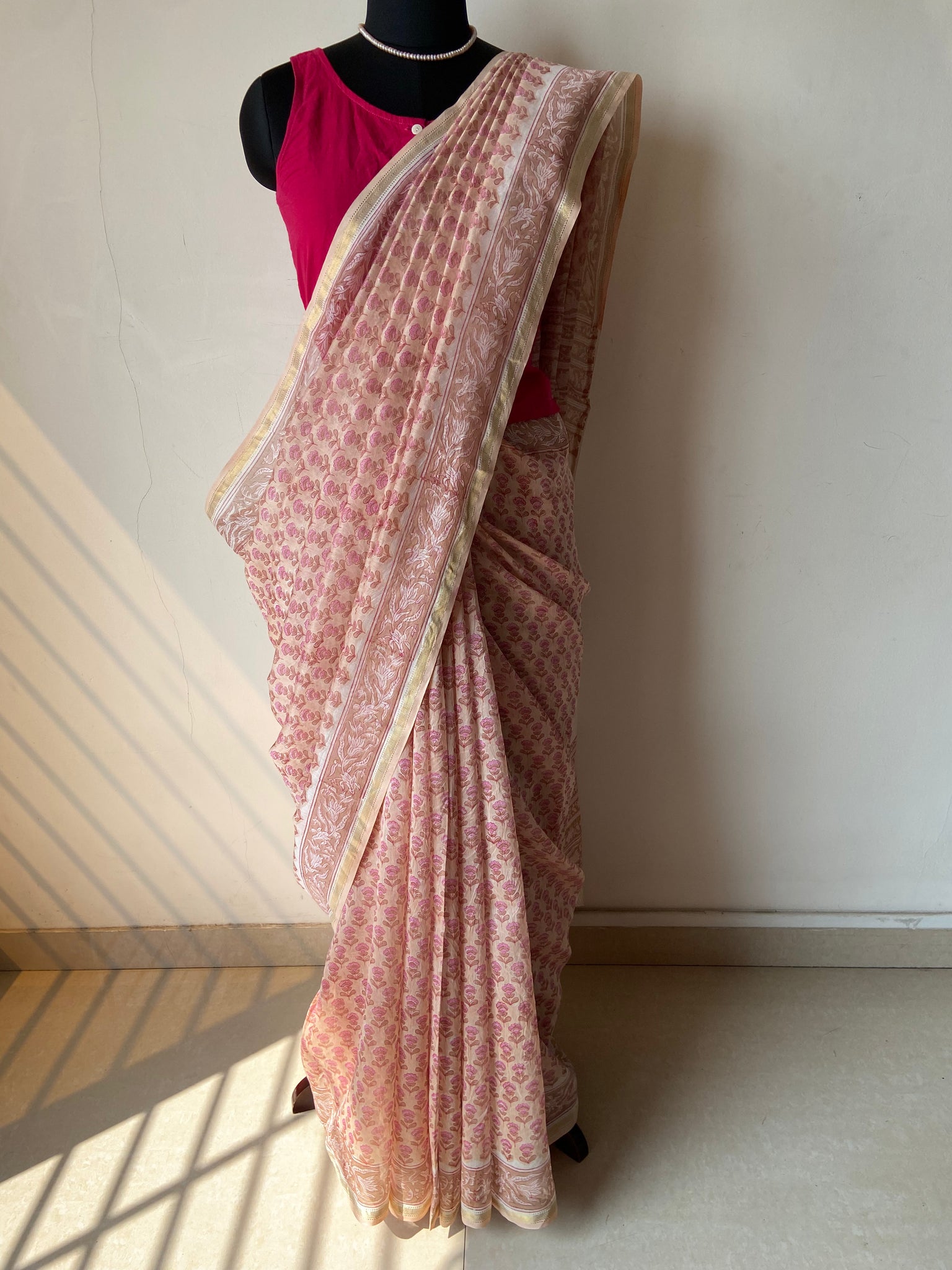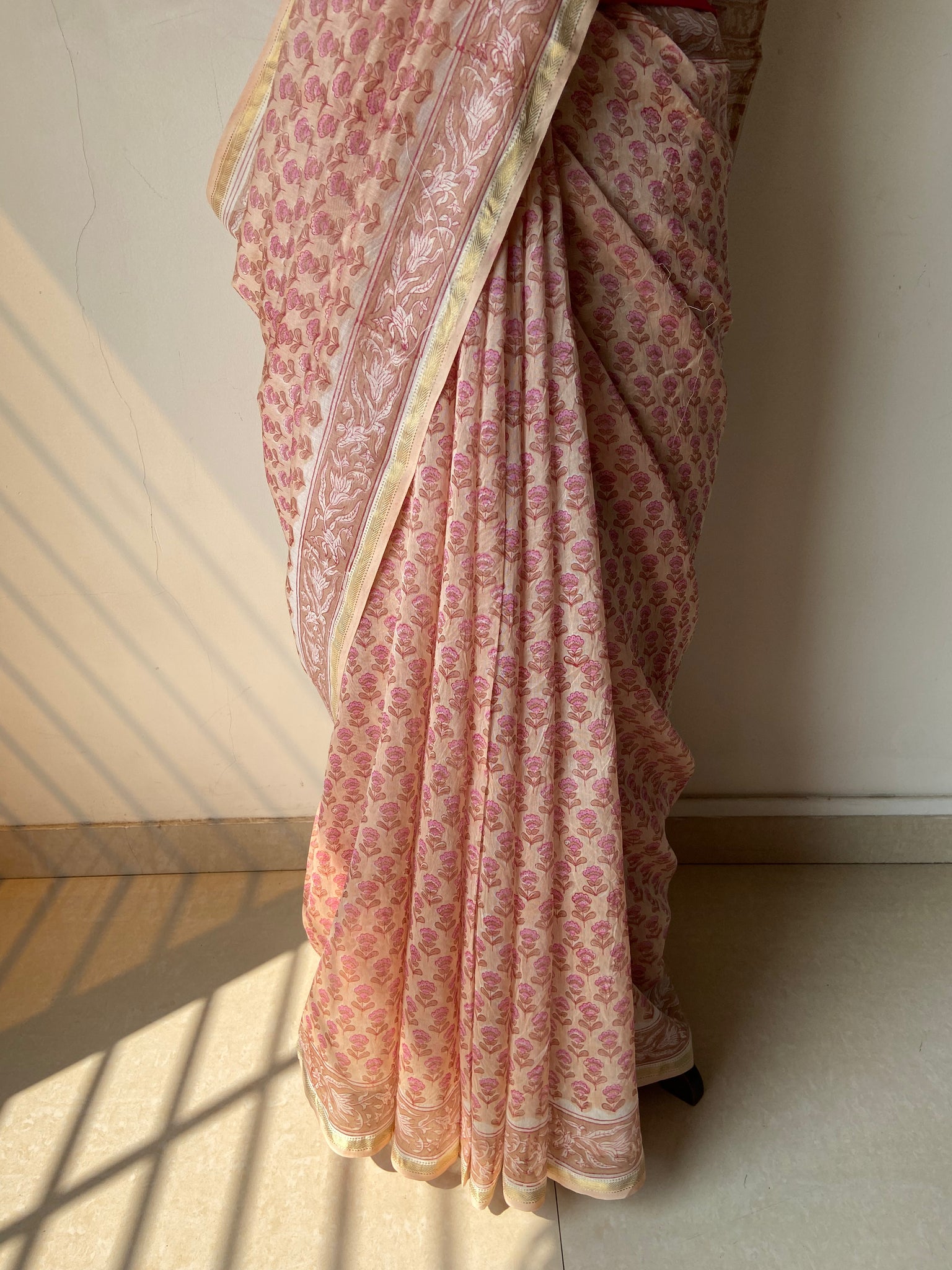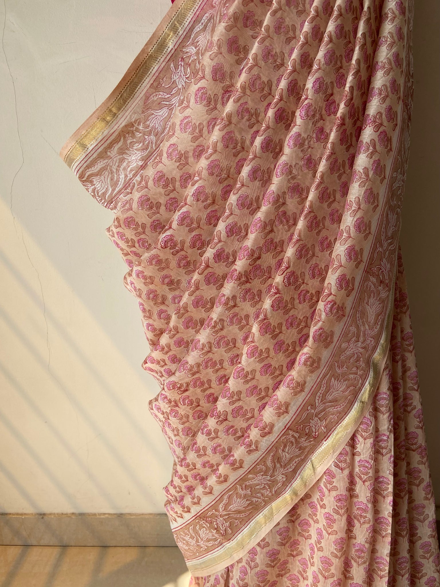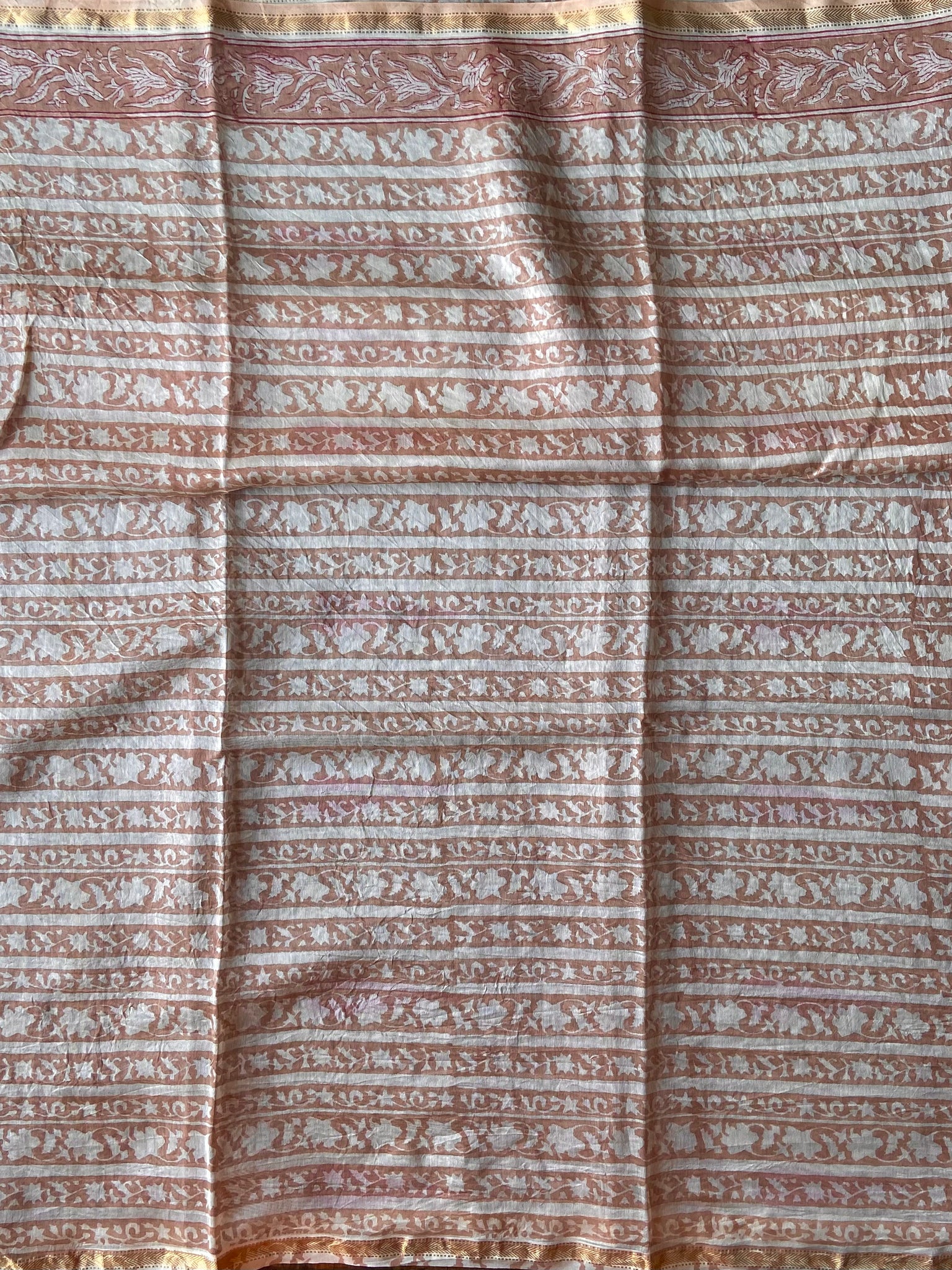 Fine Block-Printed Pure silk-cotton sarees that have been hand block-printed with wooden blocks multiple times to create detailed and intricate designs. These soft and easy to drape sarees come with running, matching blouse pieces. The fabric used is power-loom pure silk-cotton wrongly callied Chanderi/ Maheshwari depending upon the border design by some.