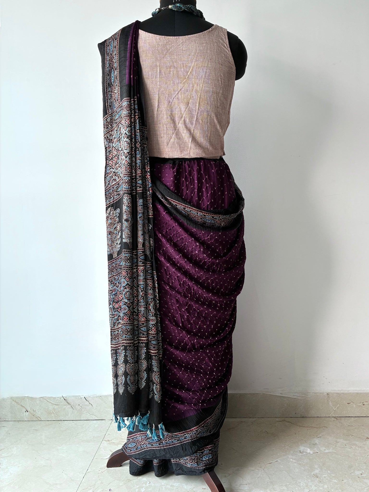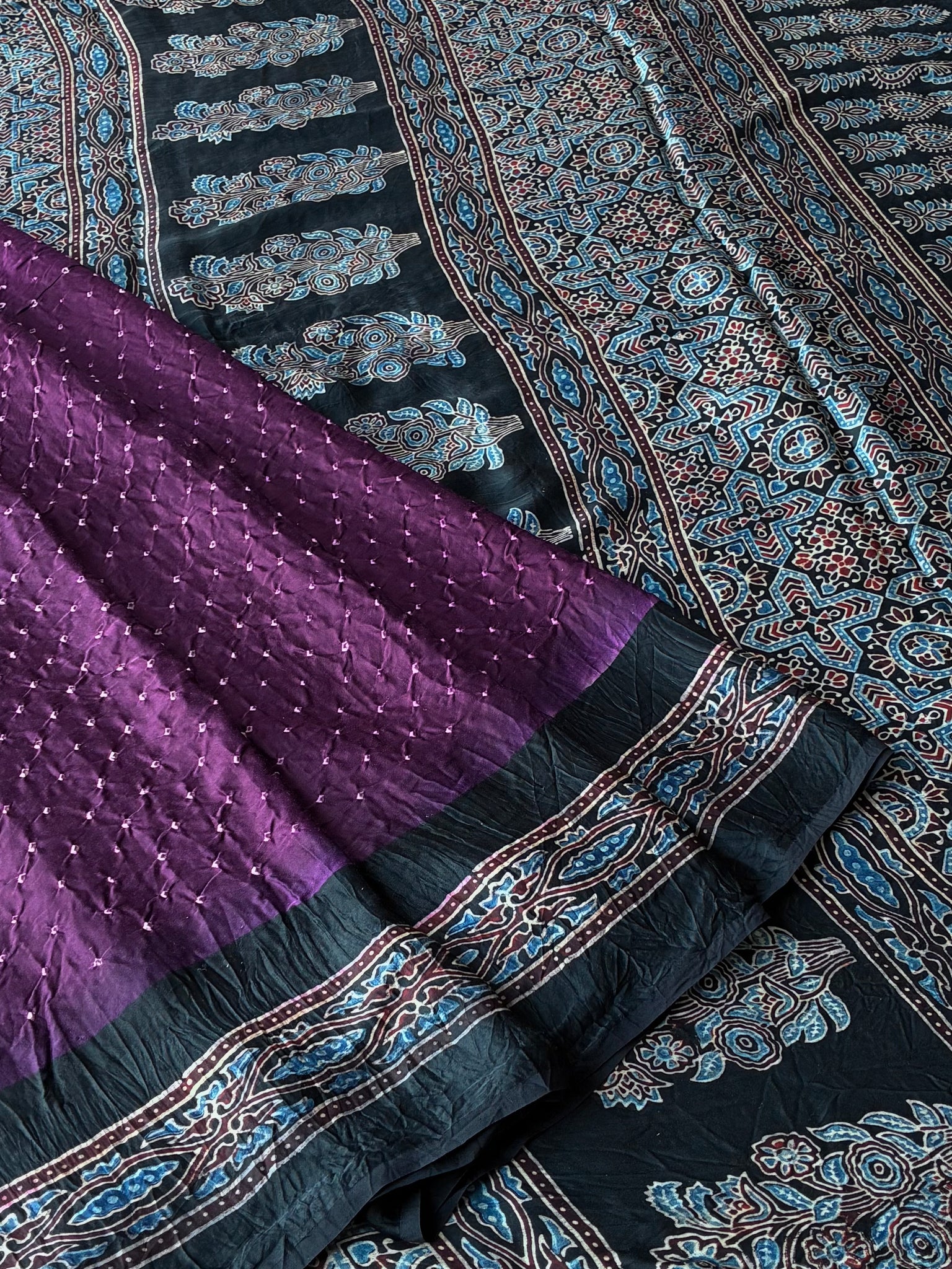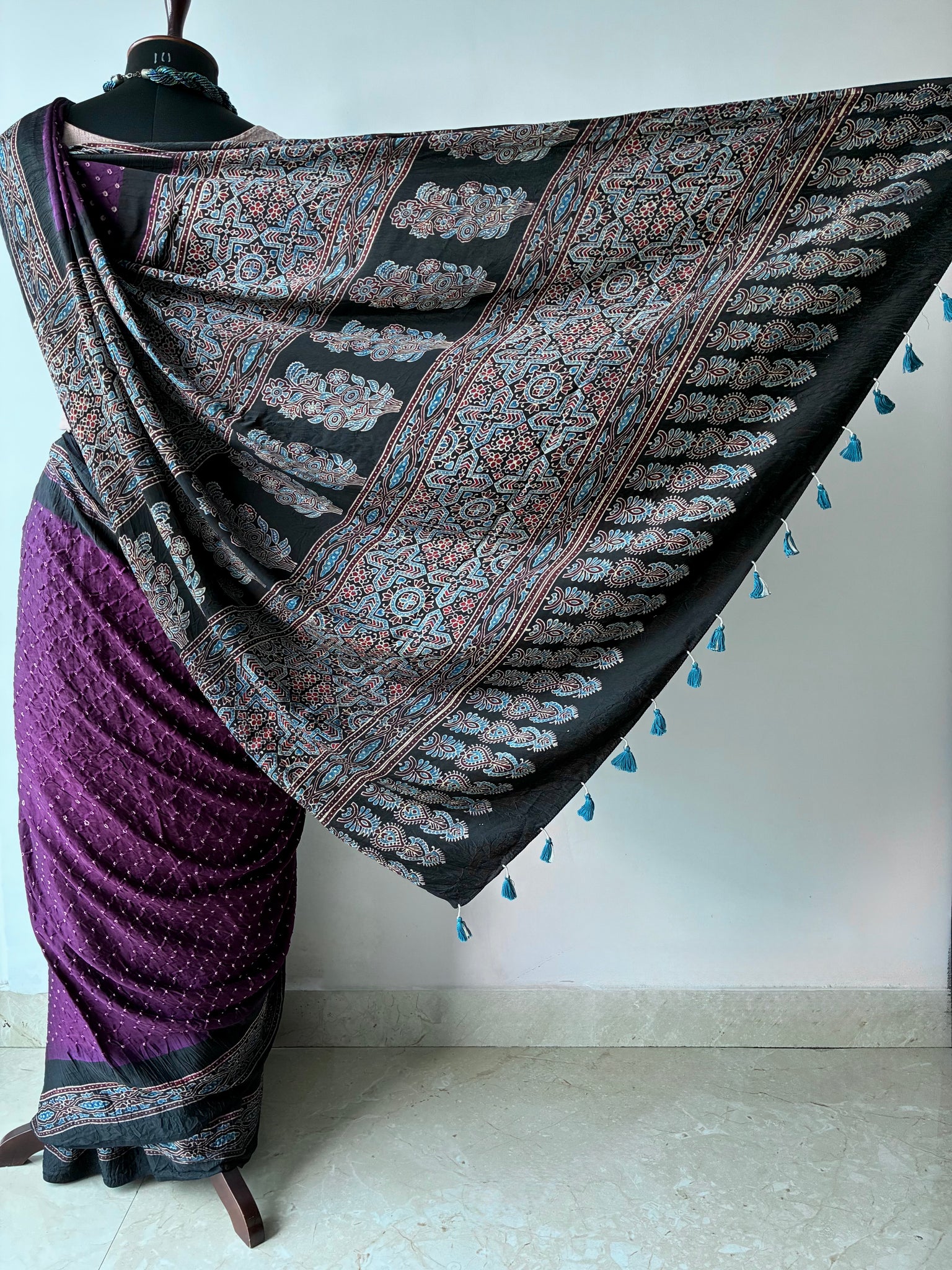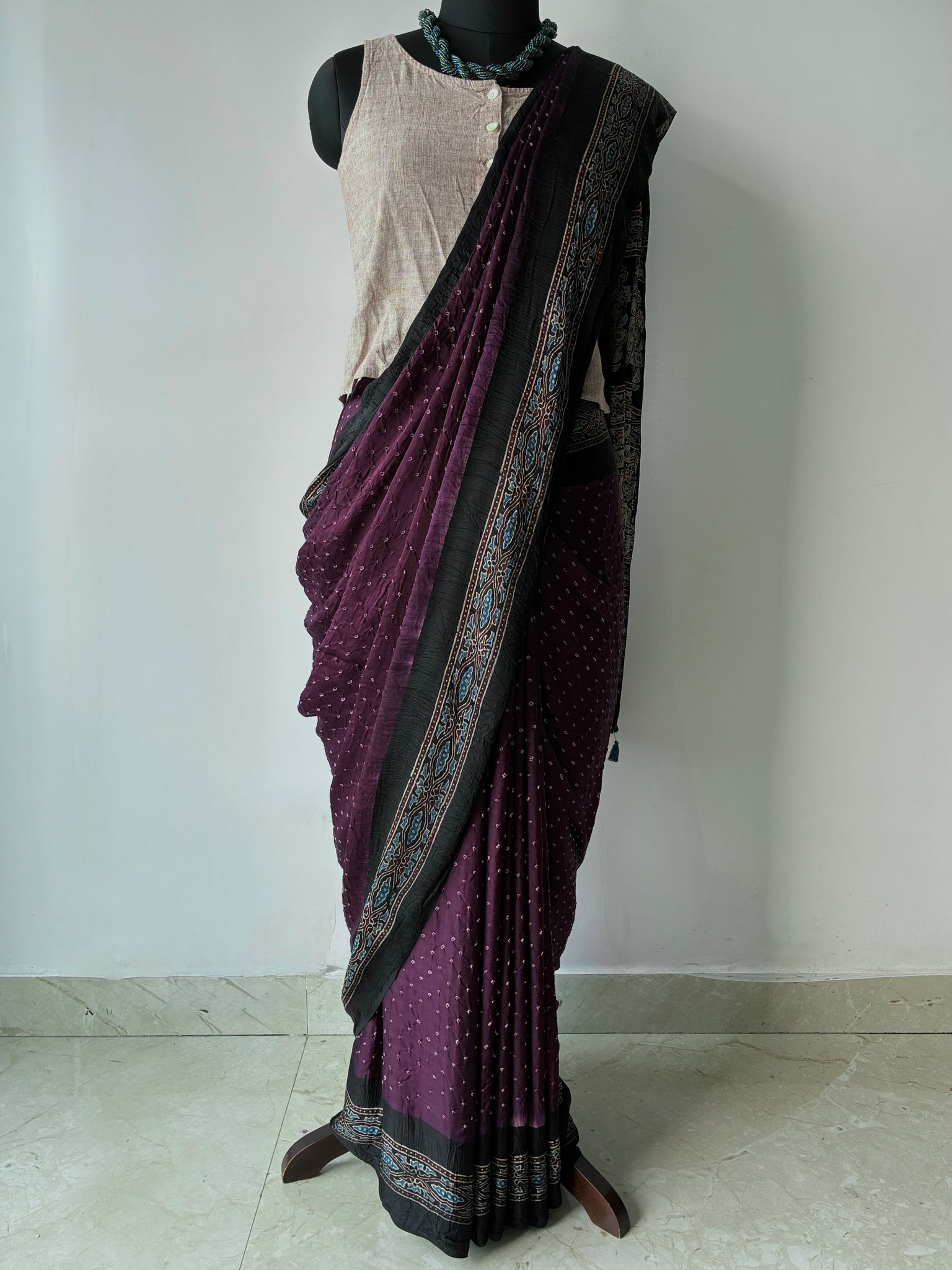 Ajrakh Bandhani, modal silk saree with matching blouse piece.
