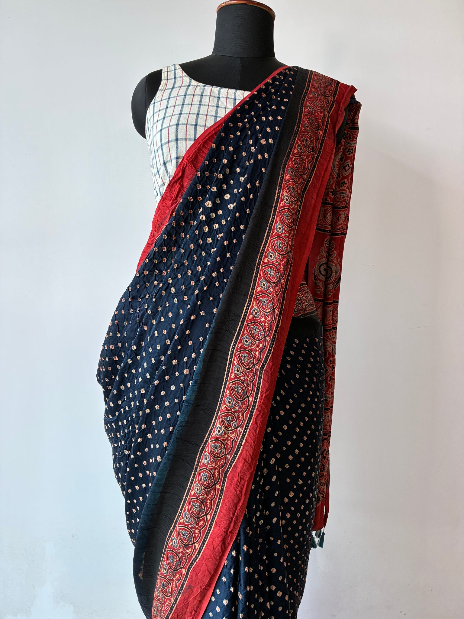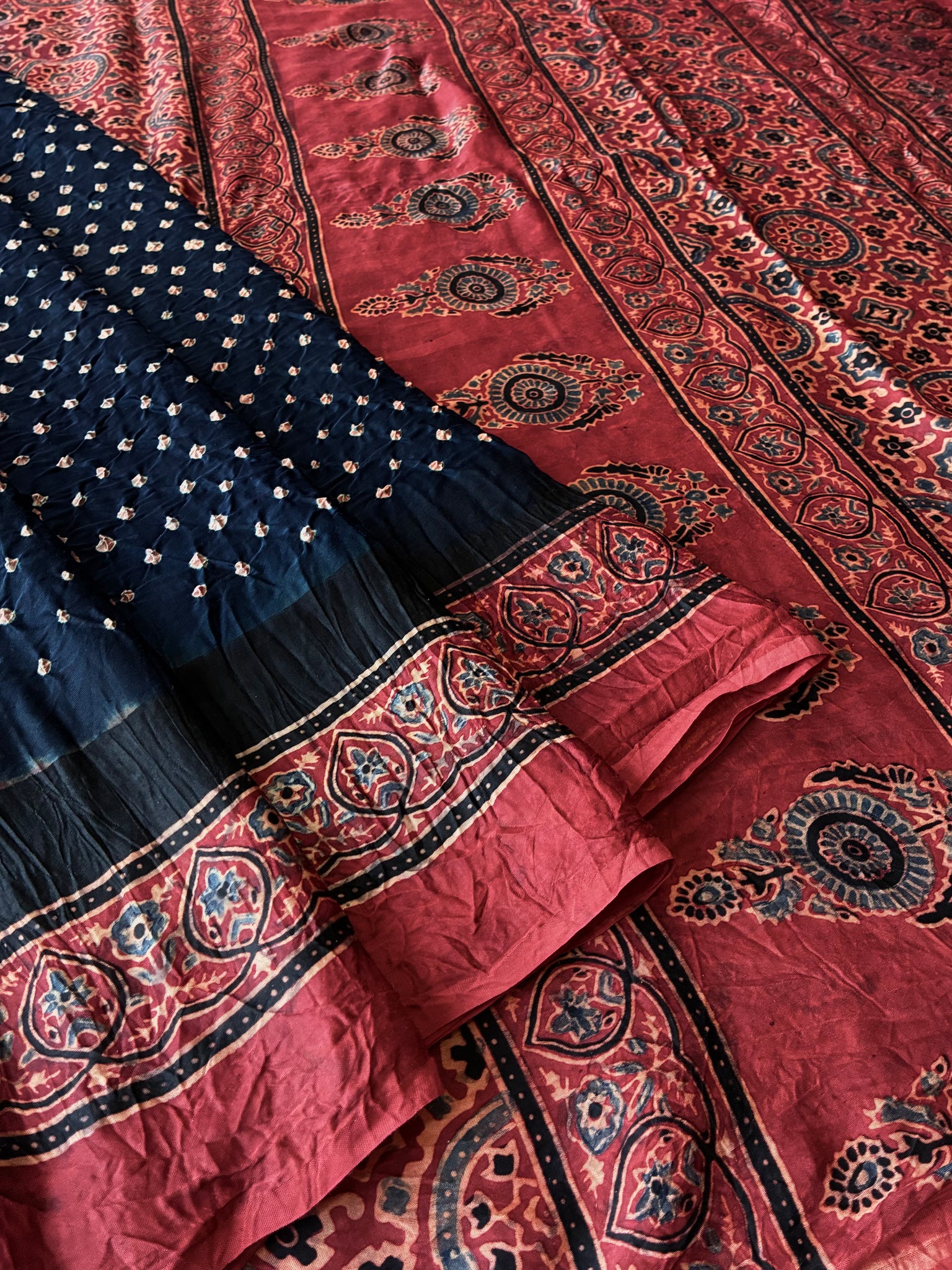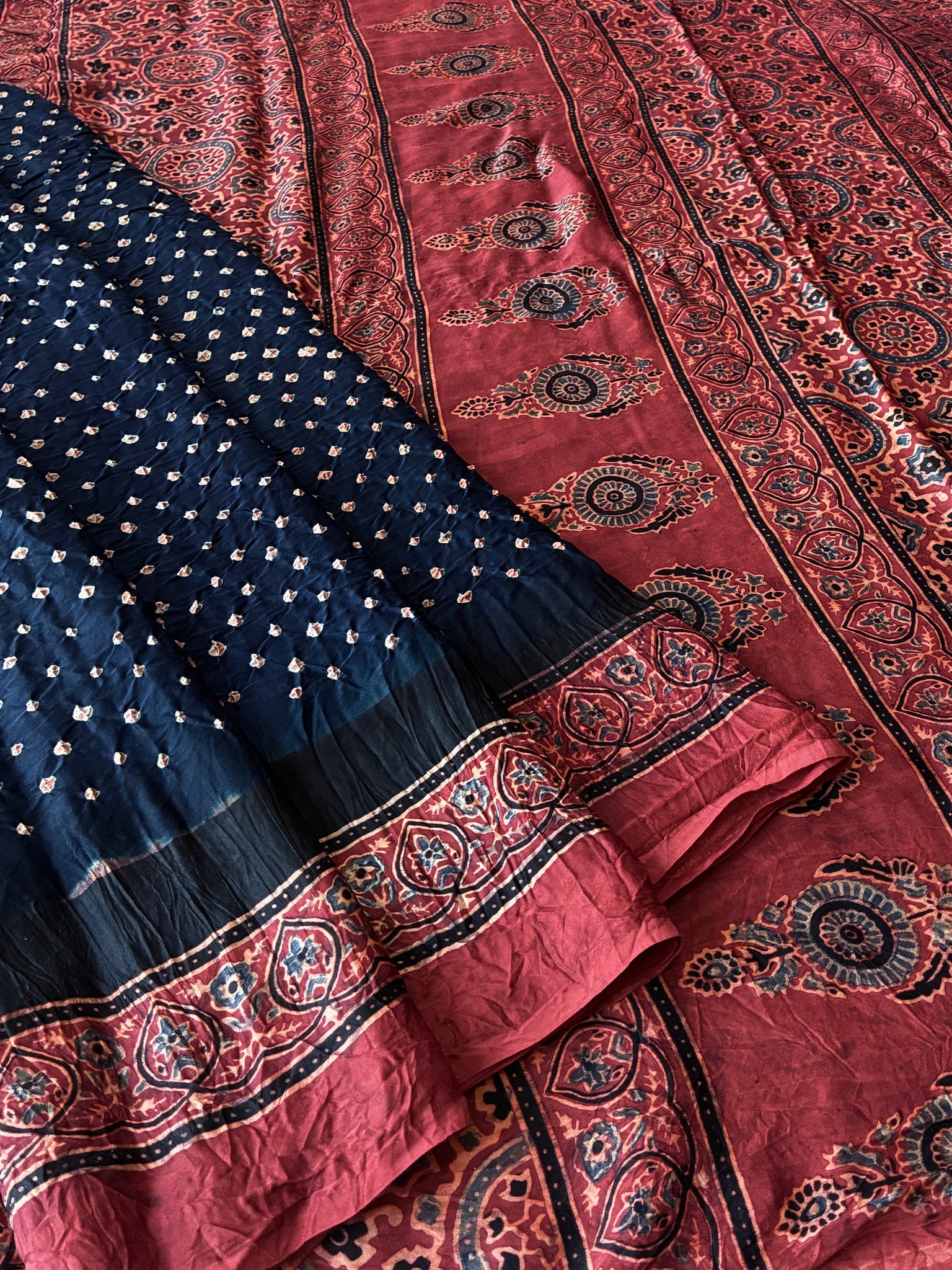 Ajrakh Bandhani, modal silk saree with matching blouse piece.