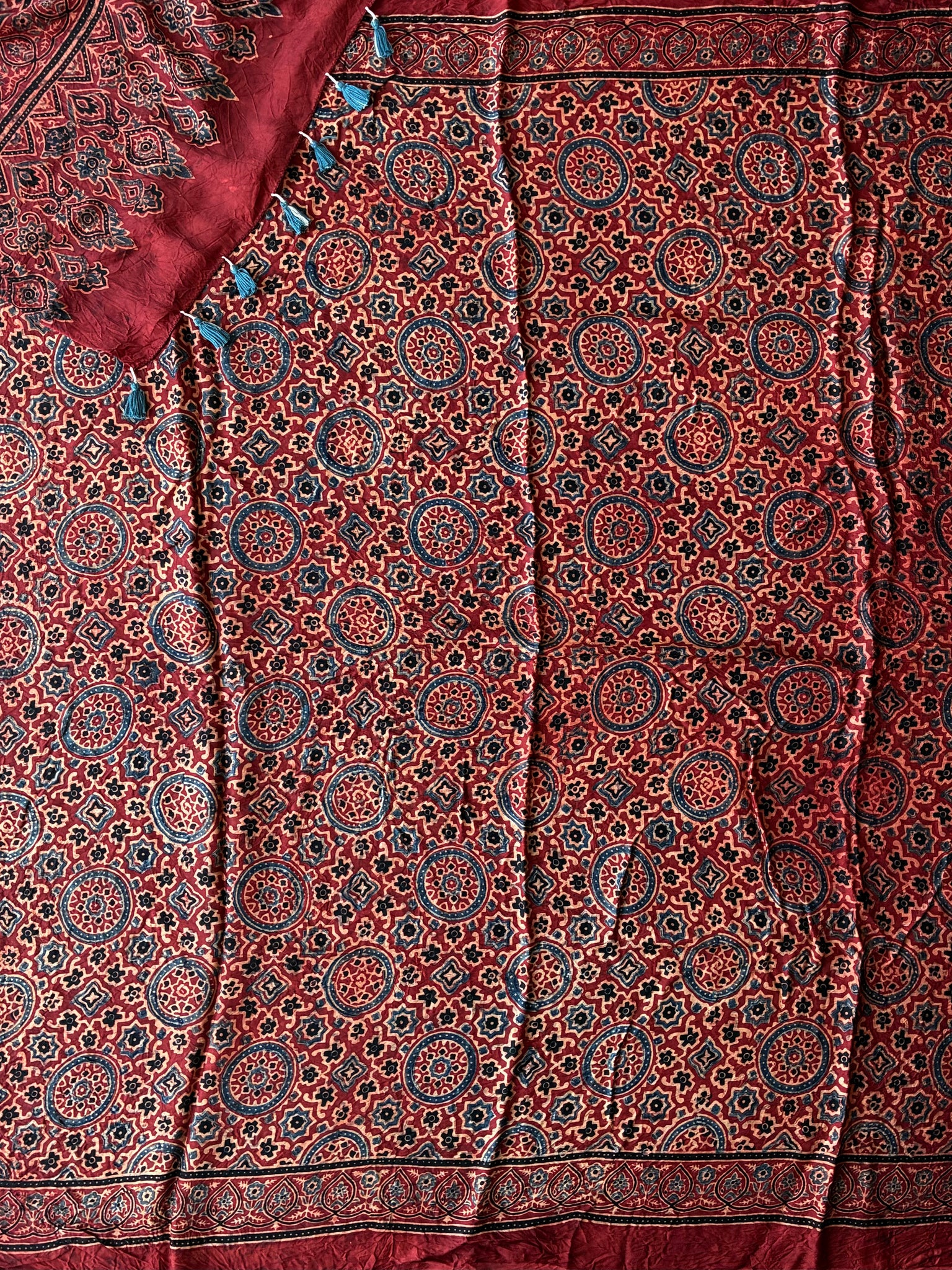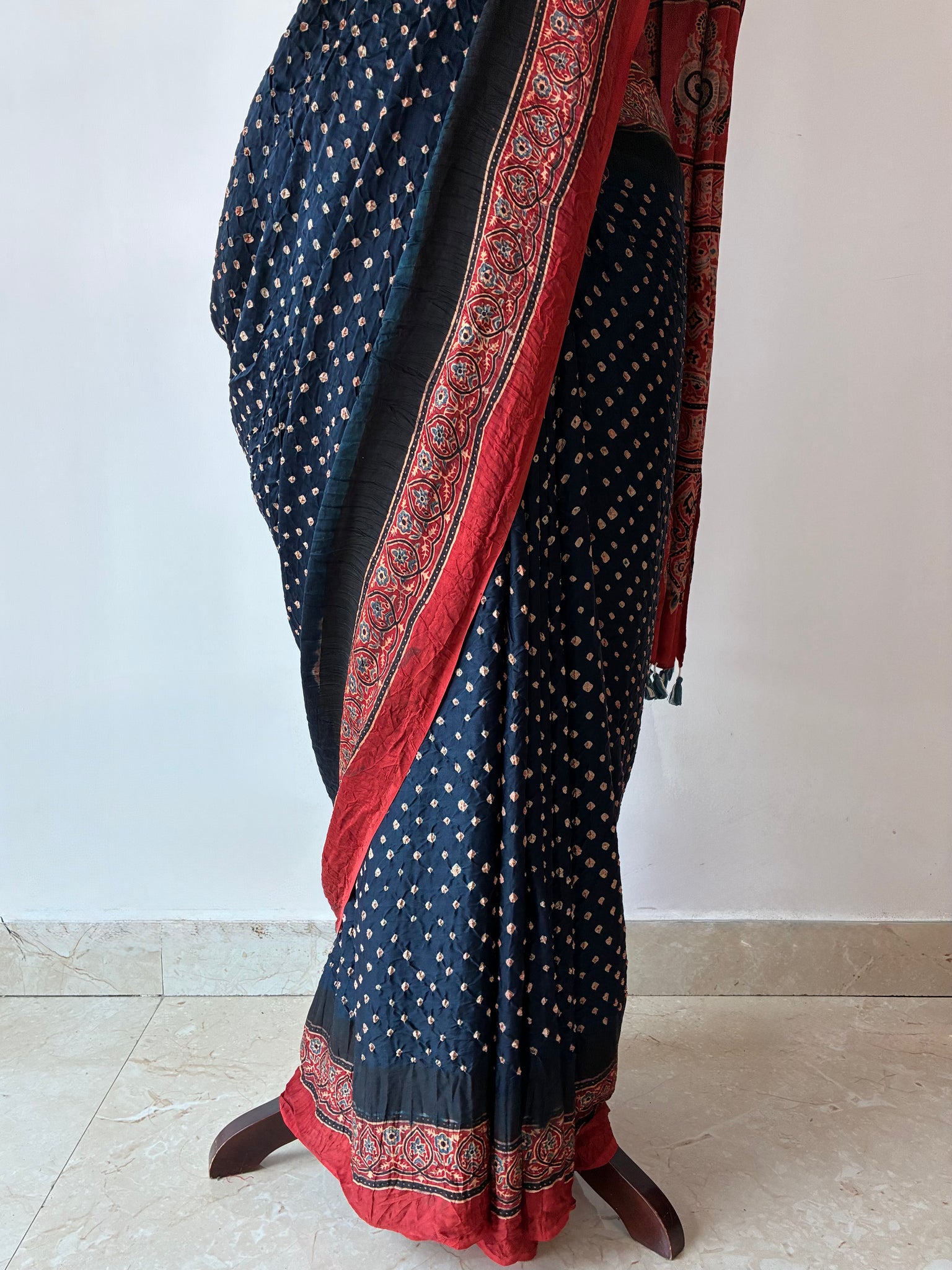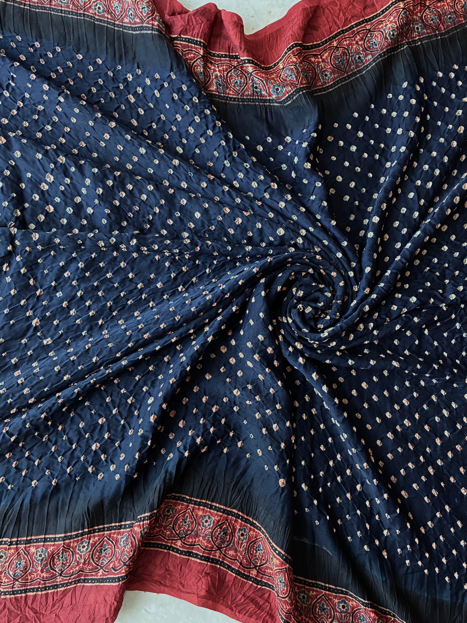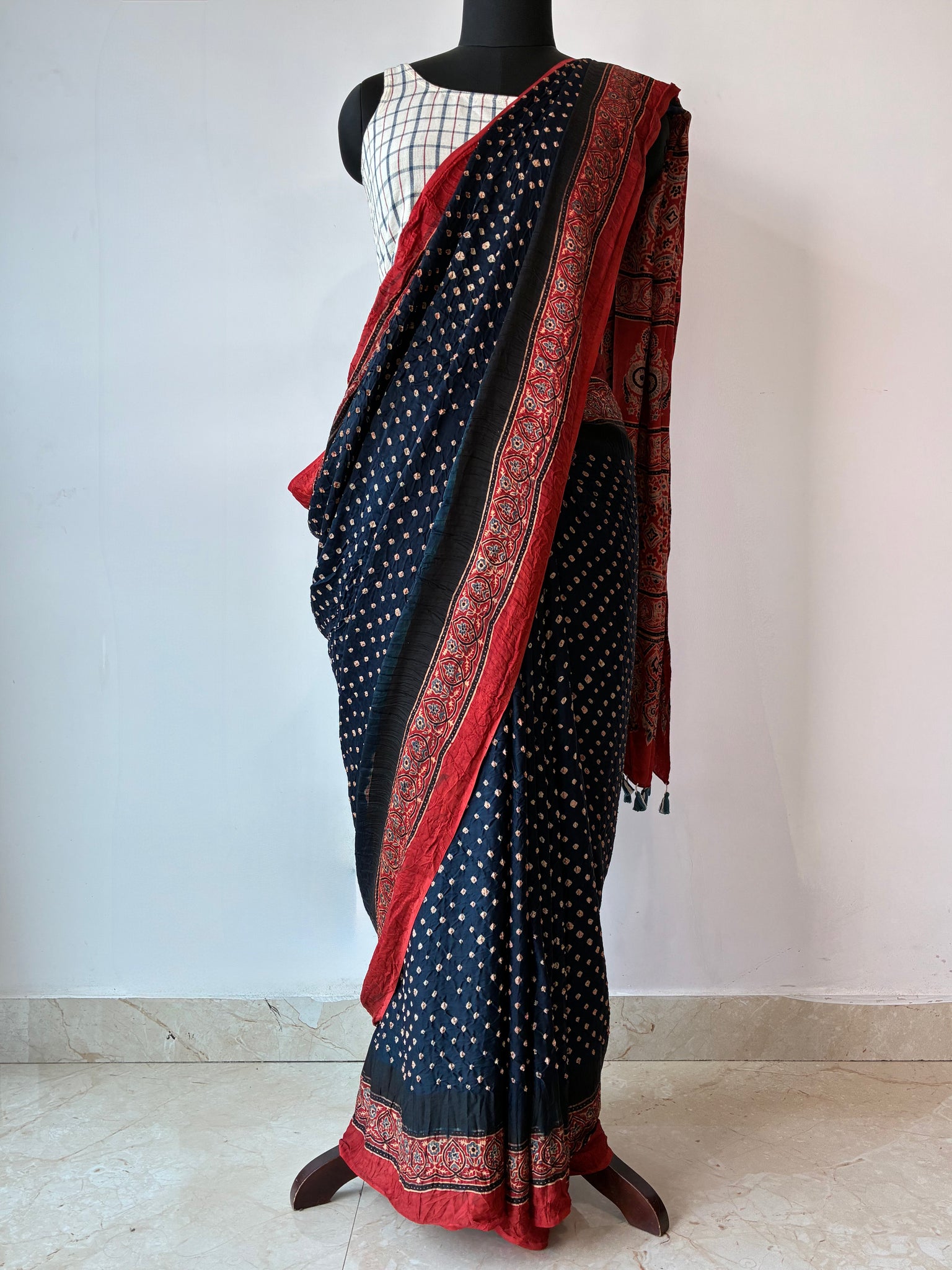 Ajrakh Bandhani, modal silk saree with matching blouse piece.