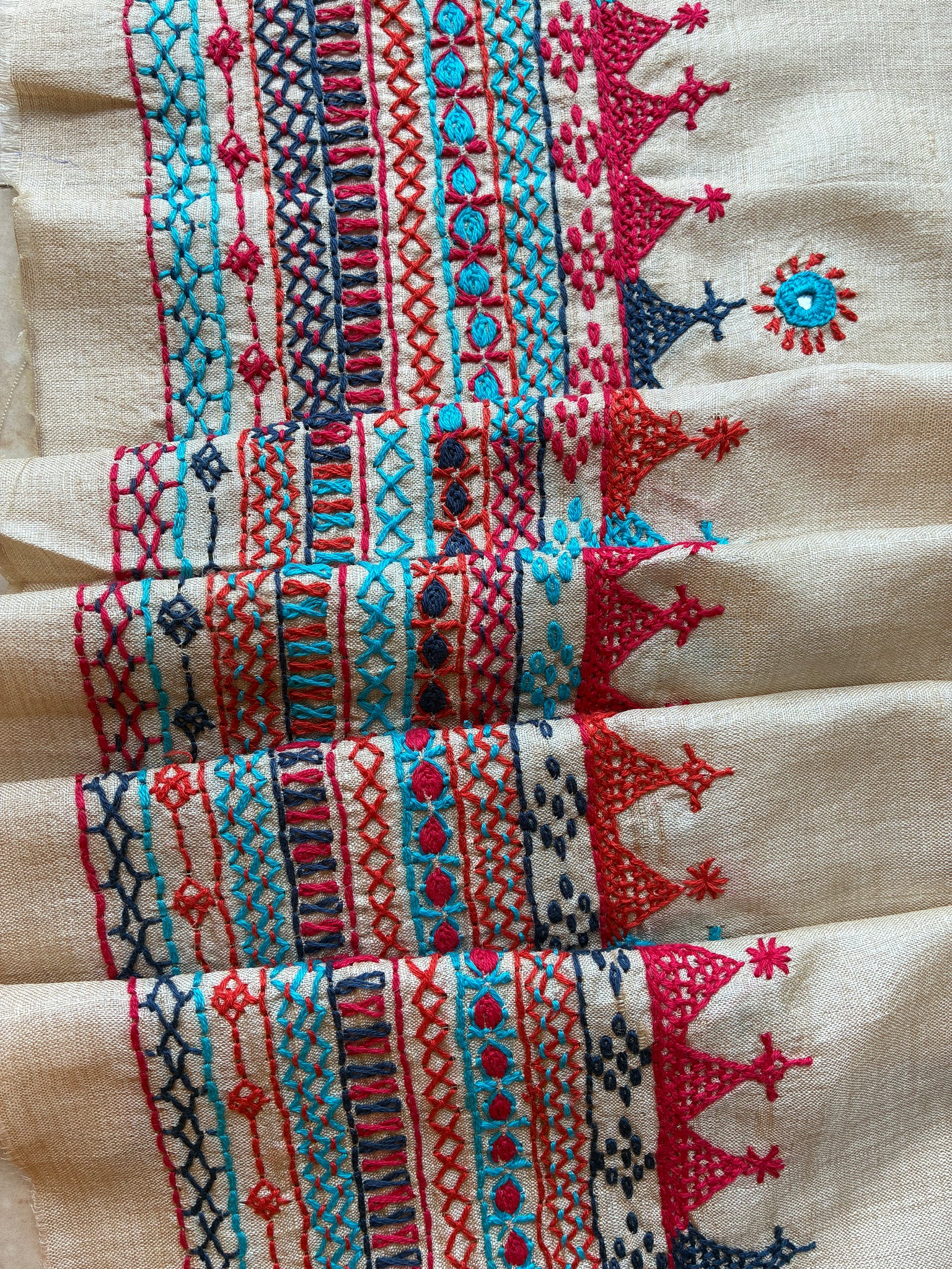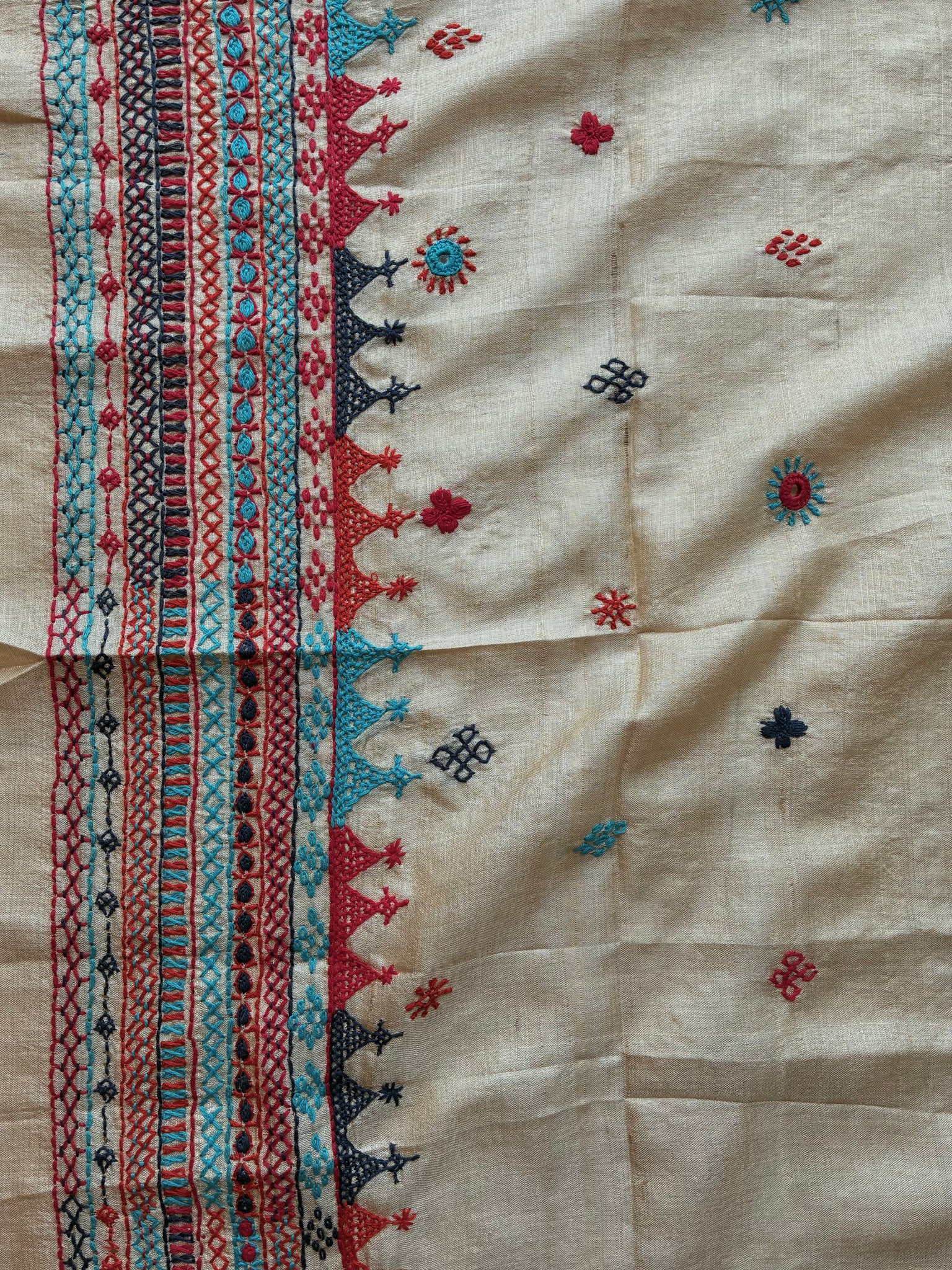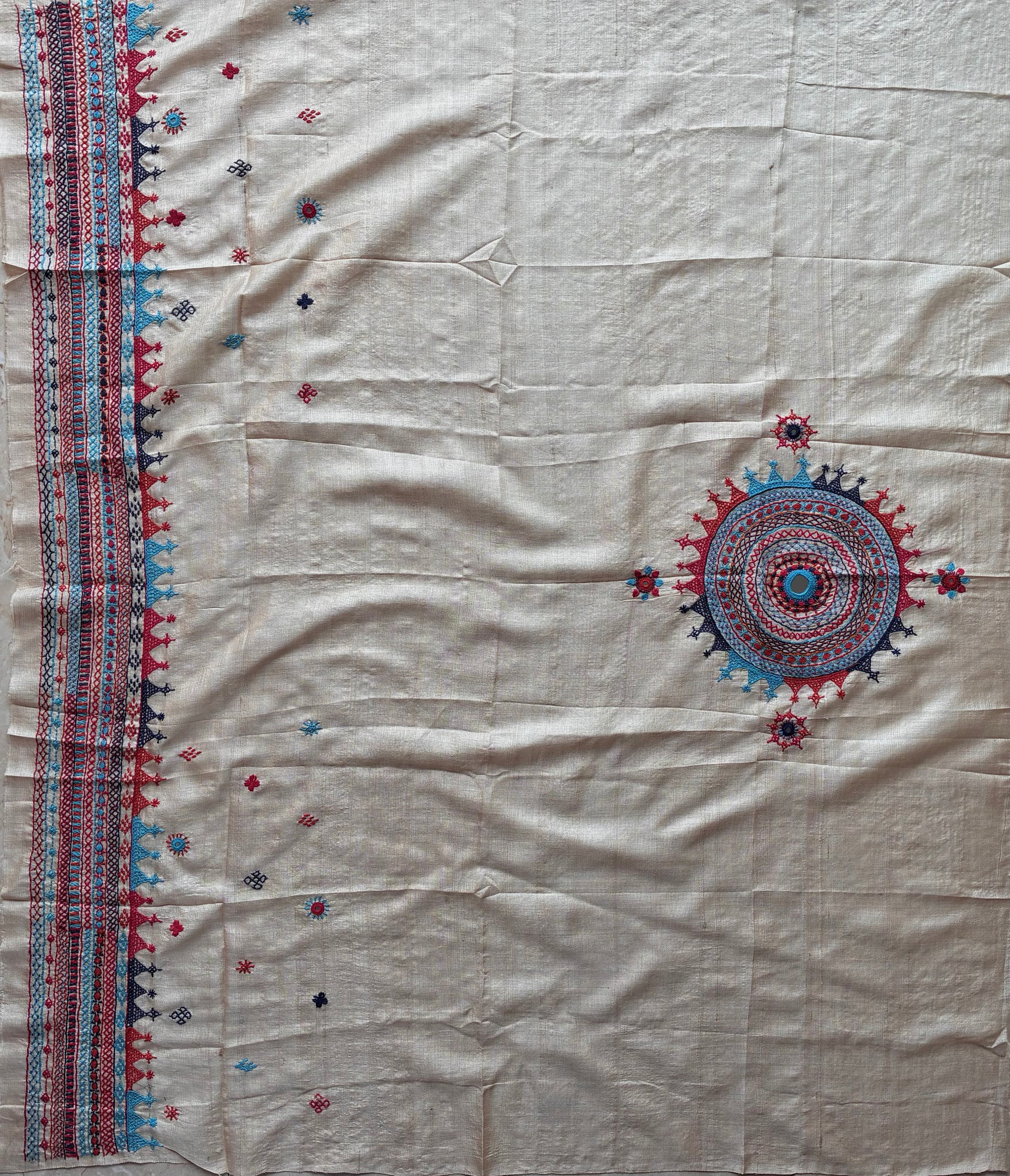 This mandala design Lambani tussar blouse piece has a detailed handwoven border that can be used on the sleeves and back of the blouse. The sleeves have butees all over them. The base fabric is pure handwoven unbleached tussar silk made in the Vidarbha region of Maharashtra.