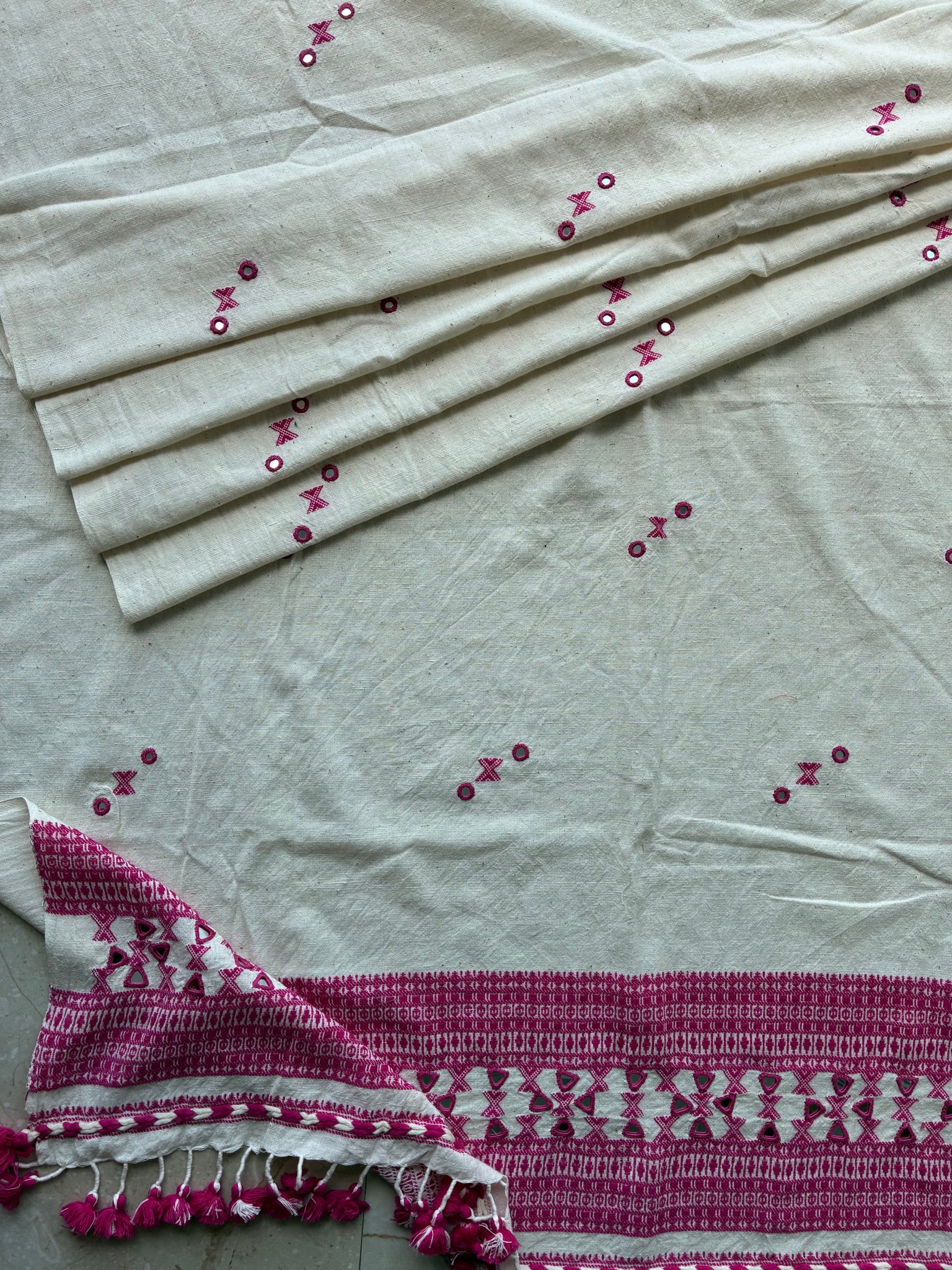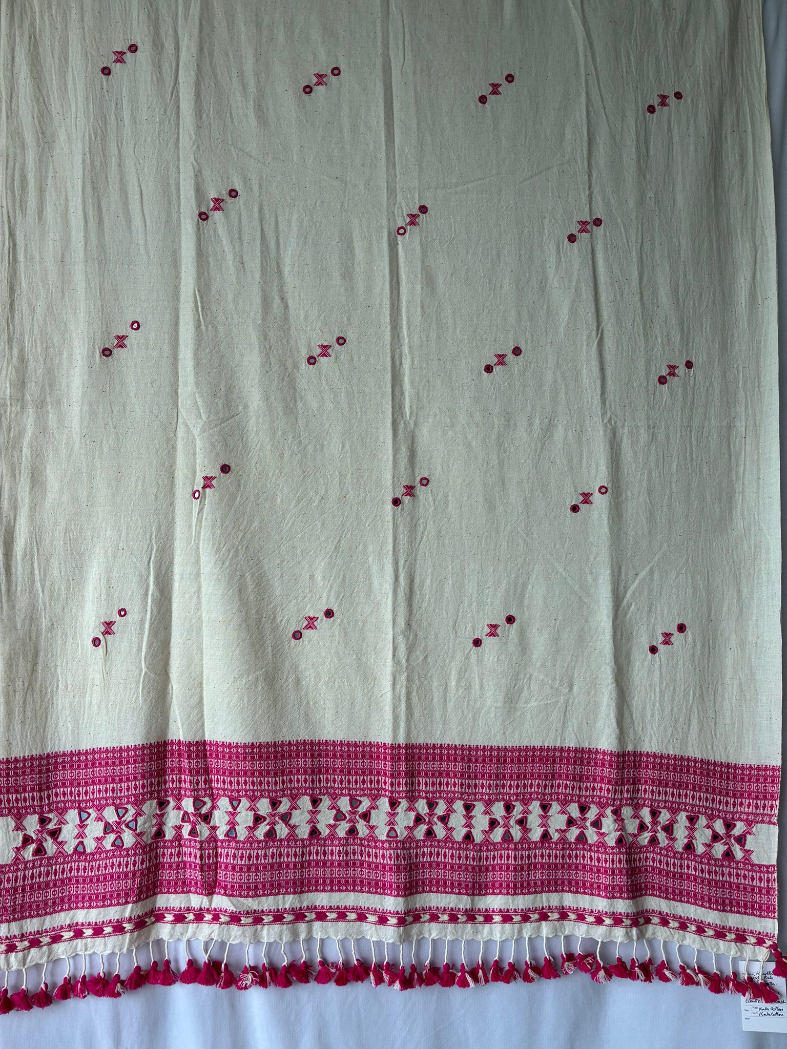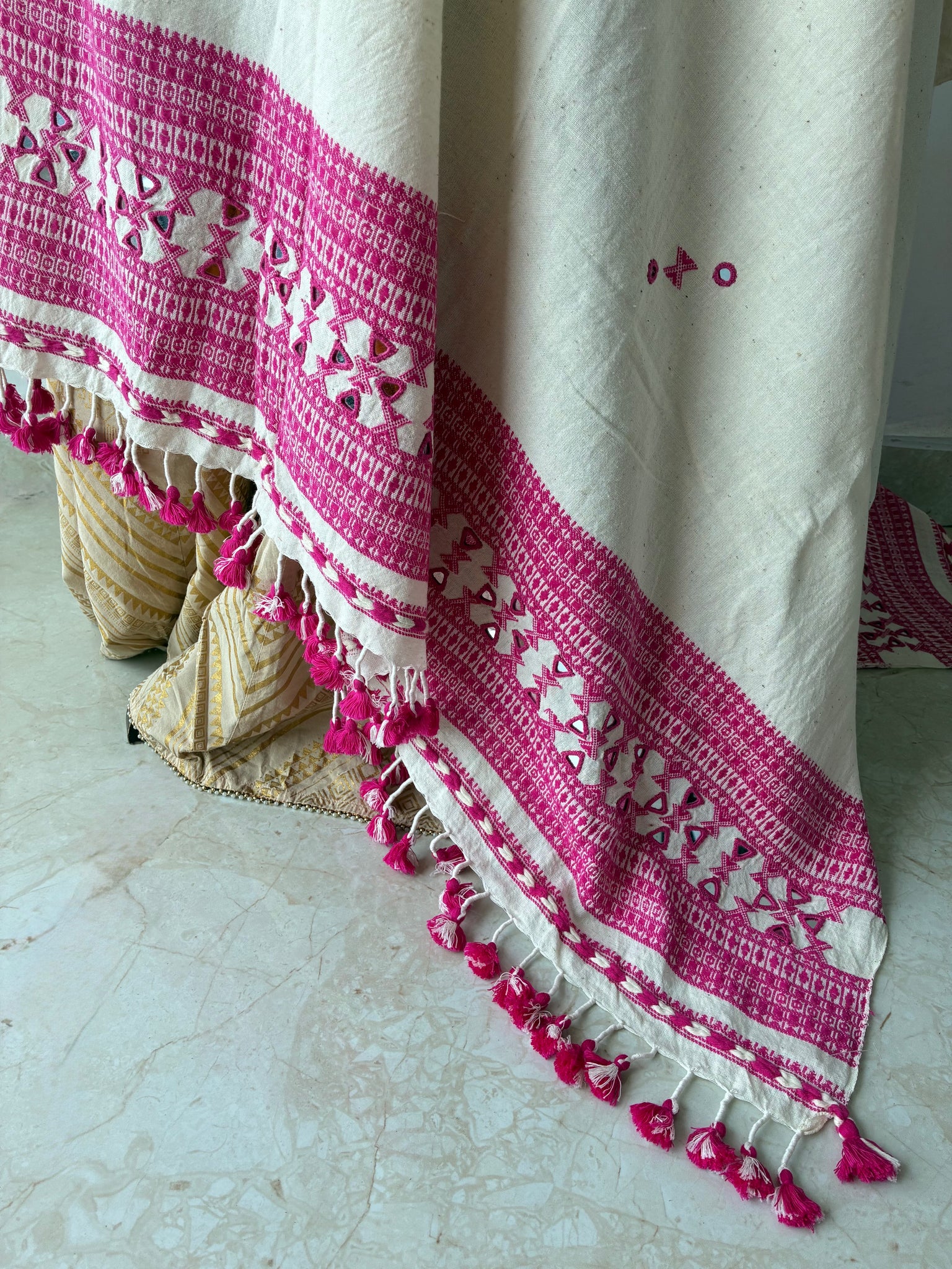 Colours: kora base with bright pink extra weft motifs weaving, mirrors, tassels and butees.