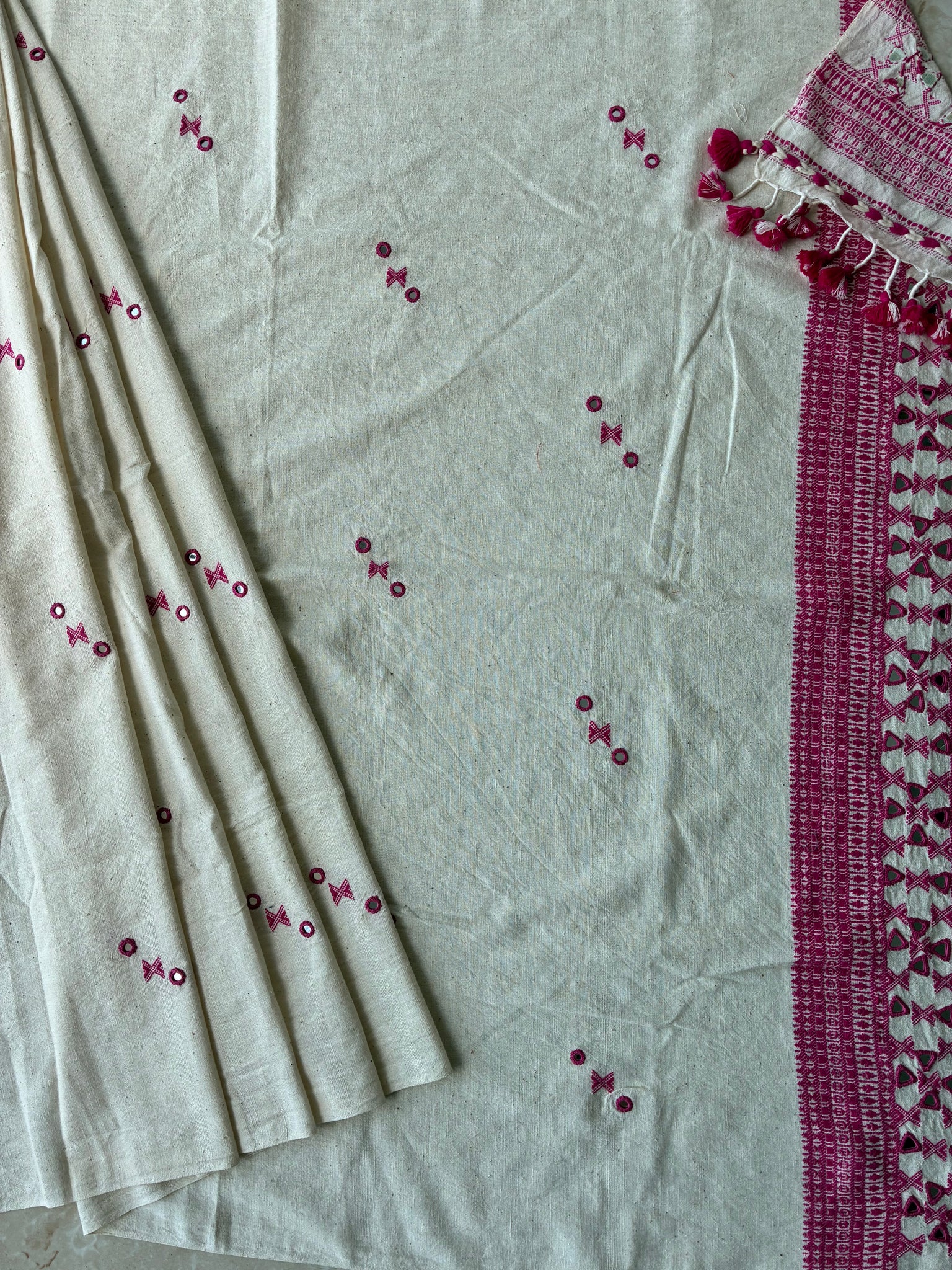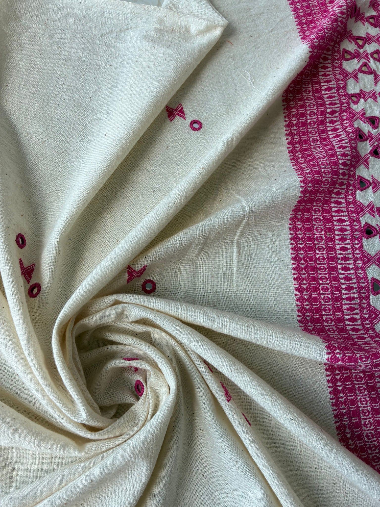 This gorgeous dupatta has handwoven butees and tassels added to the body while weaving and mirrors embroidered onto it after the weaving is complete. The yarn used to weave this dupatta is pure organic Kala cotton which is made from the indigenous cotton crop of the kutch and is a pesticide free, rain-fed, organic cotton.