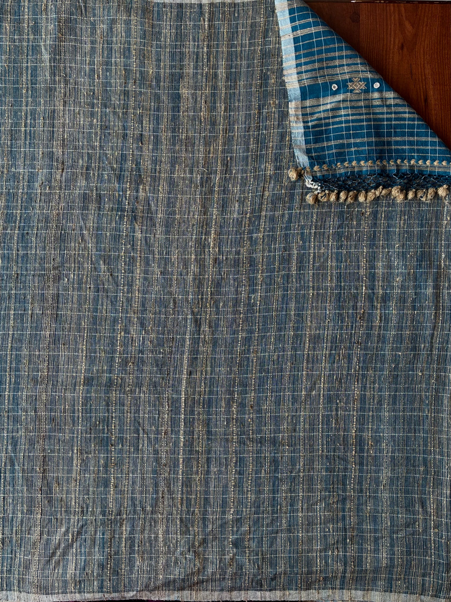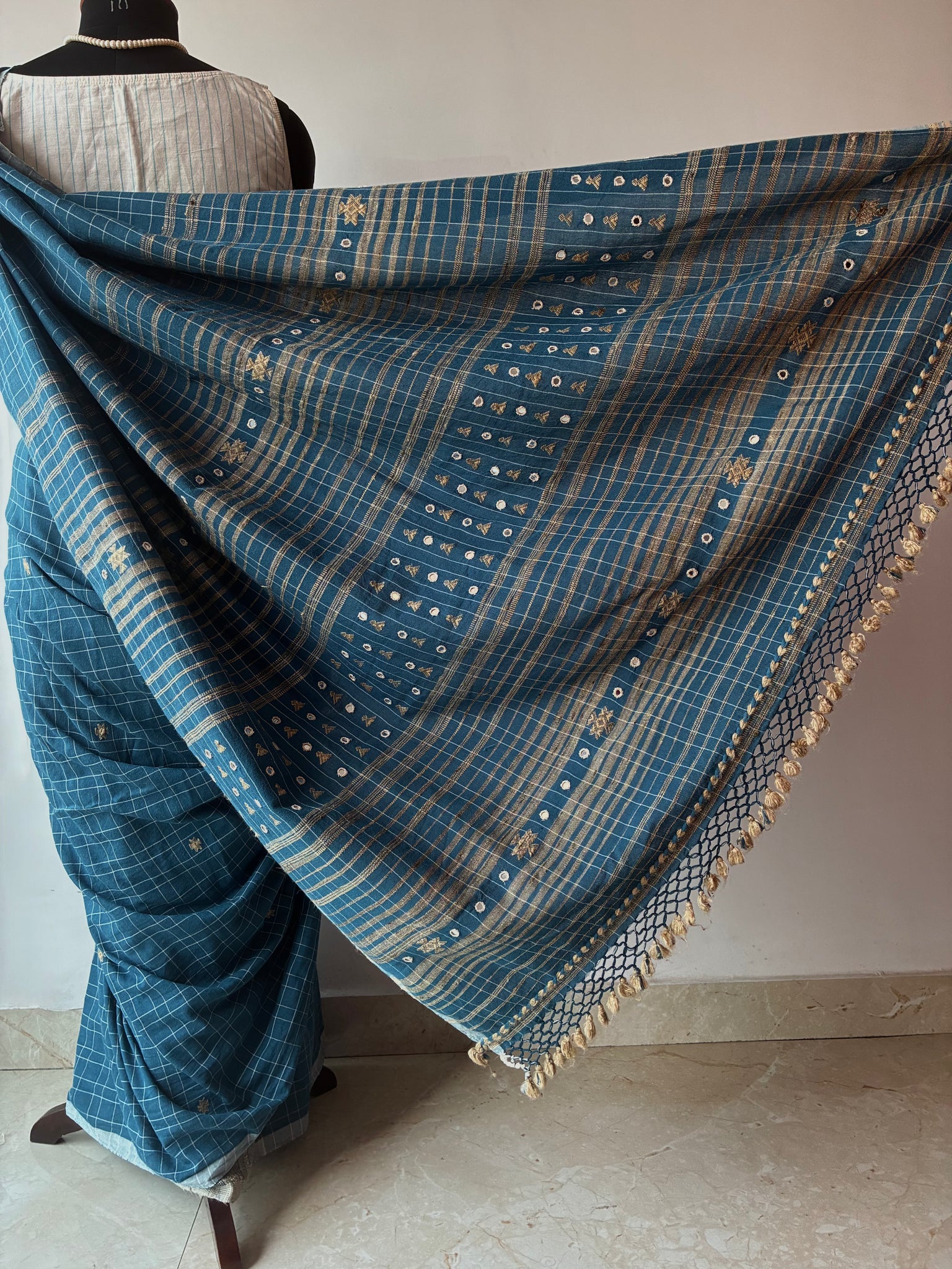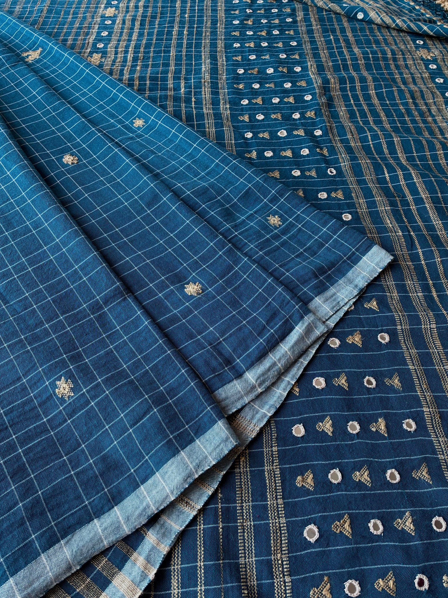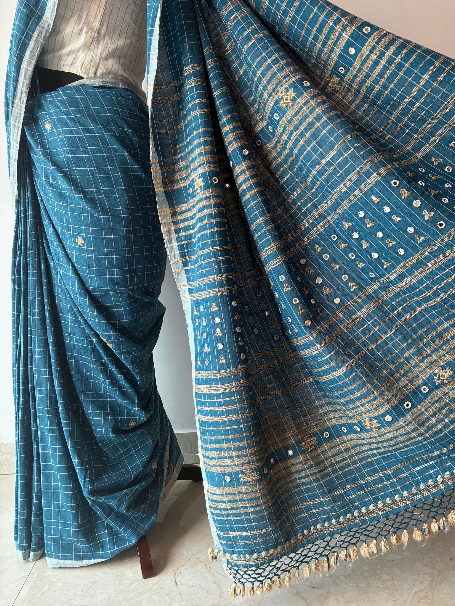 Cerulean checks Bhujodi Kala Cotton saree with hand embroidered mirrors on the palla. The palla (1 meter long with tassels) has extra-weft work and peacock motifs made using tussar silk on it. The blouse is made with tussar ghicha and Kala cotton yarn.  The last picture is of the blouse piece)