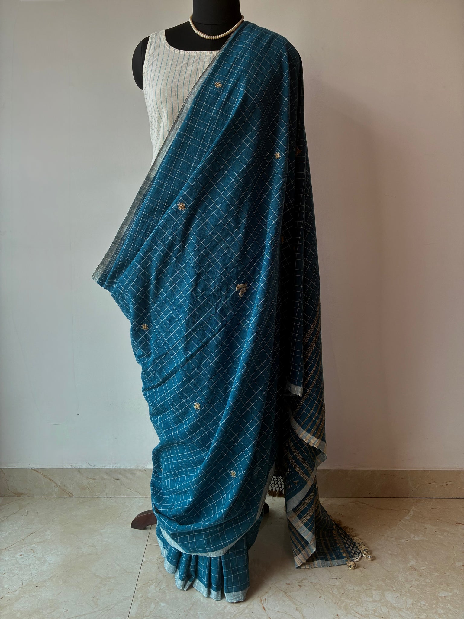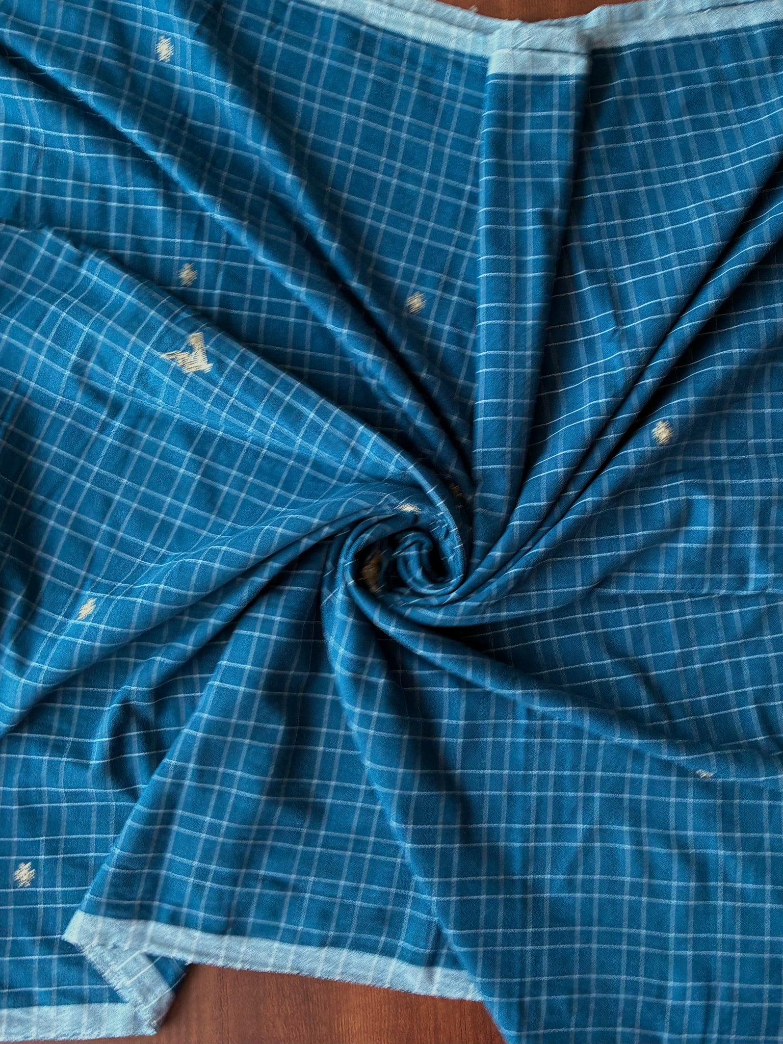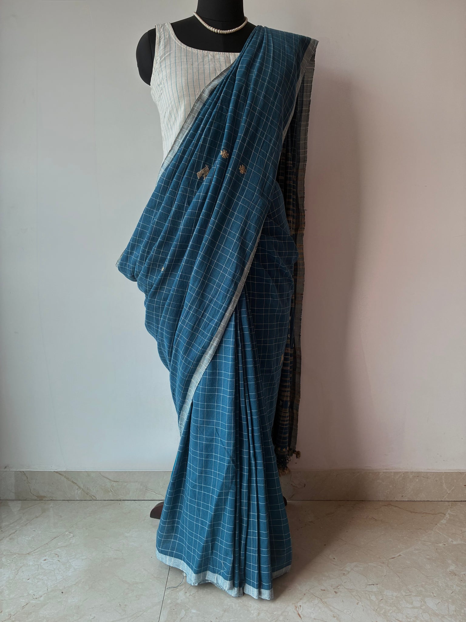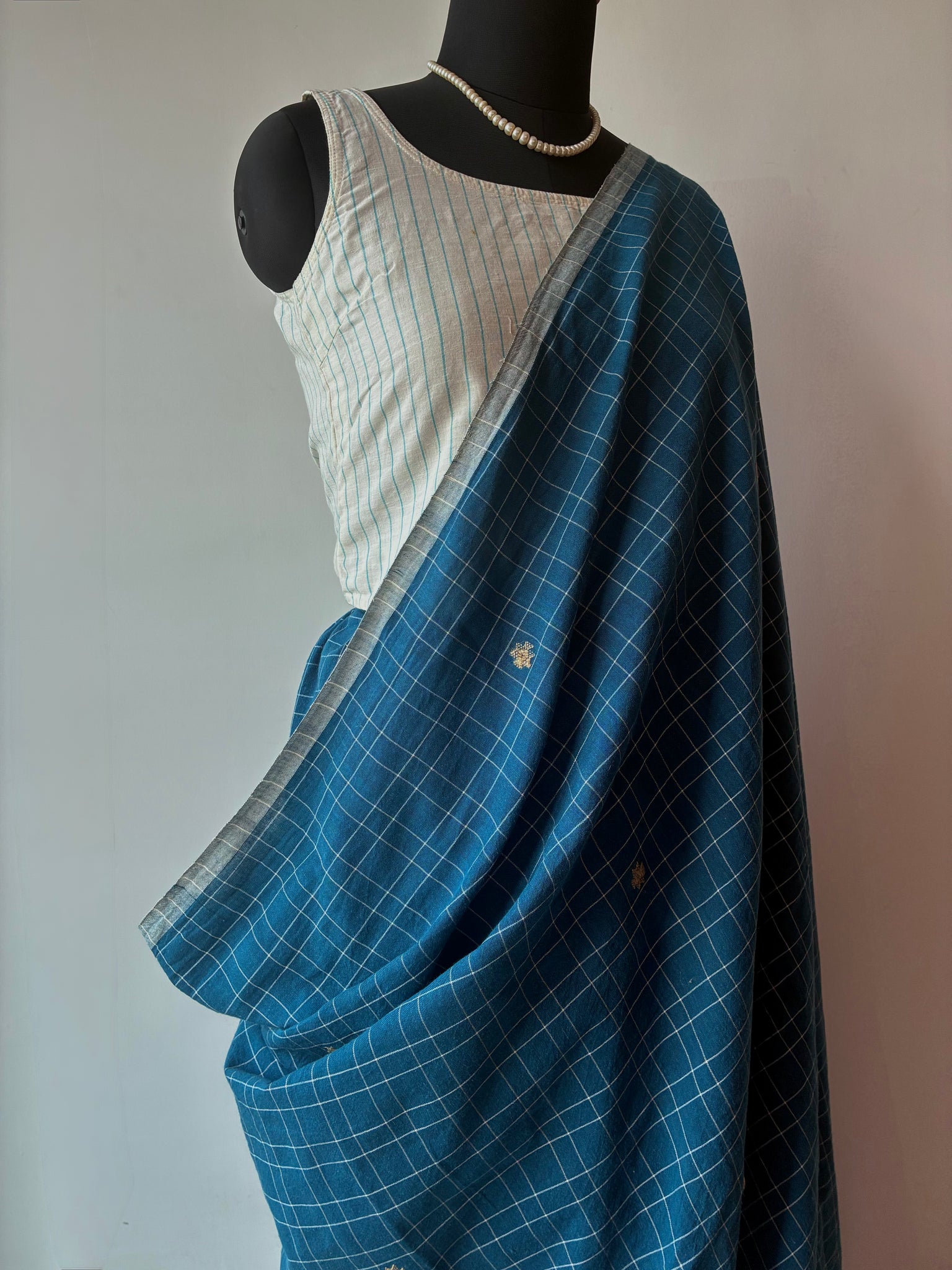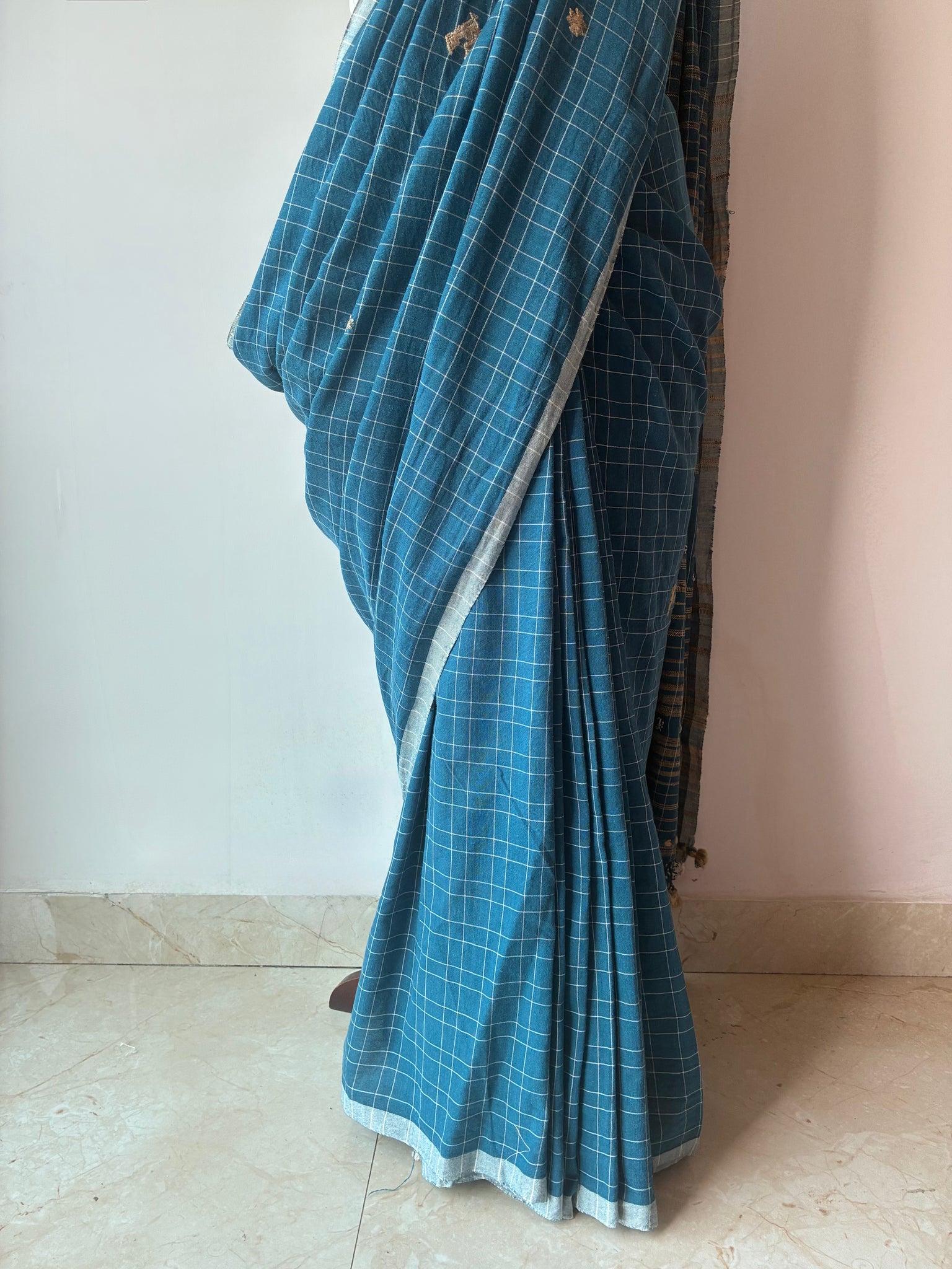 Cerulean checks Bhujodi Kala Cotton saree with hand embroidered mirrors on the palla. The palla (1 meter long with tassels) has extra-weft work and peacock motifs made using tussar silk on it. The blouse is made with tussar ghicha and Kala cotton yarn.  The last picture is of the blouse piece)