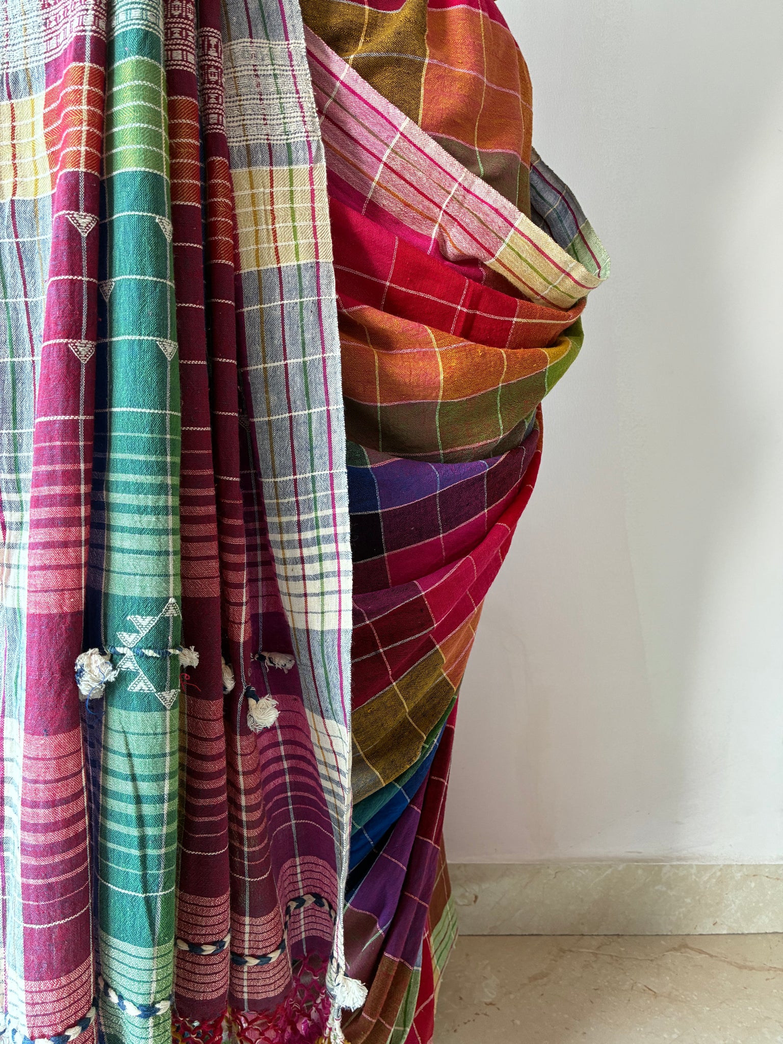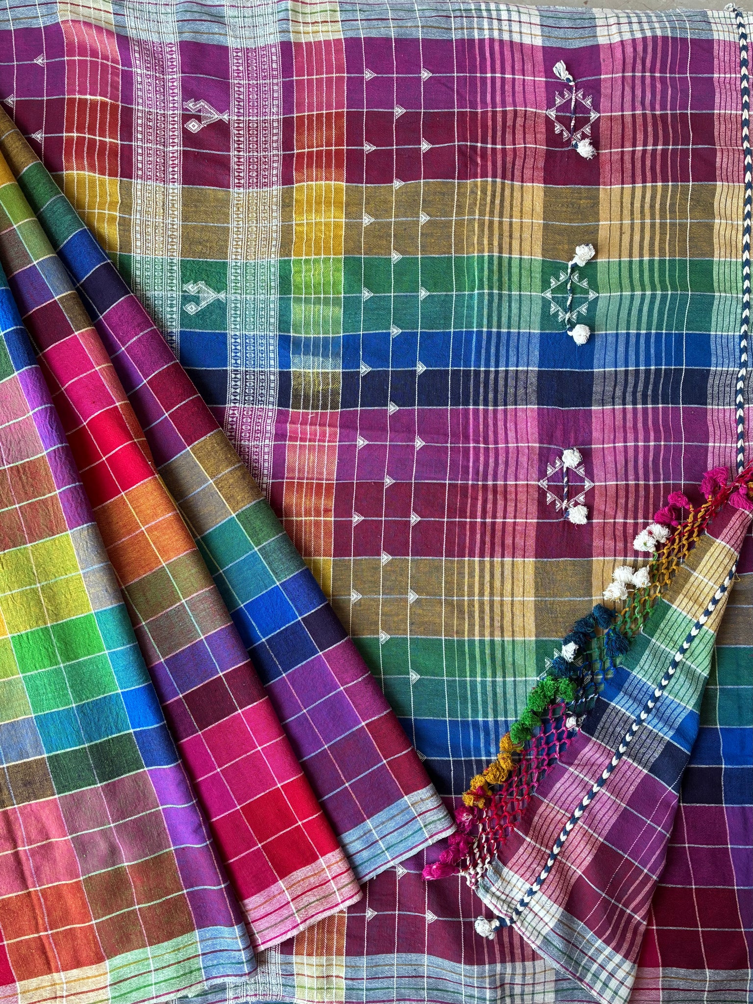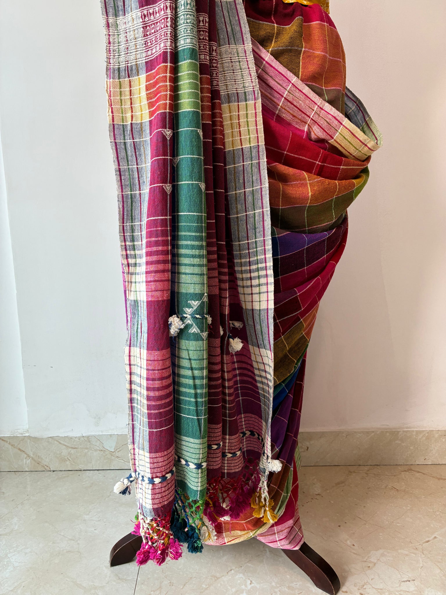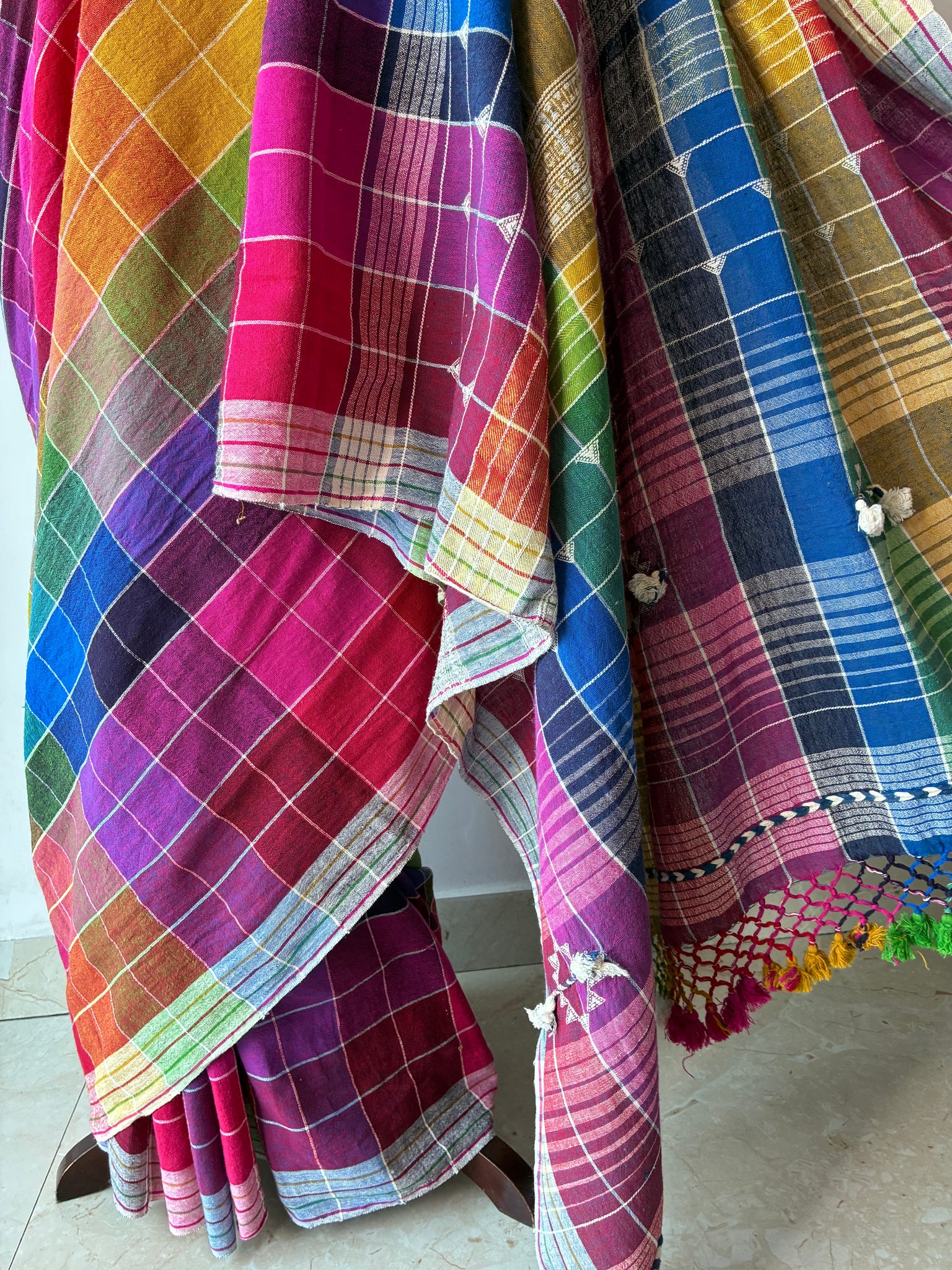 Cerulean checks Bhujodi Kala Cotton saree with hand embroidered mirrors on the palla. The palla (1 meter long with tassels) has extra-weft work and peacock motifs made using tussar silk on it. The blouse is made with tussar ghicha and Kala cotton yarn. The last picture is of the blouse piece)