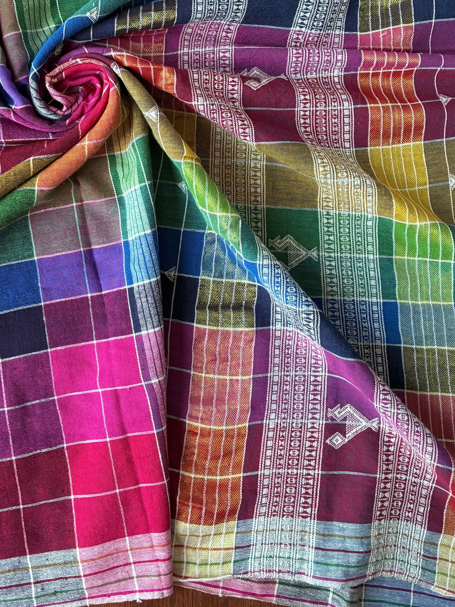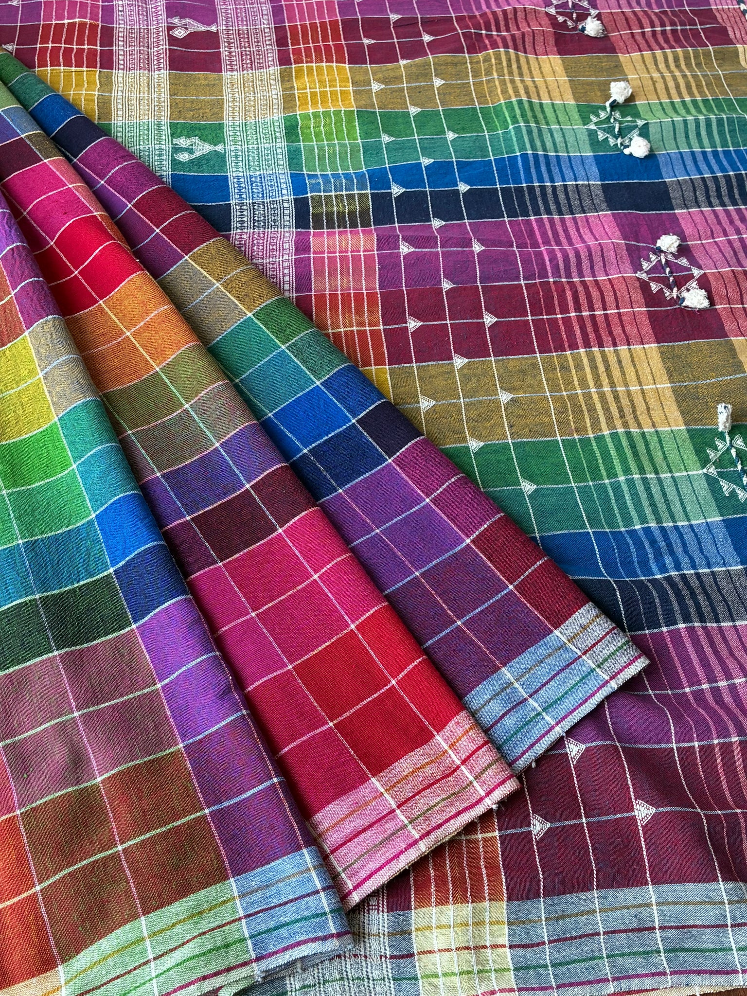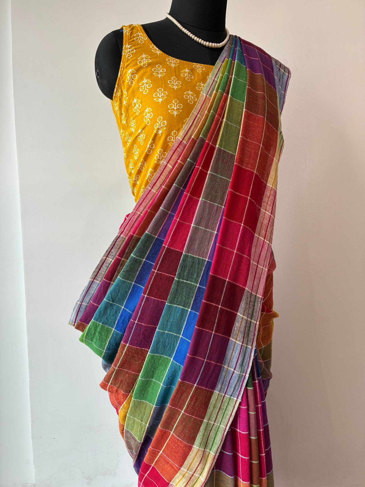 Cerulean checks Bhujodi Kala Cotton saree with hand embroidered mirrors on the palla. The palla (1 meter long with tassels) has extra-weft work and peacock motifs made using tussar silk on it. The blouse is made with tussar ghicha and Kala cotton yarn. The last picture is of the blouse piece)