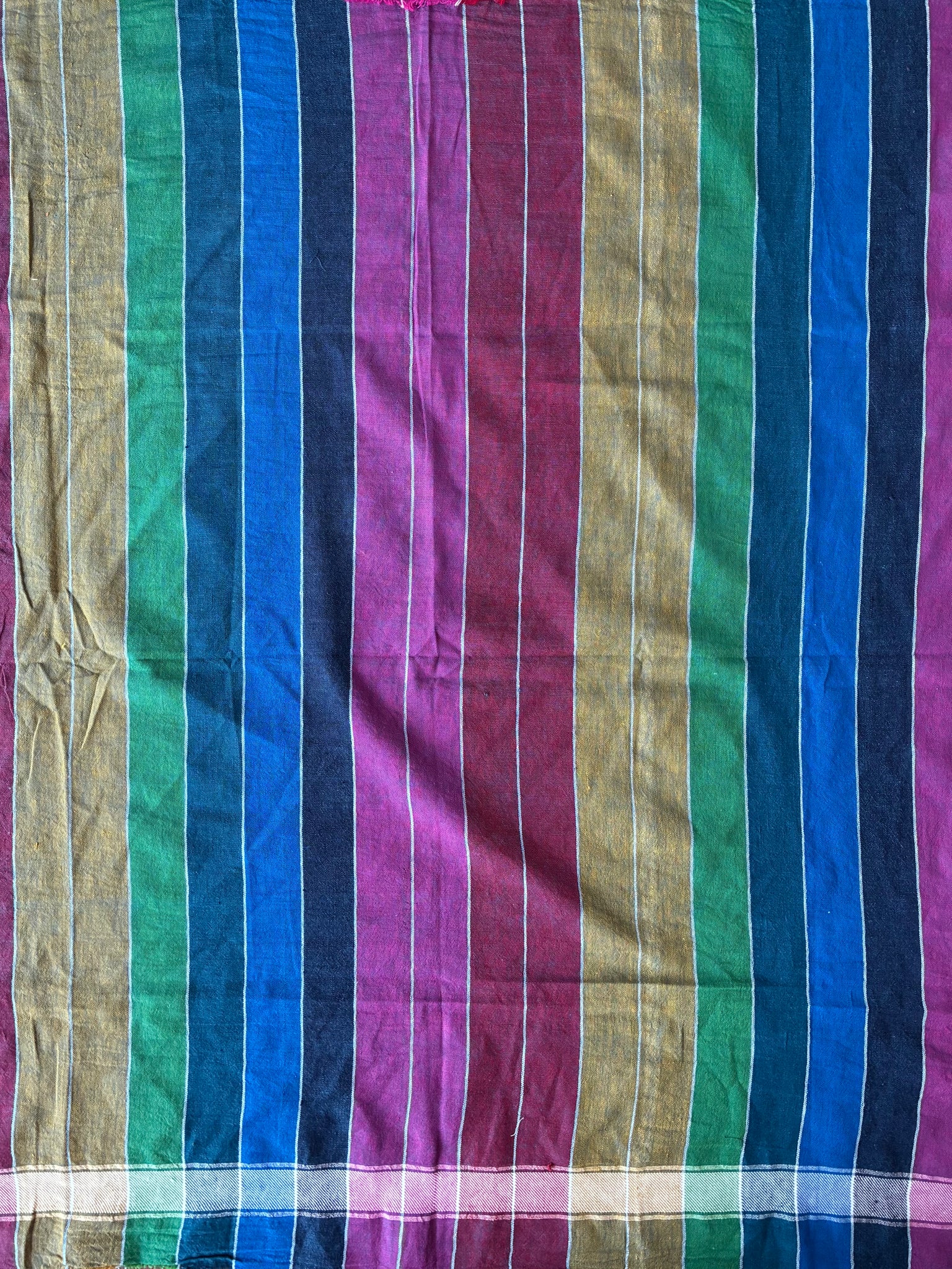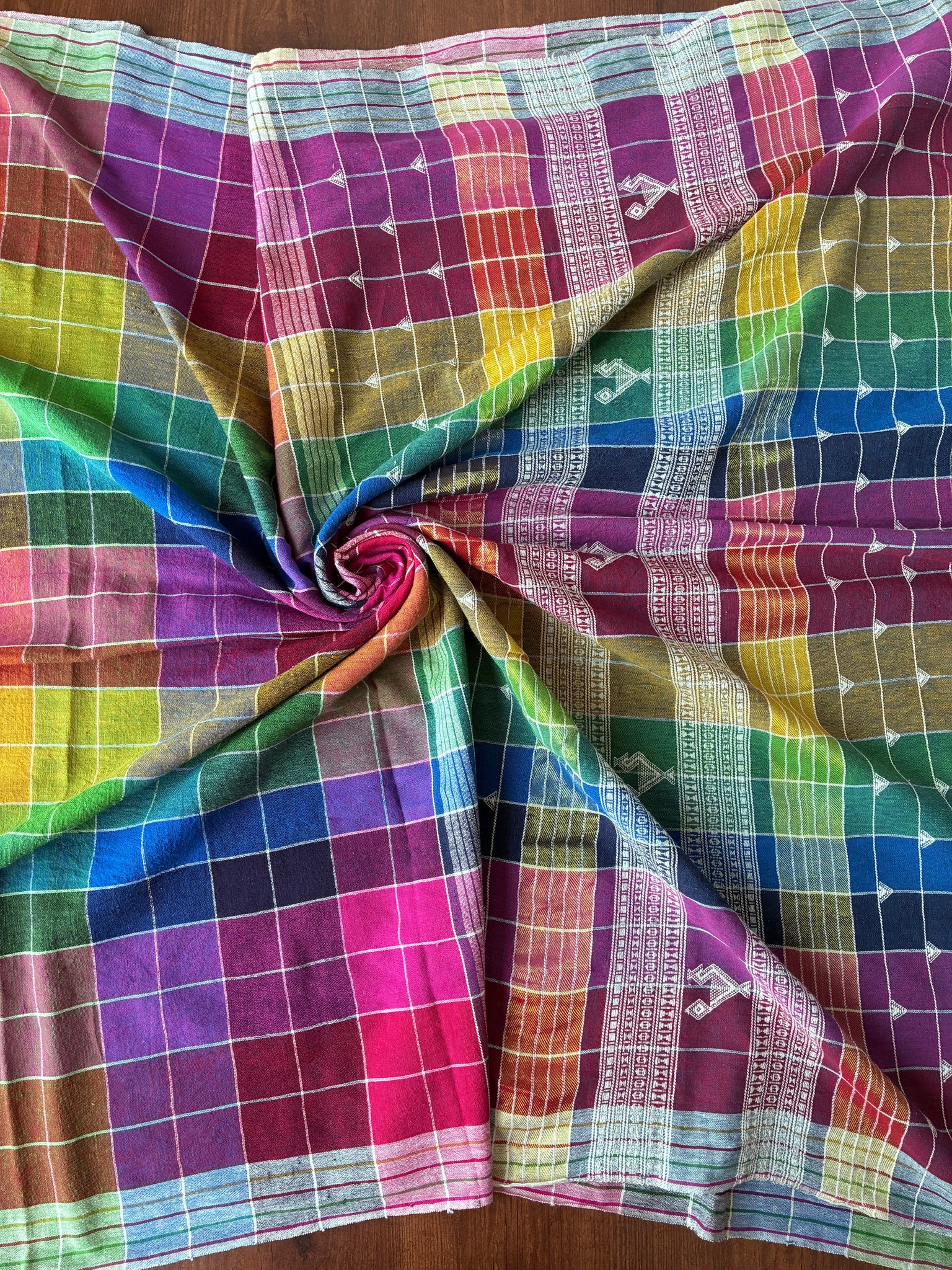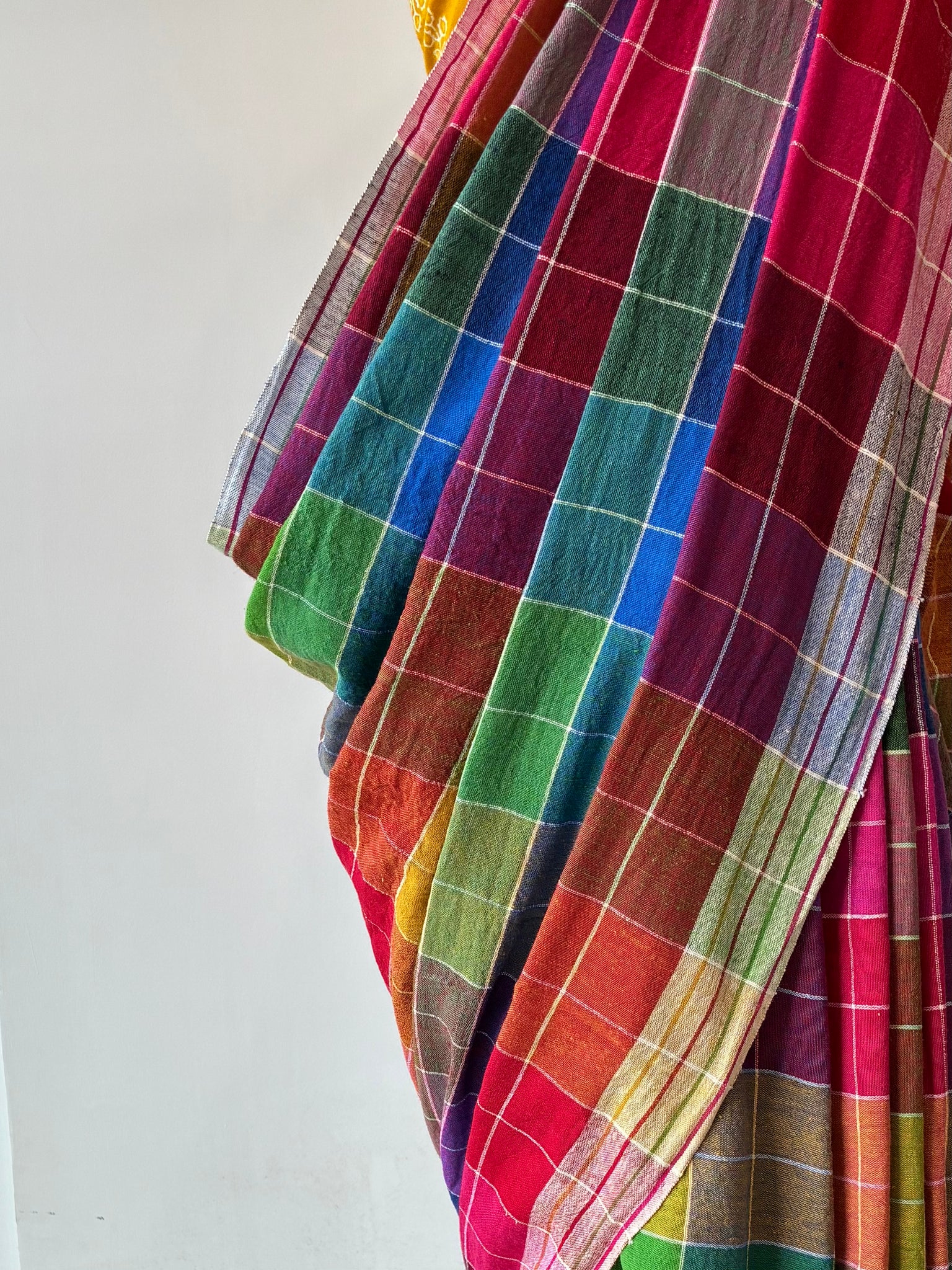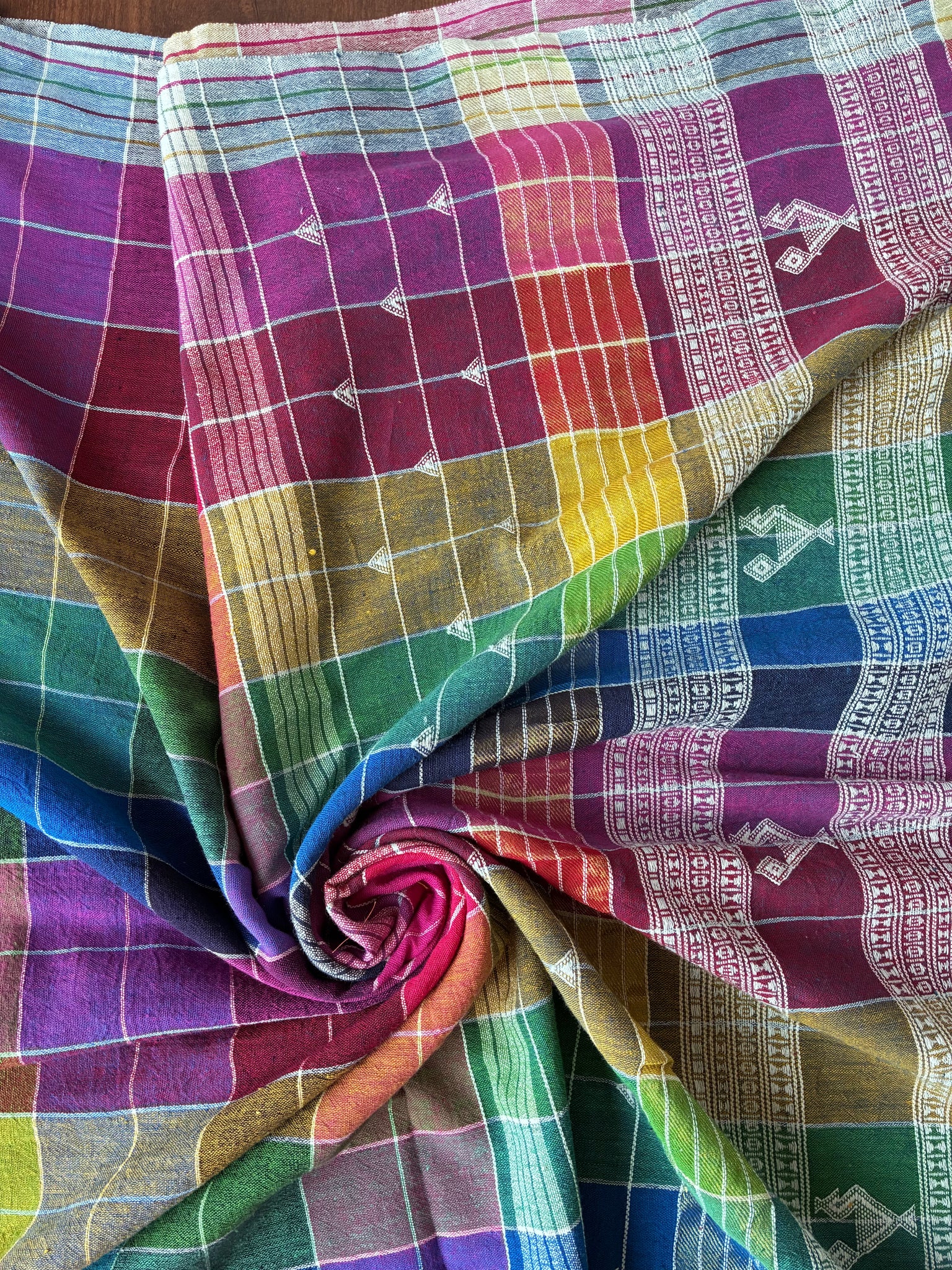 Cerulean checks Bhujodi Kala Cotton saree with hand embroidered mirrors on the palla. The palla (1 meter long with tassels) has extra-weft work and peacock motifs made using tussar silk on it. The blouse is made with tussar ghicha and Kala cotton yarn. The last picture is of the blouse piece)