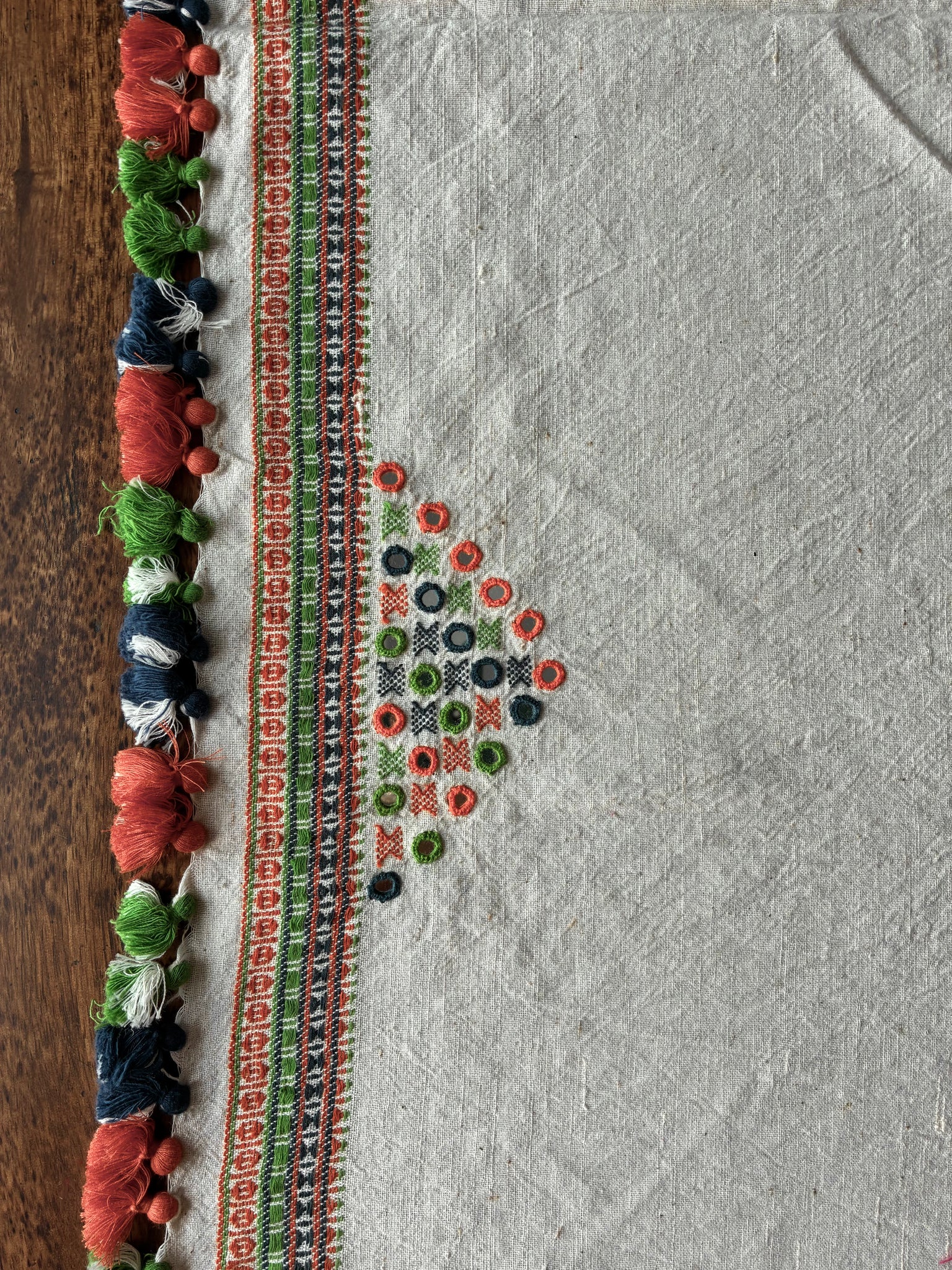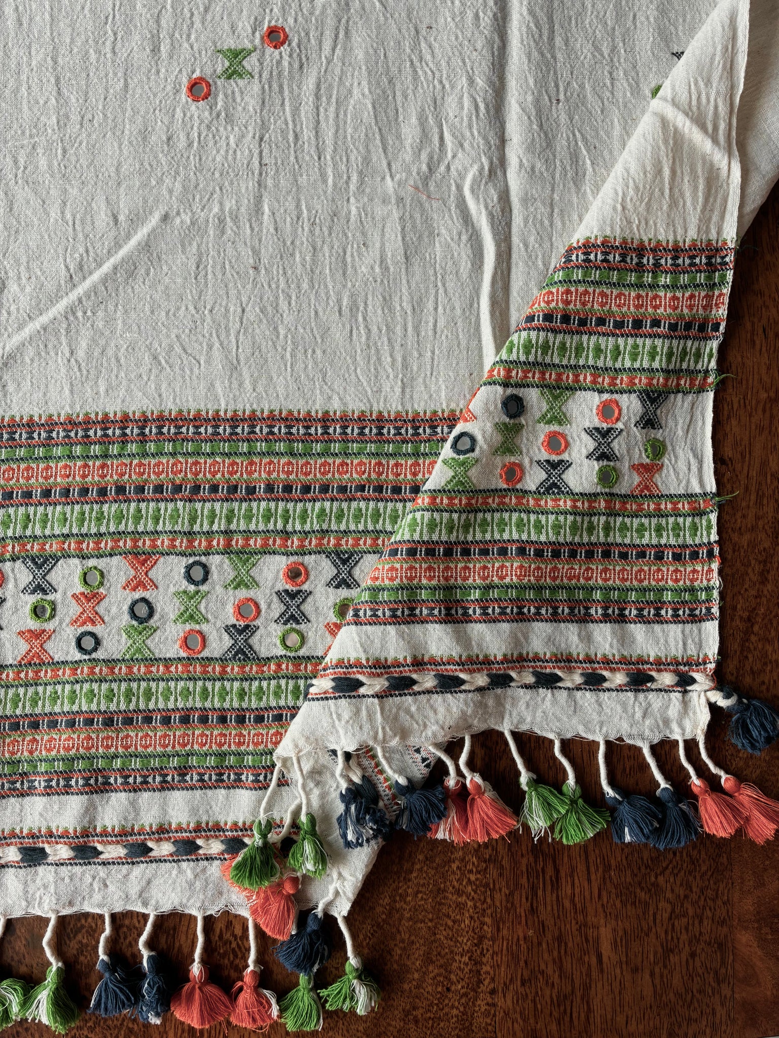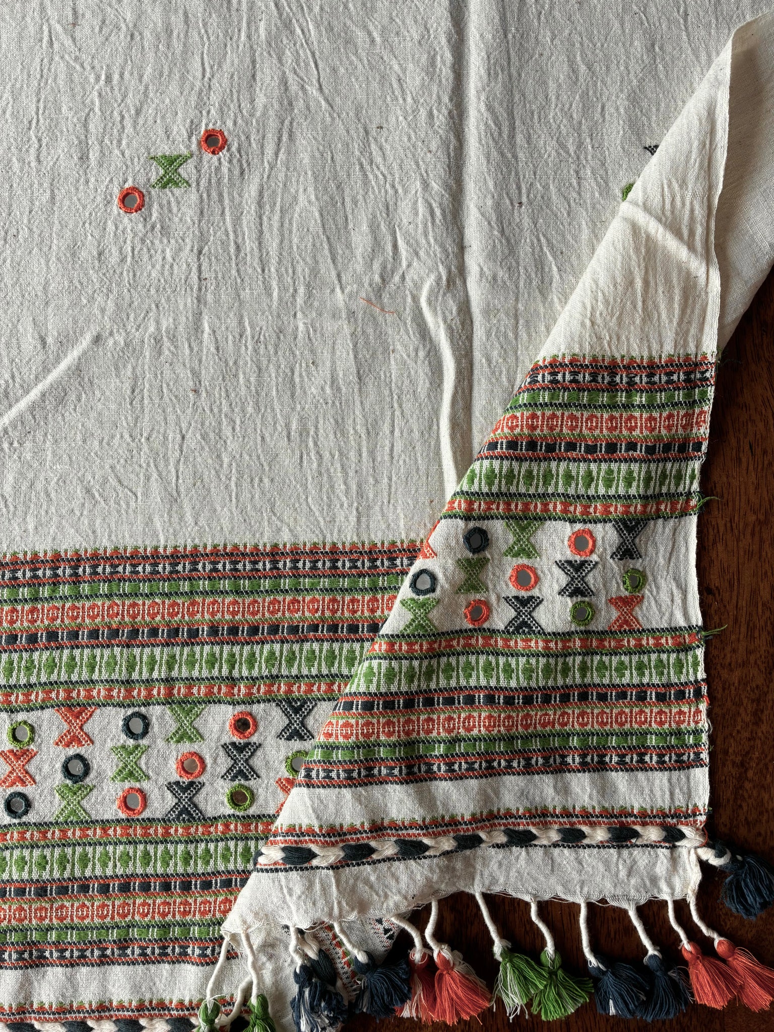 This is a handwoven Bhujodi Kala cotton blouse piece has hand embroidered mirrors on the sleeves and back. There are tassels that can be a part of the back design and smaller tassels for the sleeves. The body has handwoven butees and mirrors all over. The base fabric is thick, pure handloom organic Kala cotton.