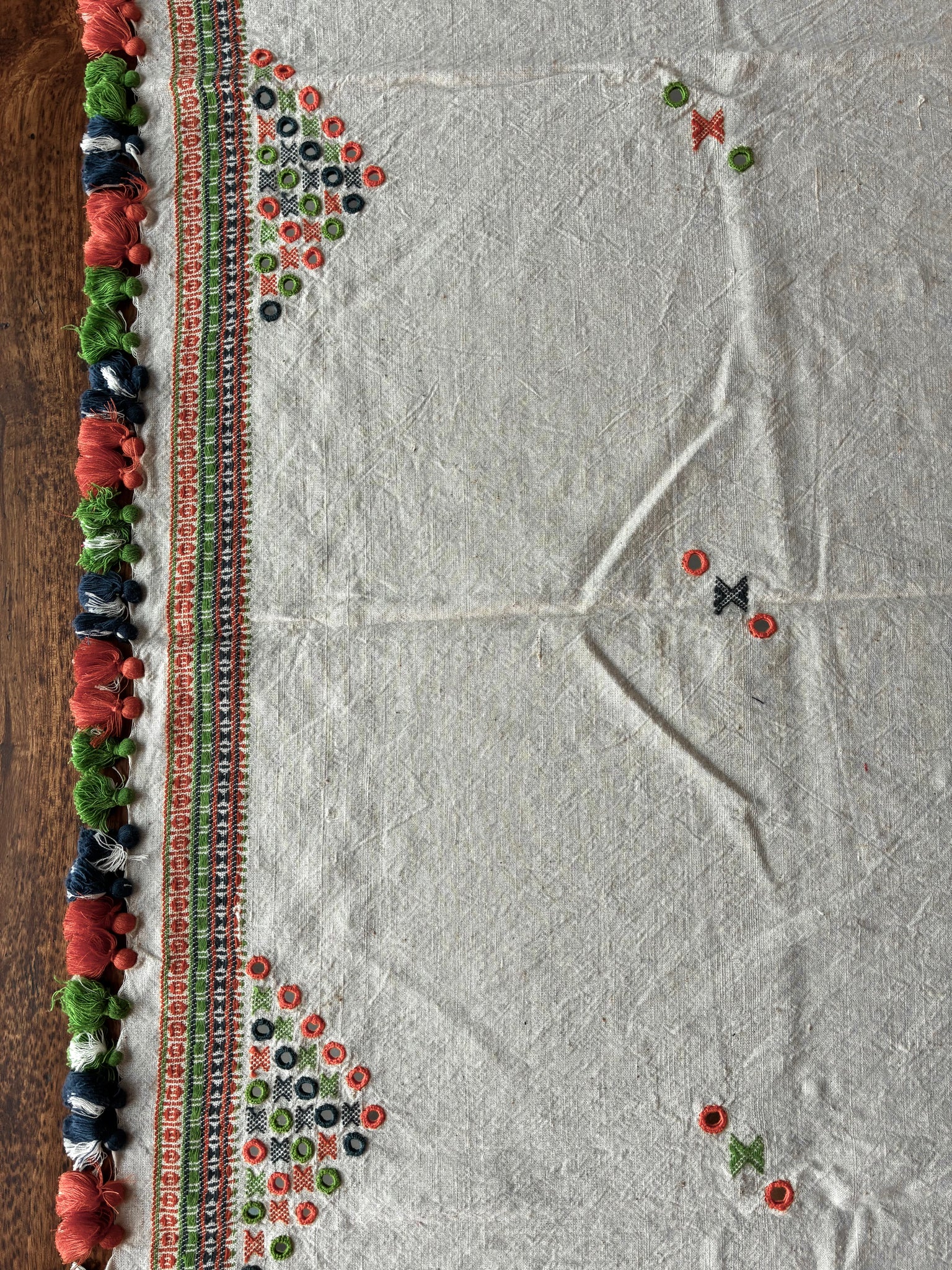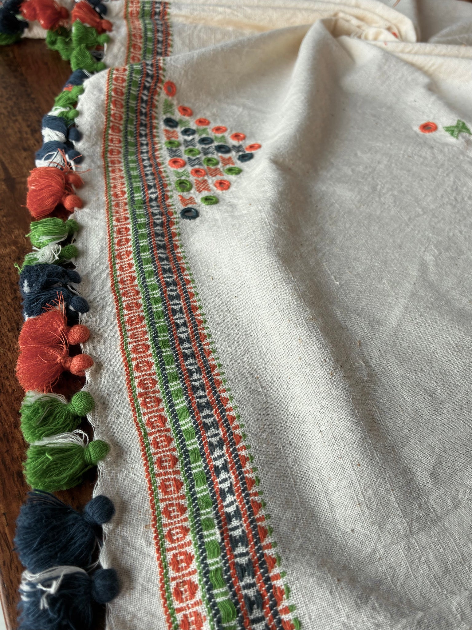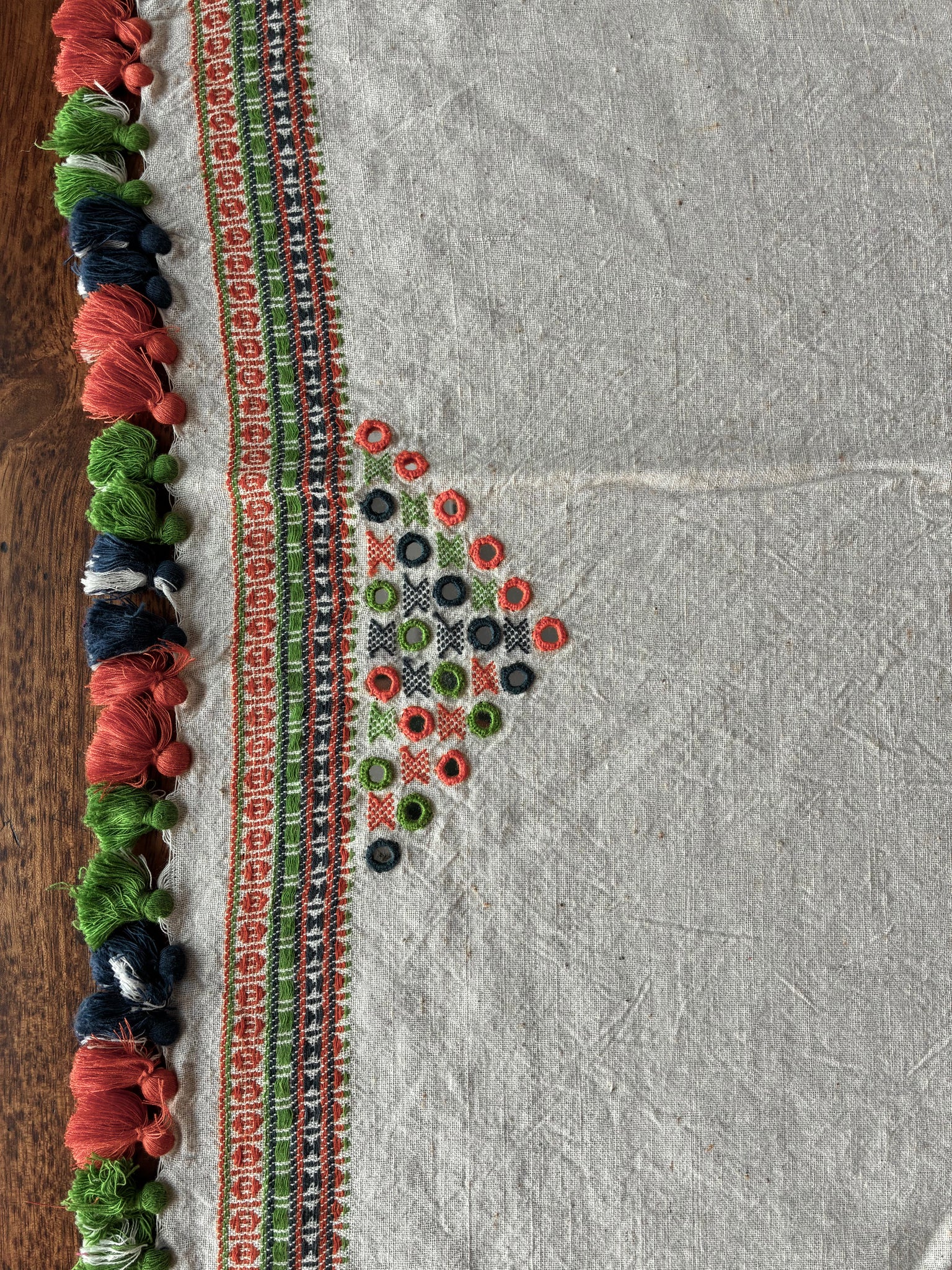 This is a handwoven Bhujodi Kala cotton blouse piece has hand embroidered mirrors on the sleeves and back. There are tassels that can be a part of the back design and smaller tassels for the sleeves. The body has handwoven butees and mirrors all over. The base fabric is thick, pure handloom organic Kala cotton.