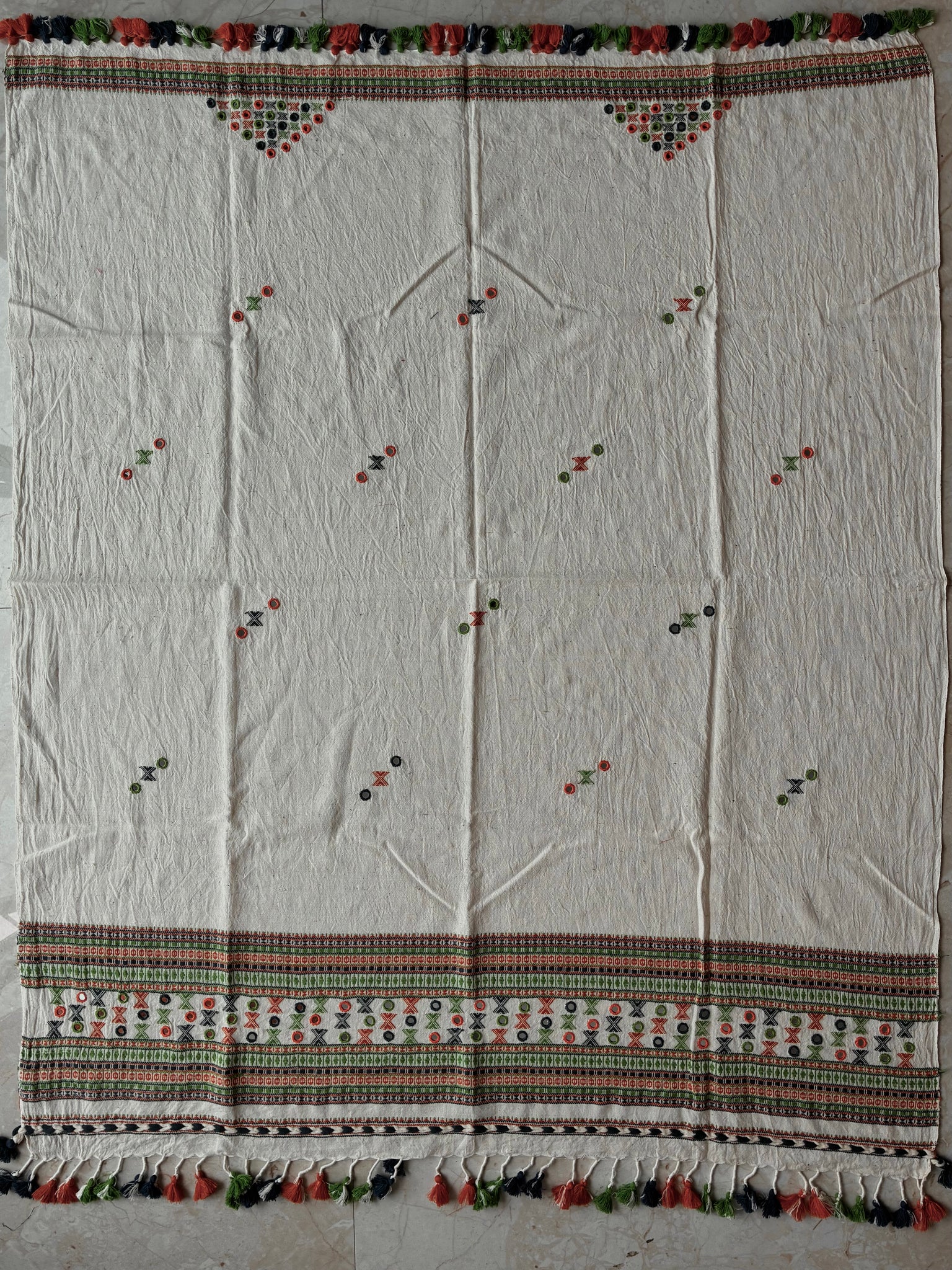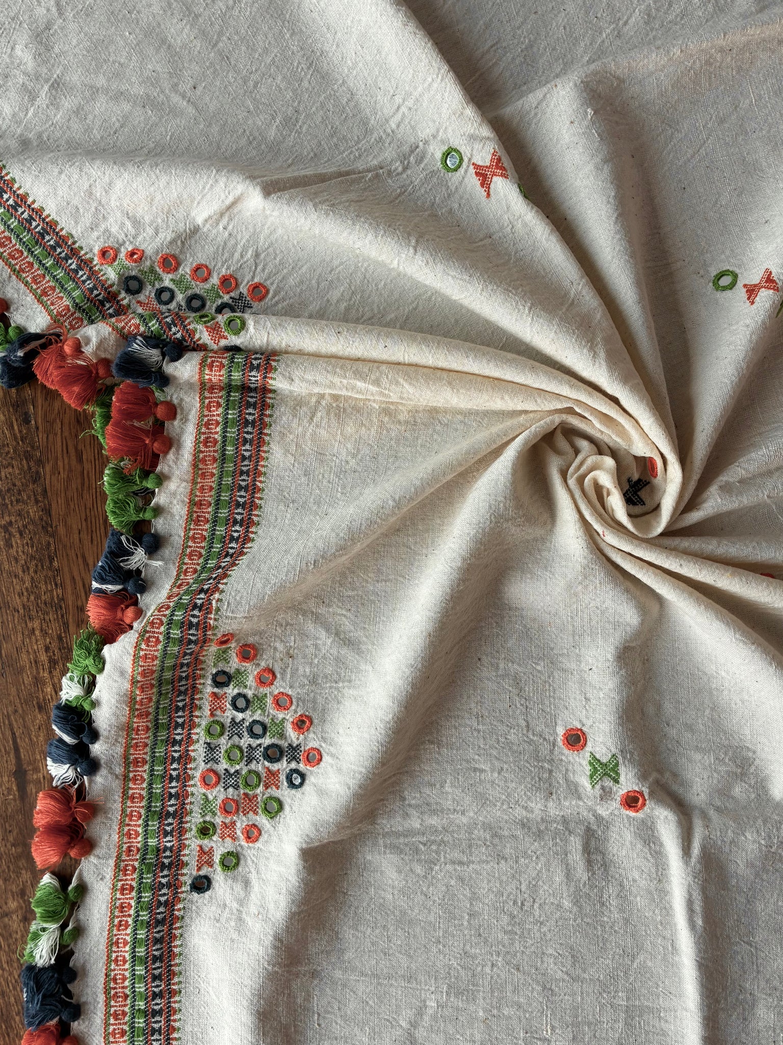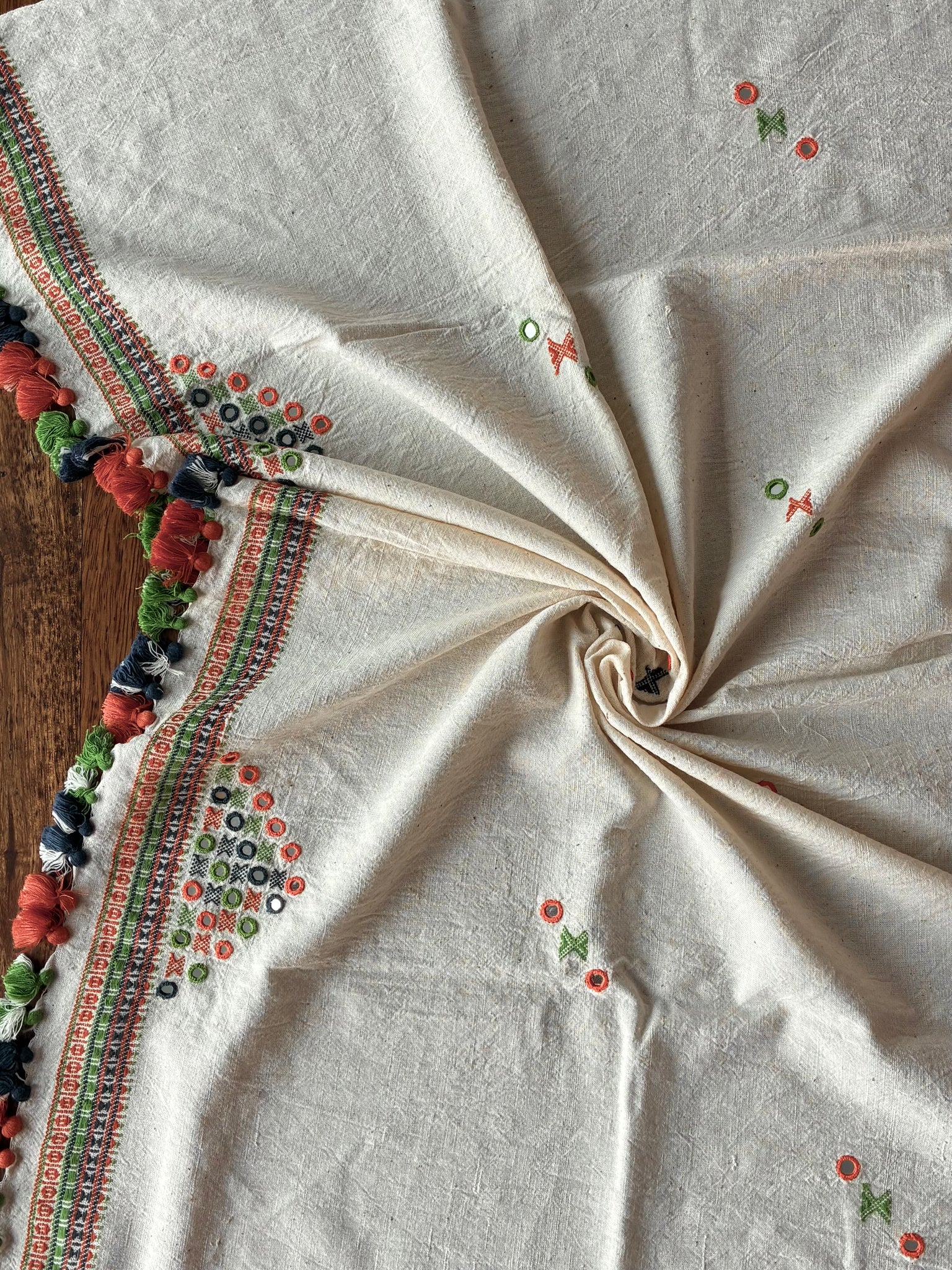 Colours off whuge body with dull kesariya orange, yellow and green coloured threadwork, butees and tassels.