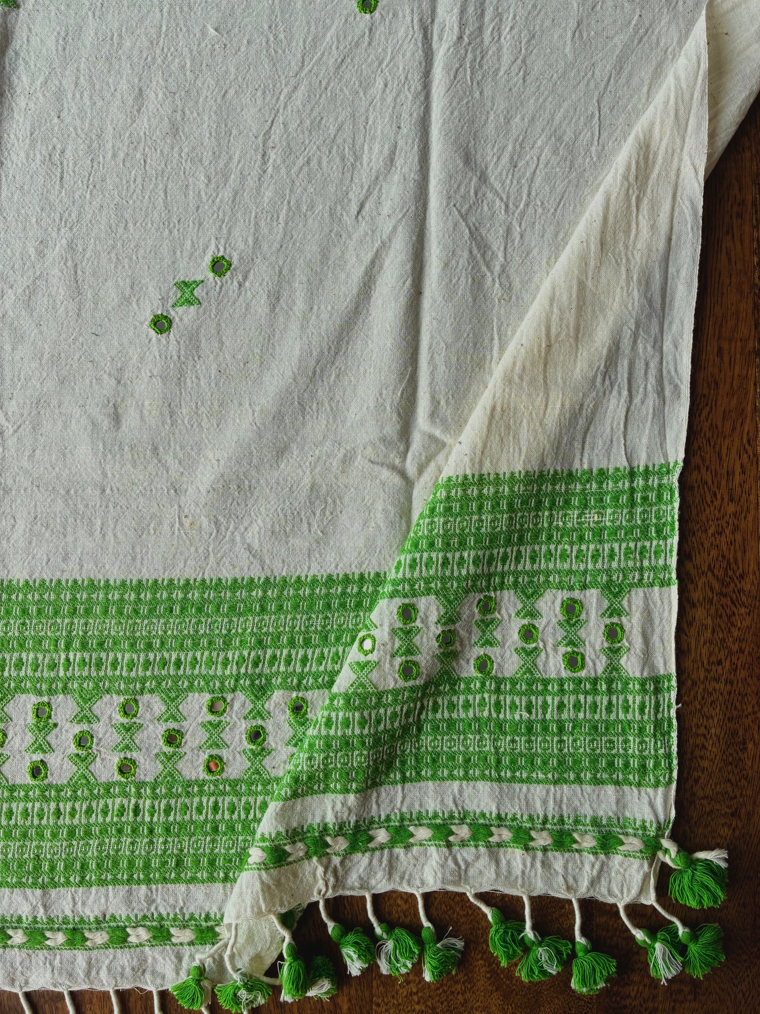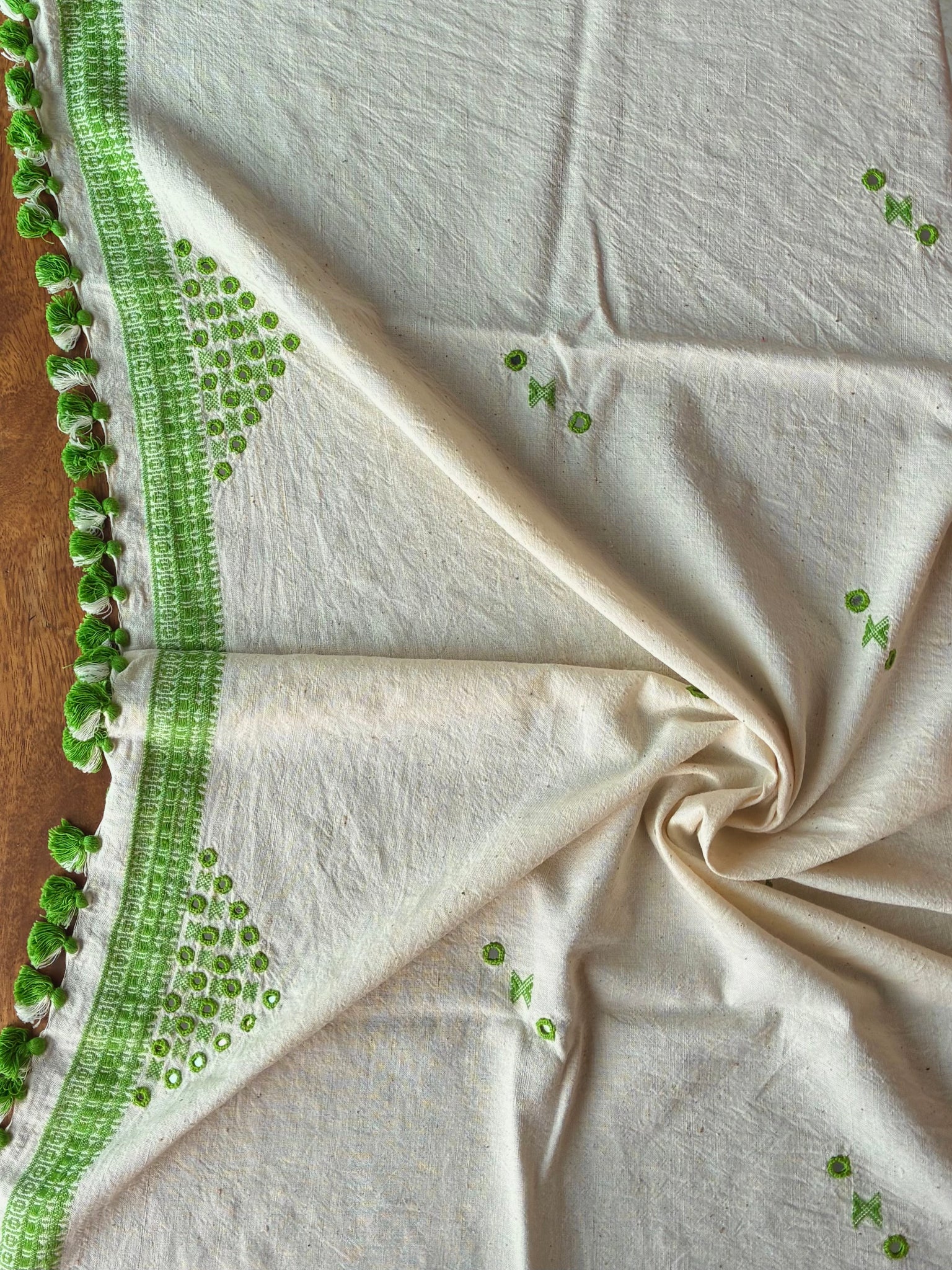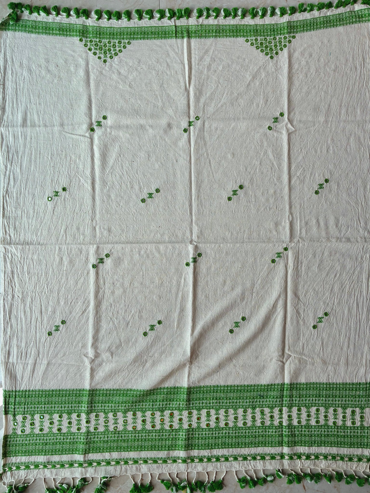 Colours off white body with green threadwork, butees and tassels.