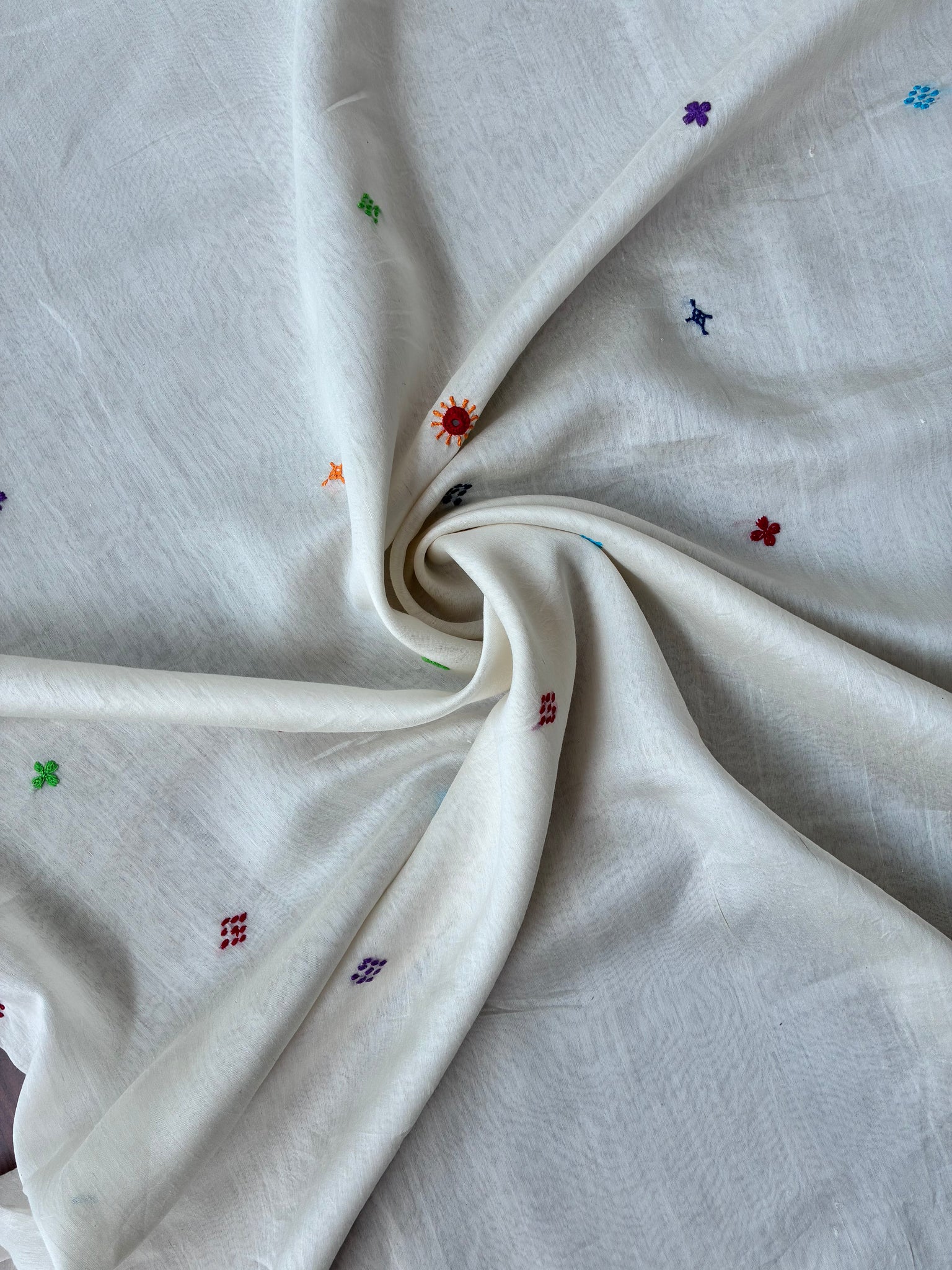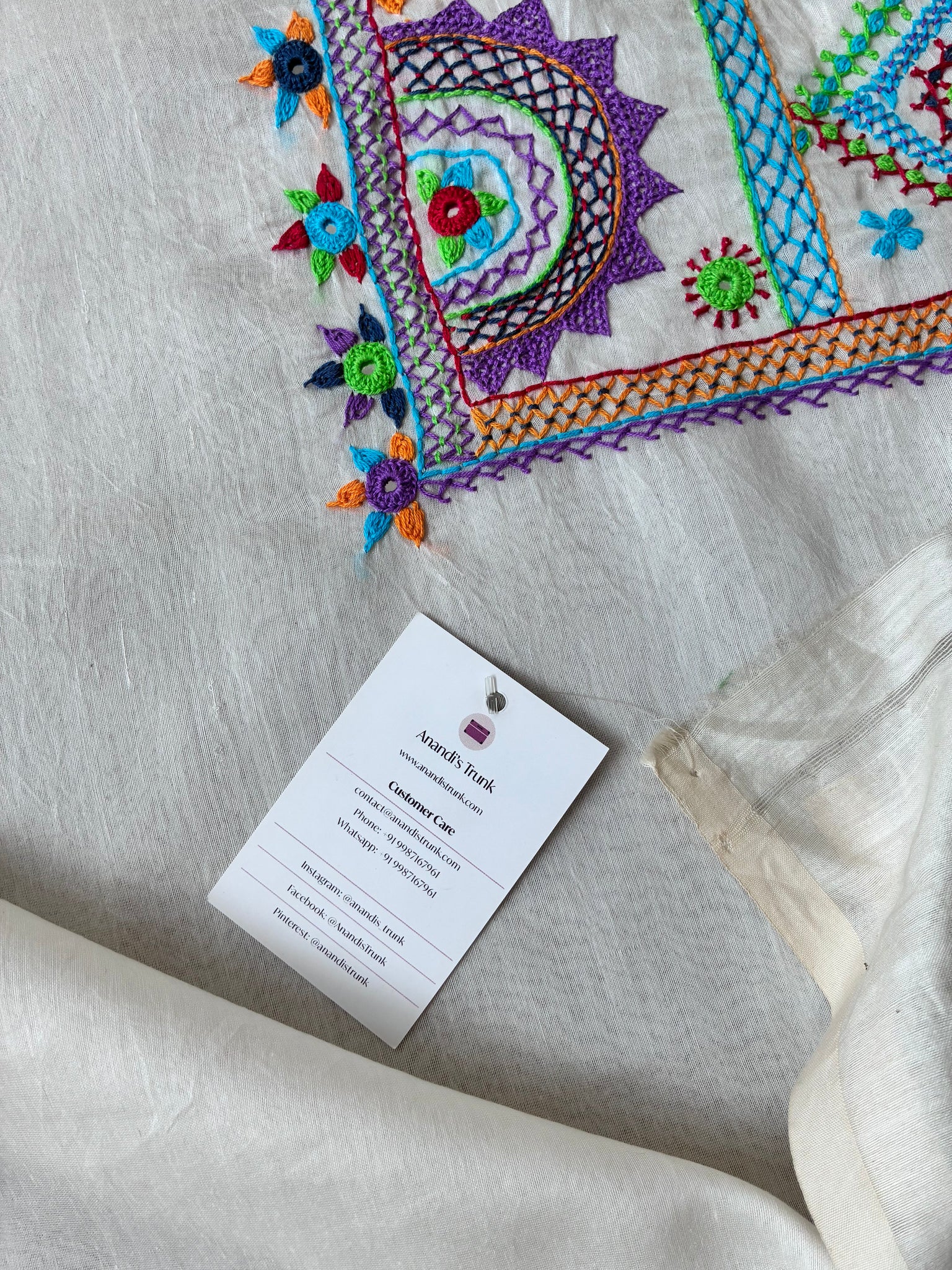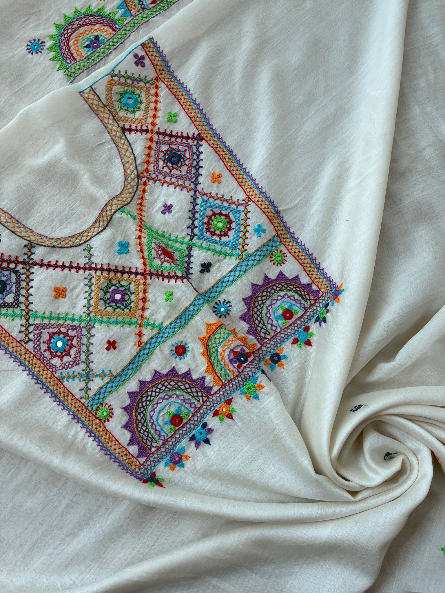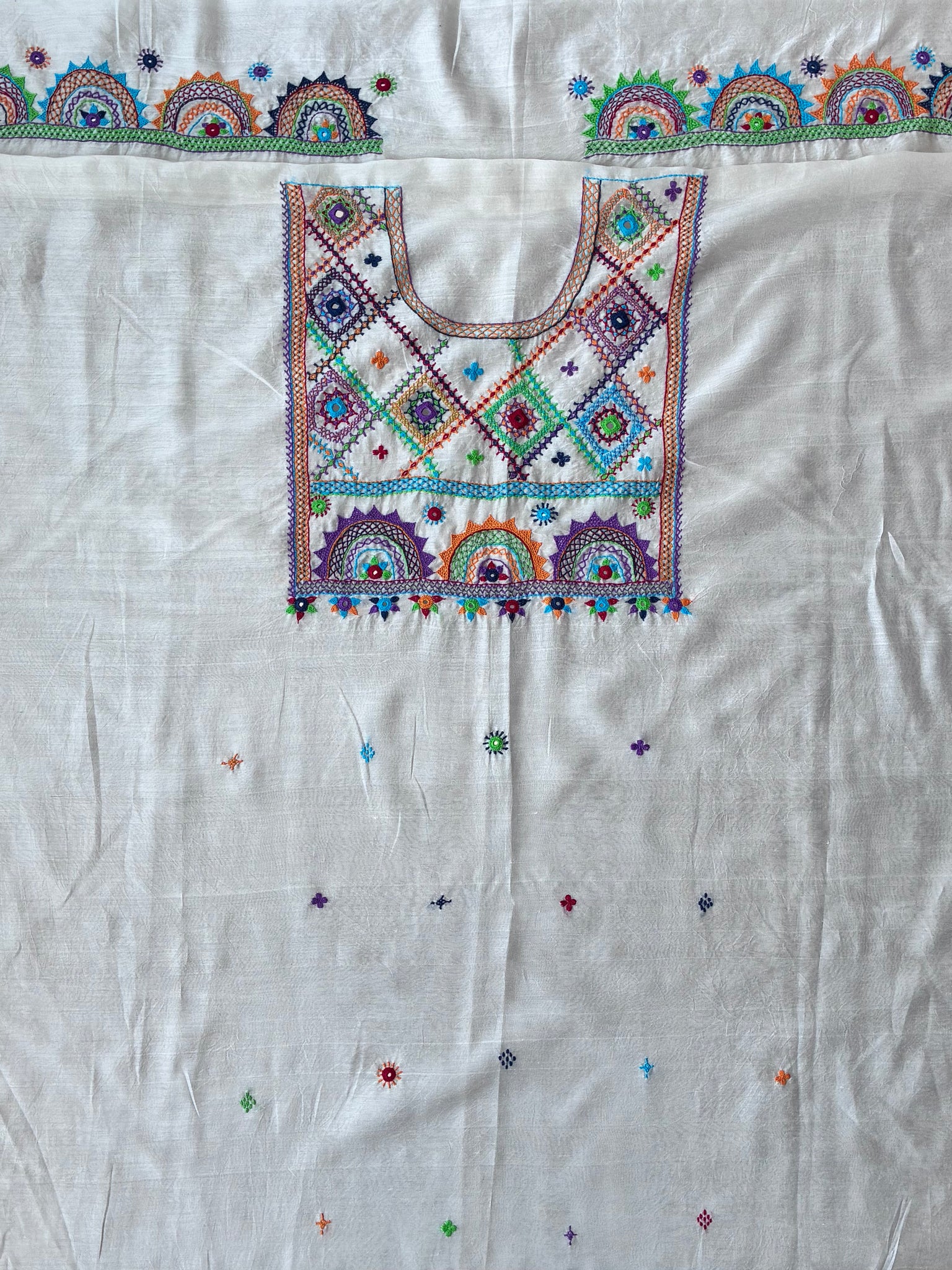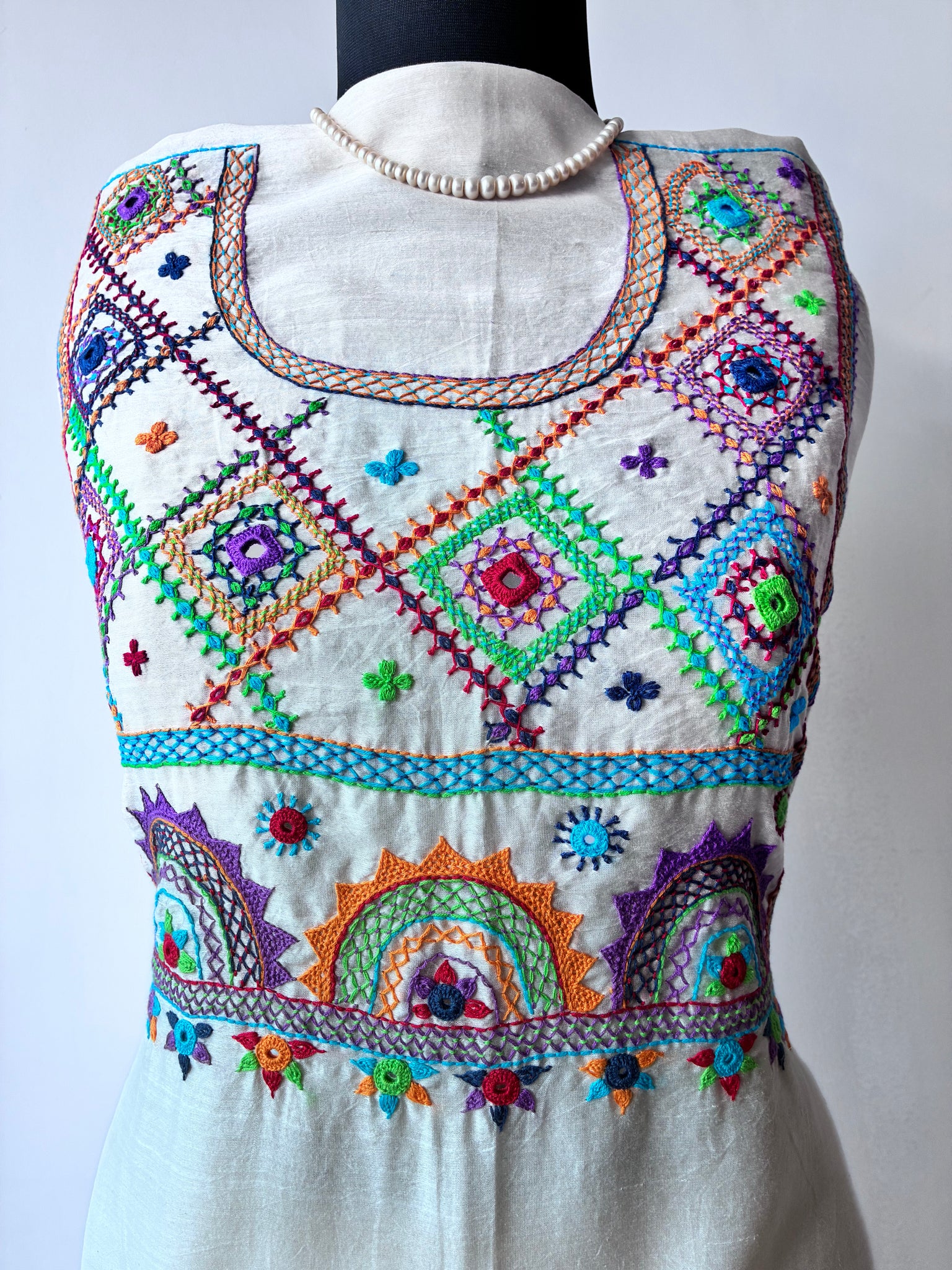 Colors: cream base, multicoloured threads used for embroidery.