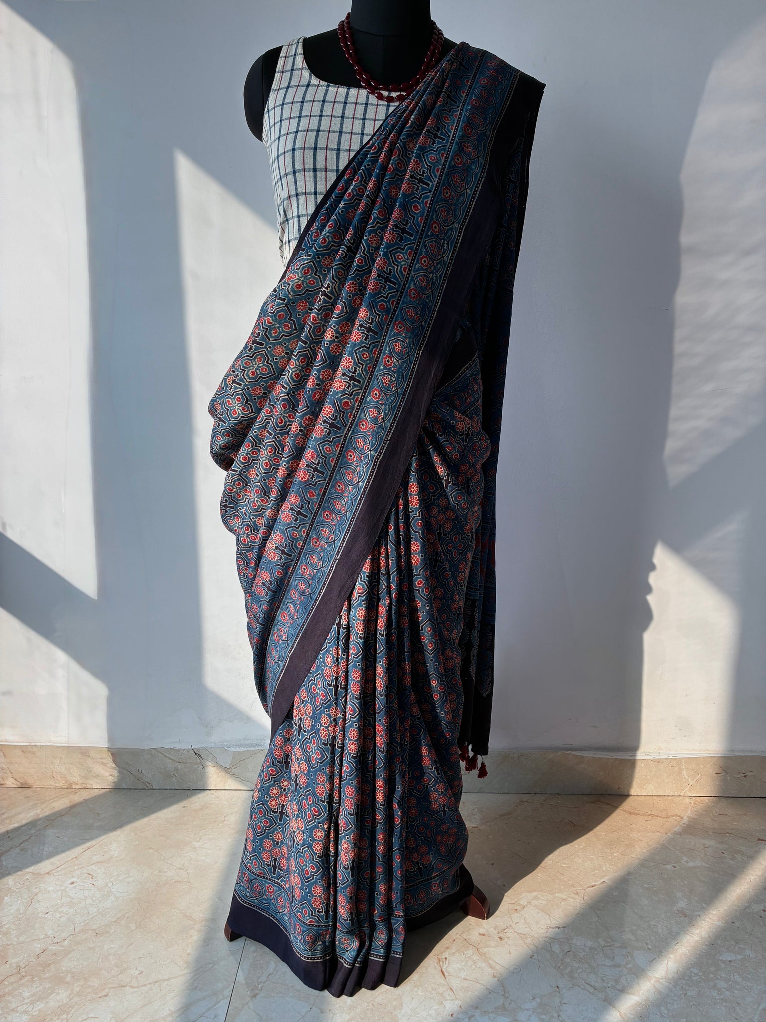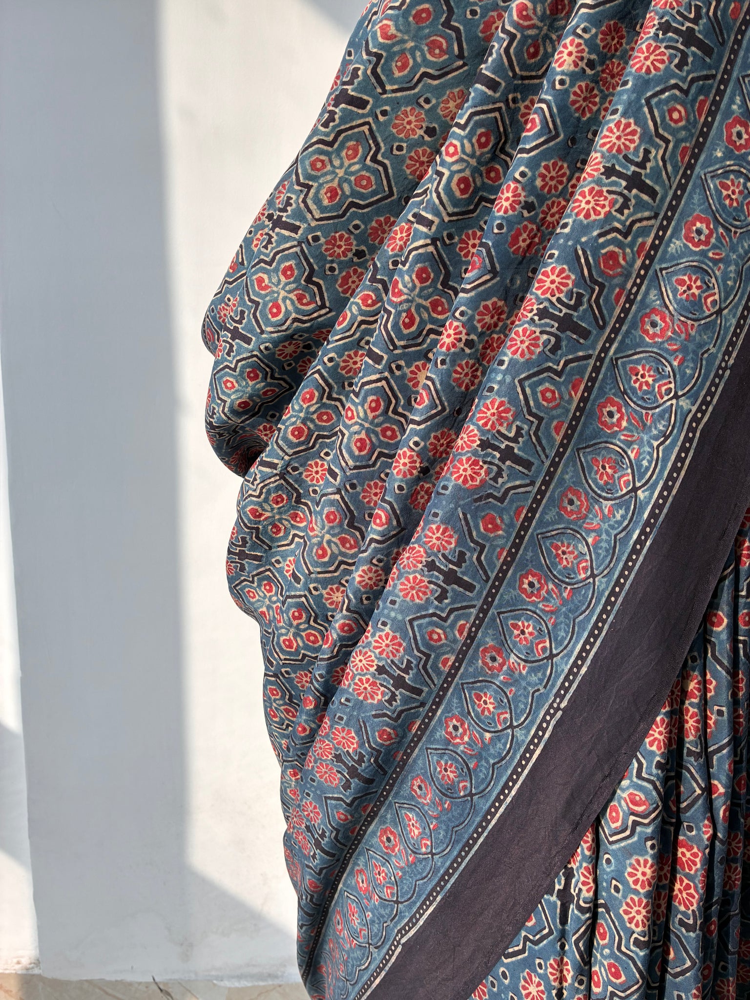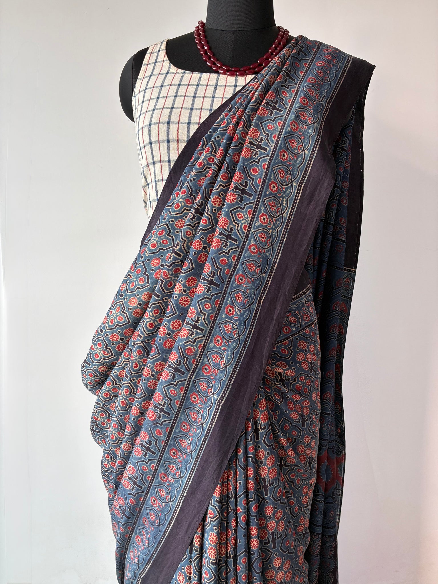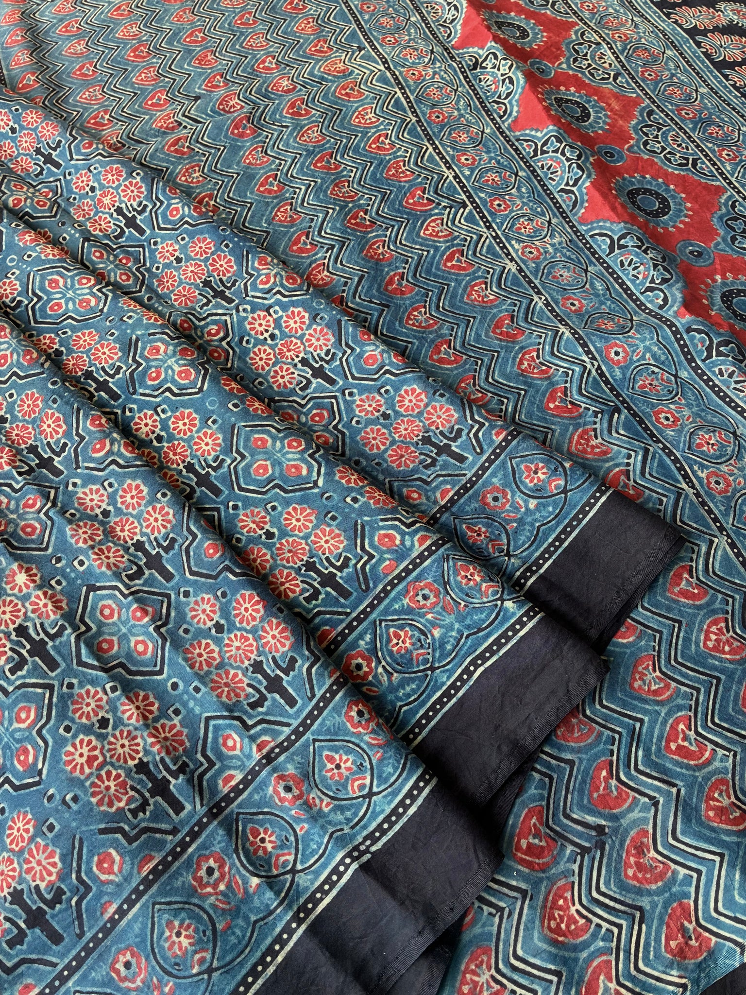 Ajrakh, natural dye, mulberry silk saree with running blouse piece.