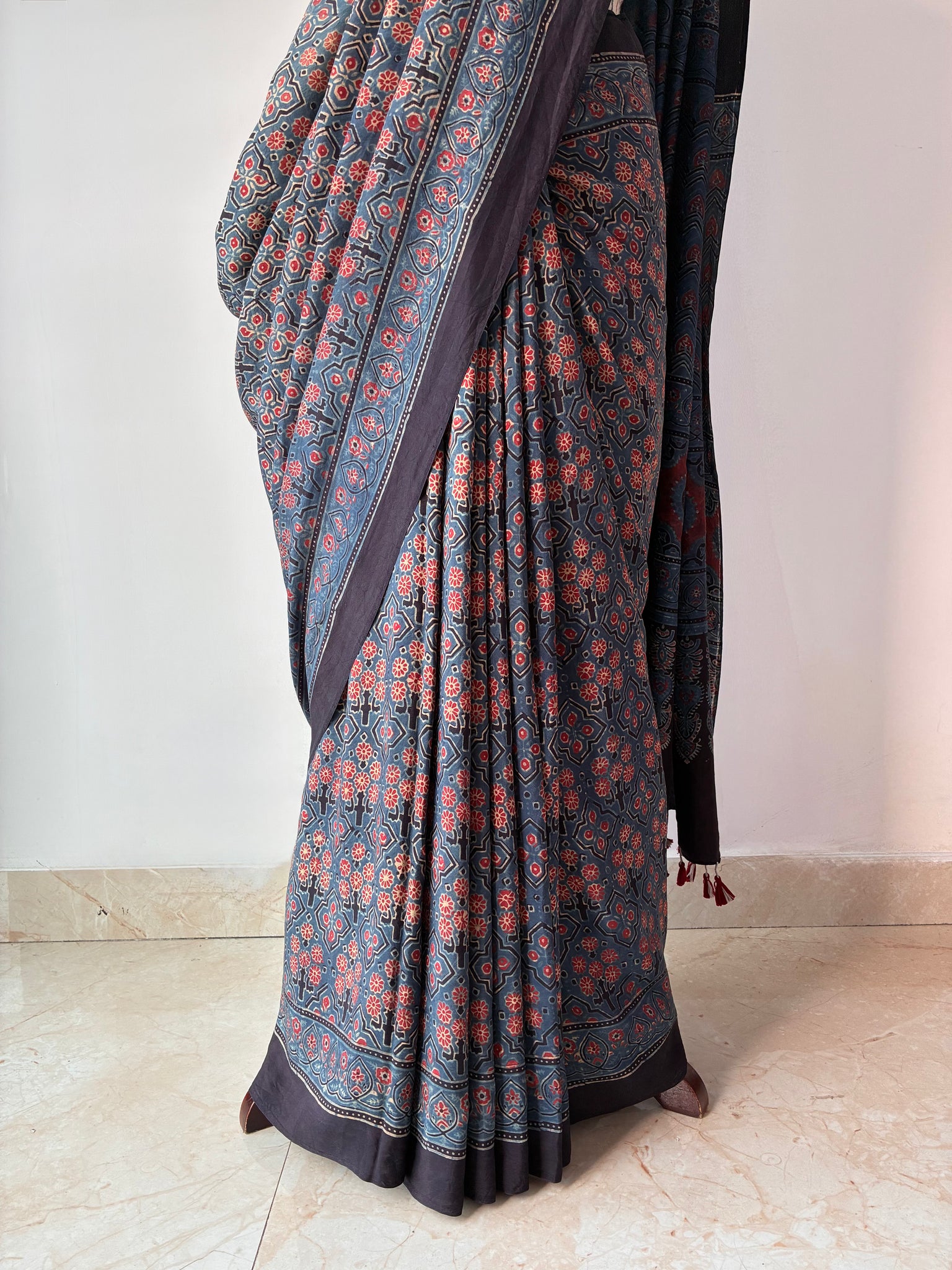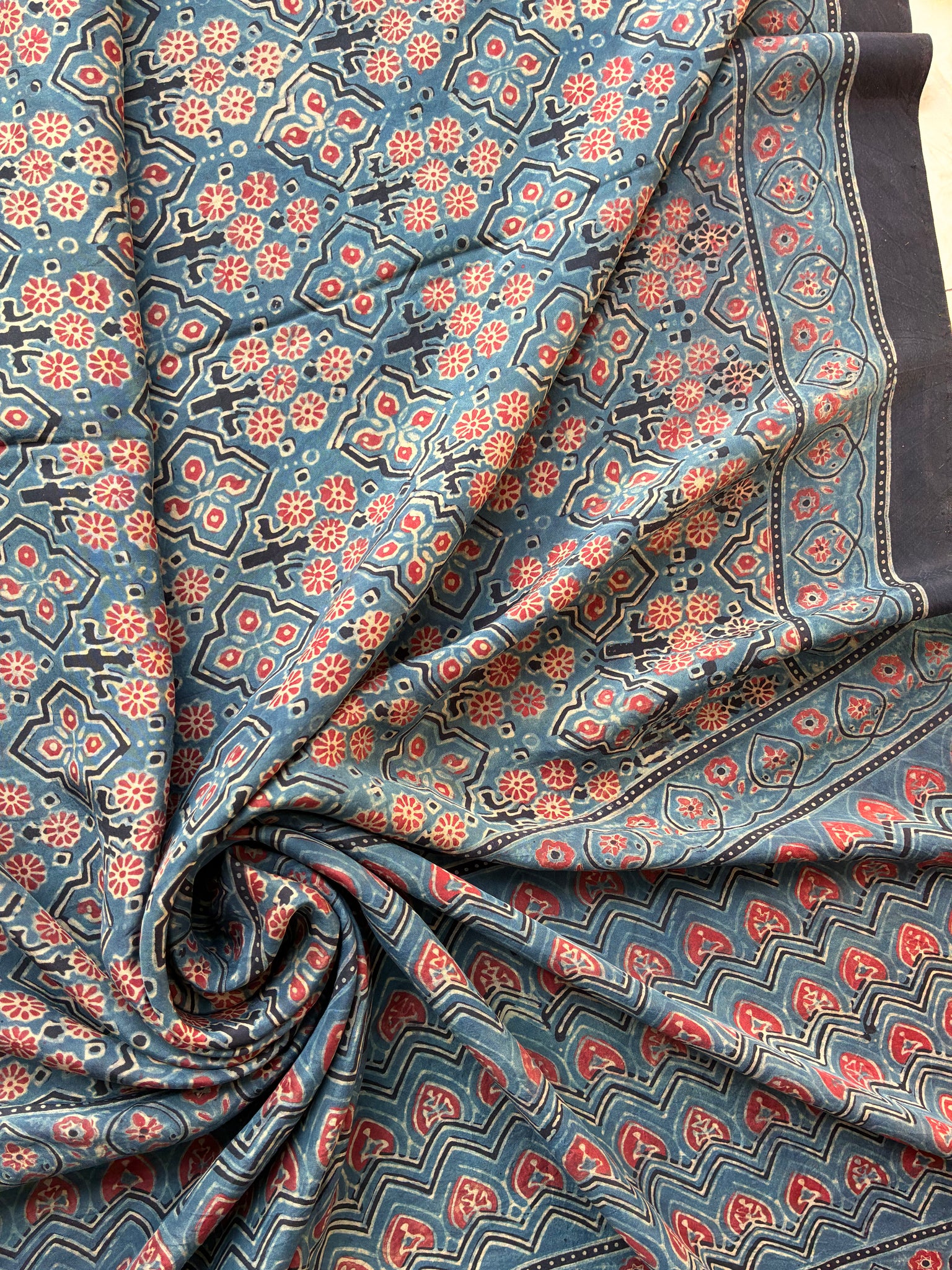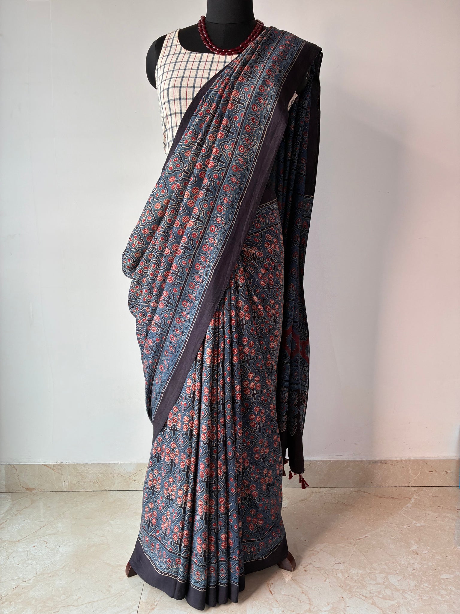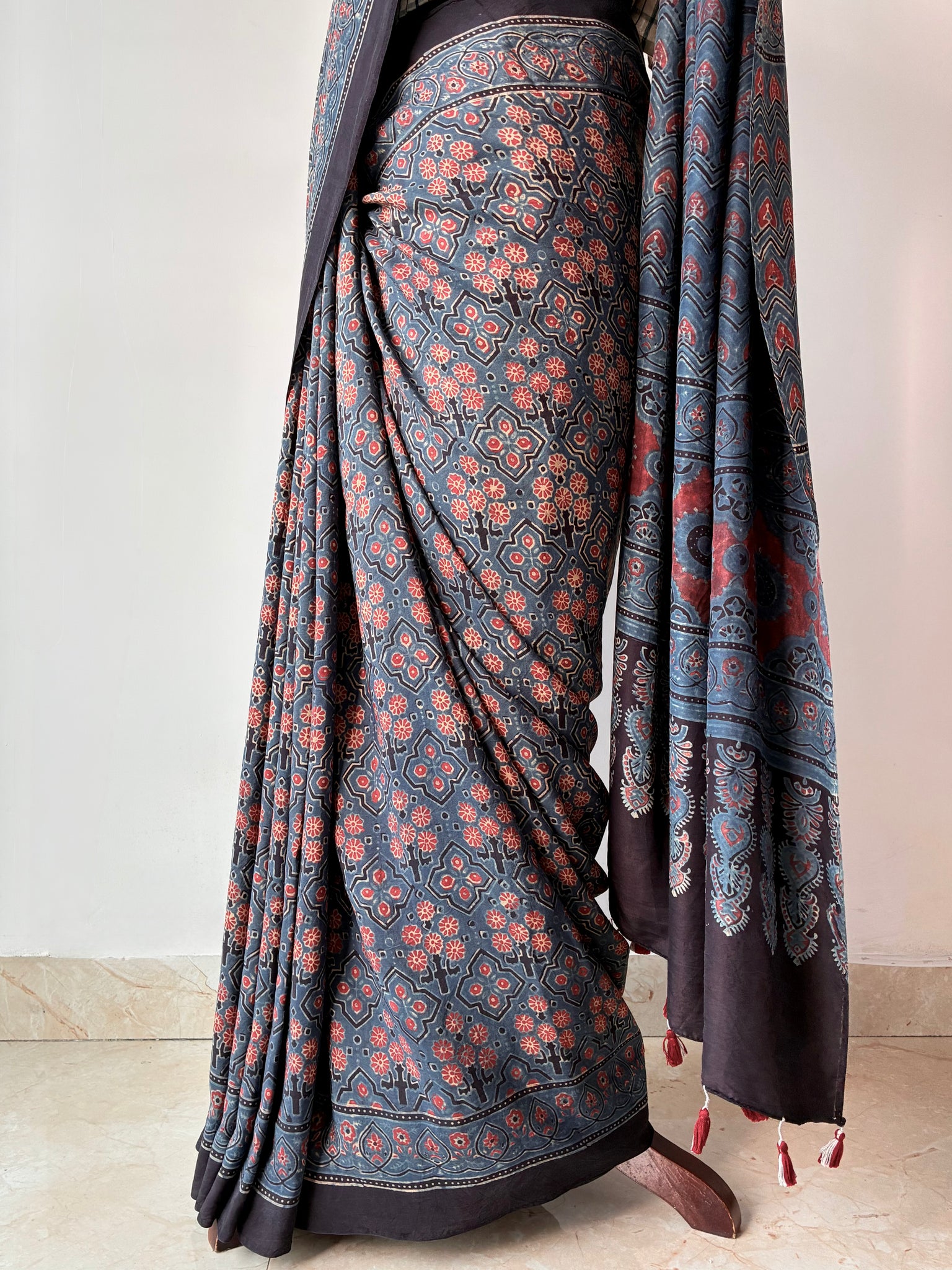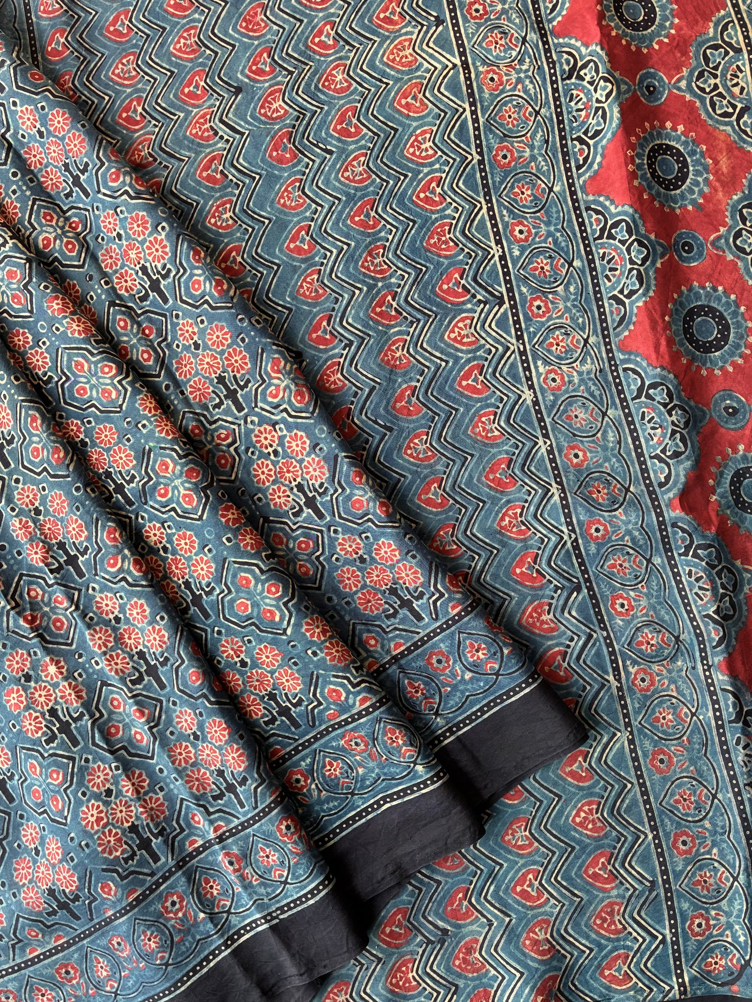 Ajrakh, natural dye, mulberry silk saree with running blouse piece.