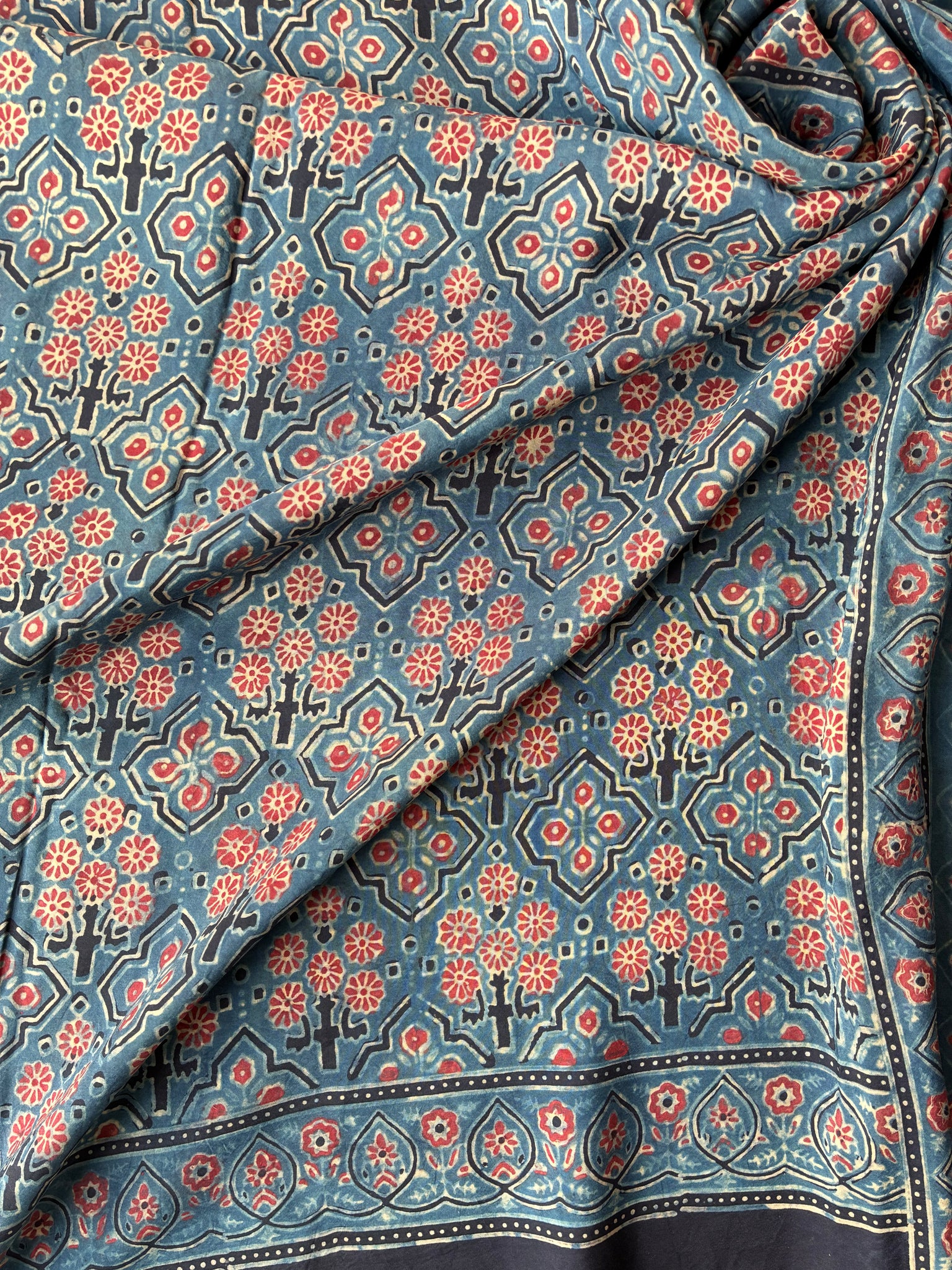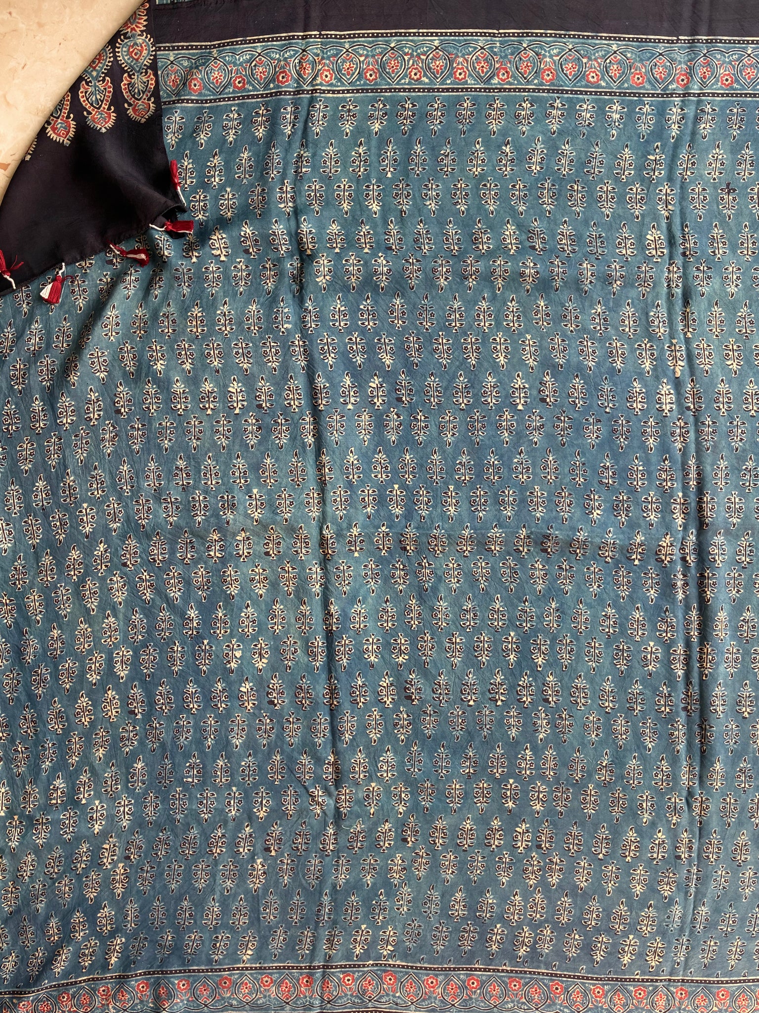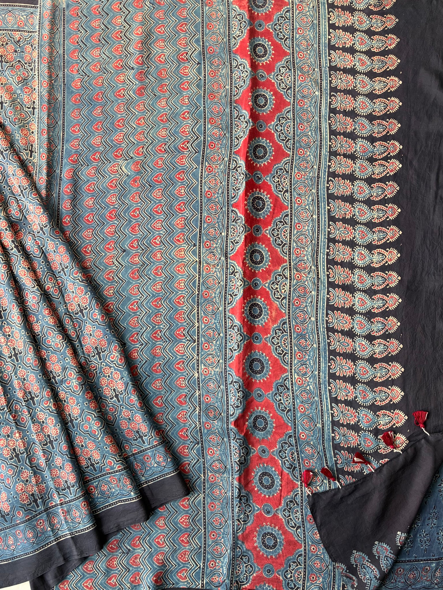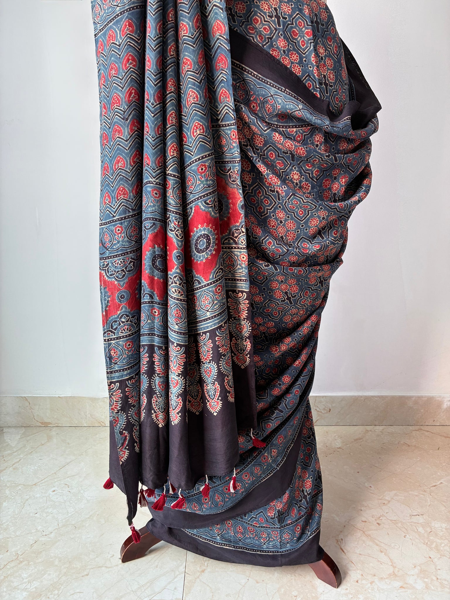 Ajrakh, natural dye, mulberry silk saree with running blouse piece.