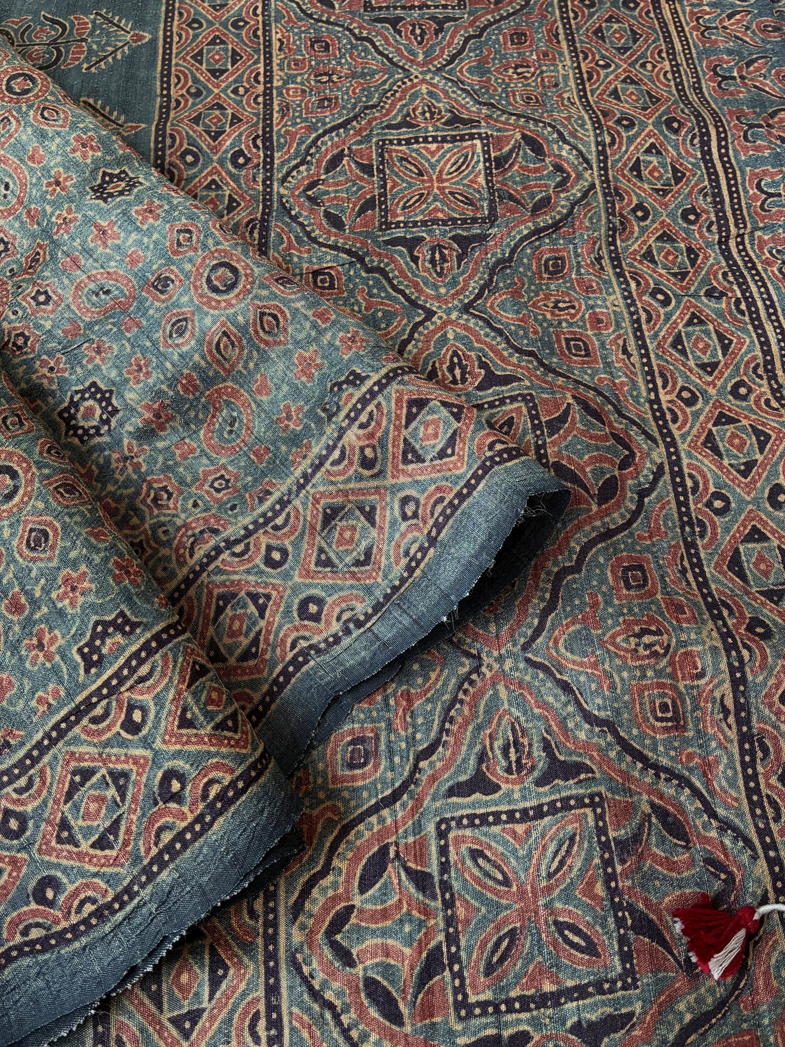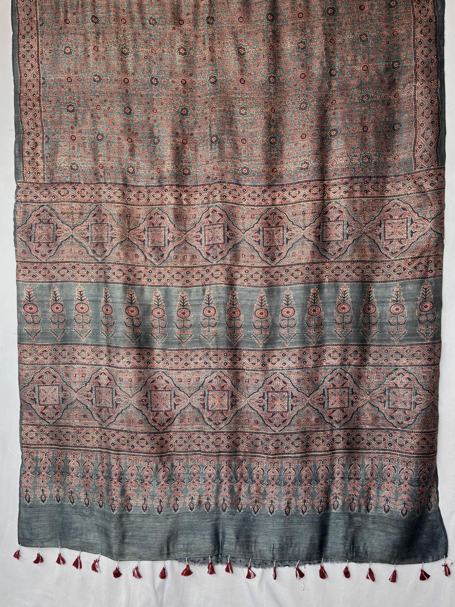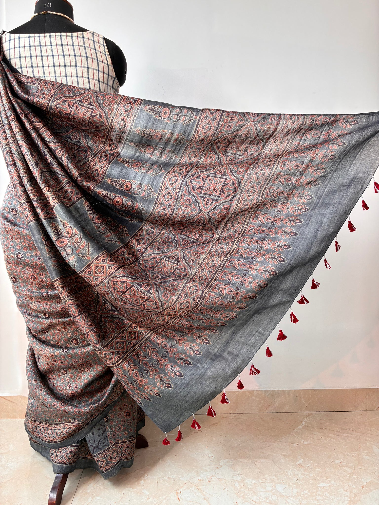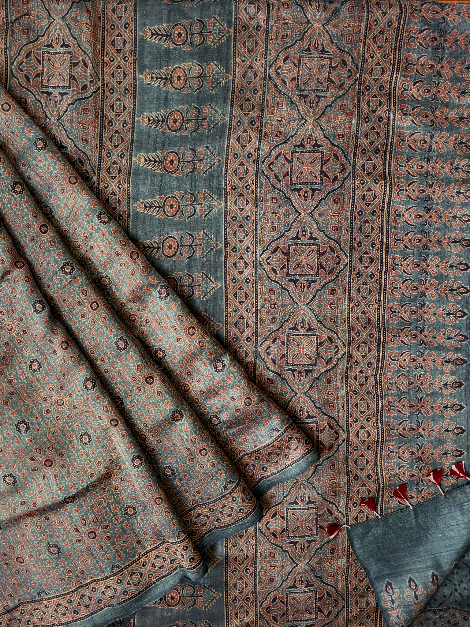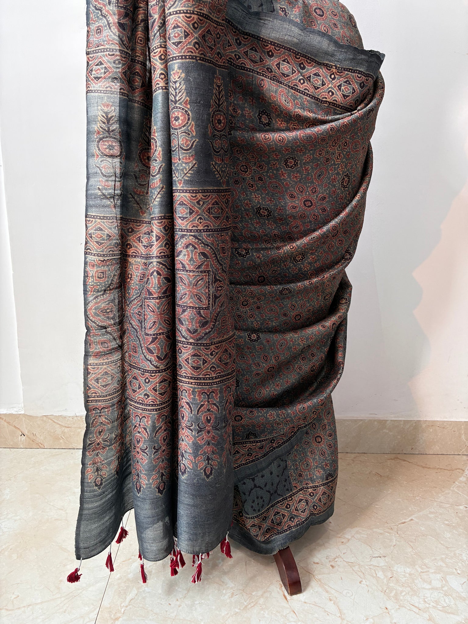Ajrakh Tussar Silk Saree (block printed using natural dyes)
