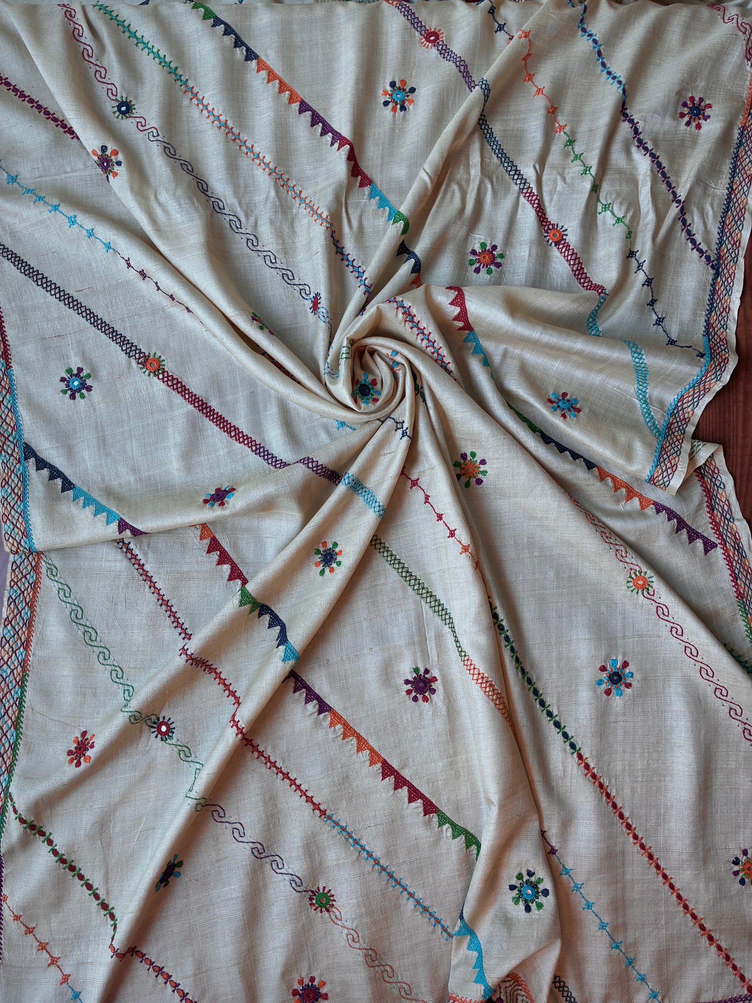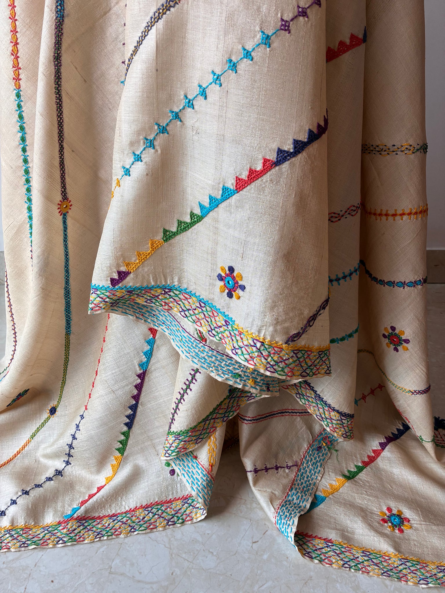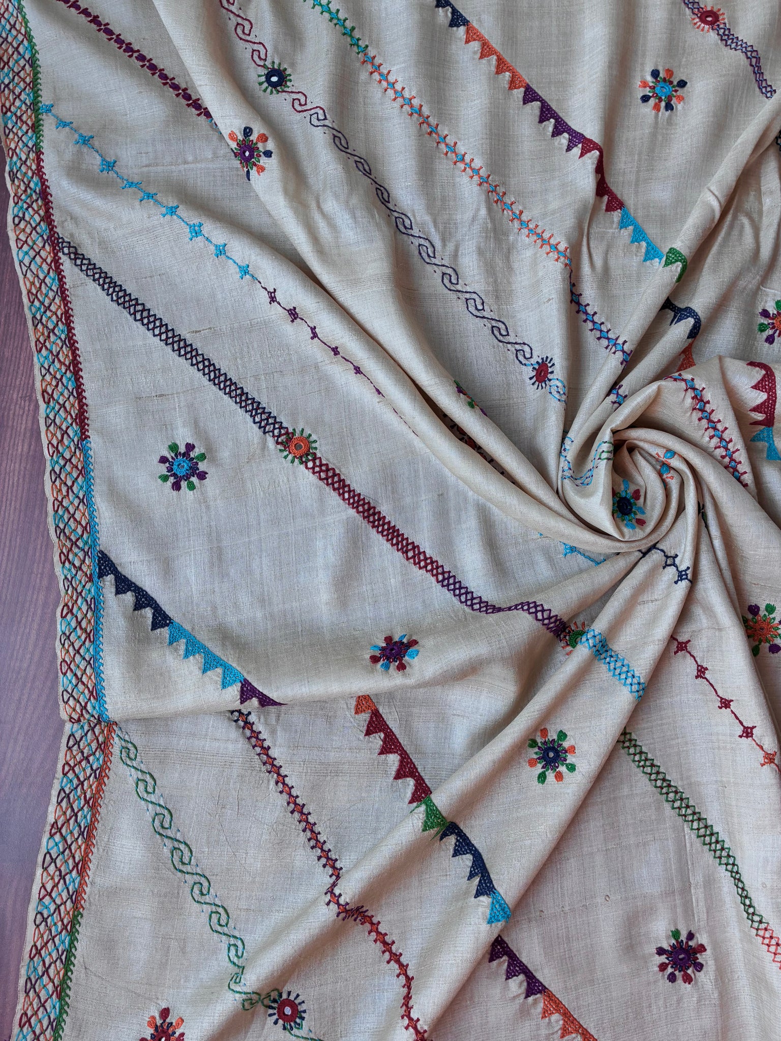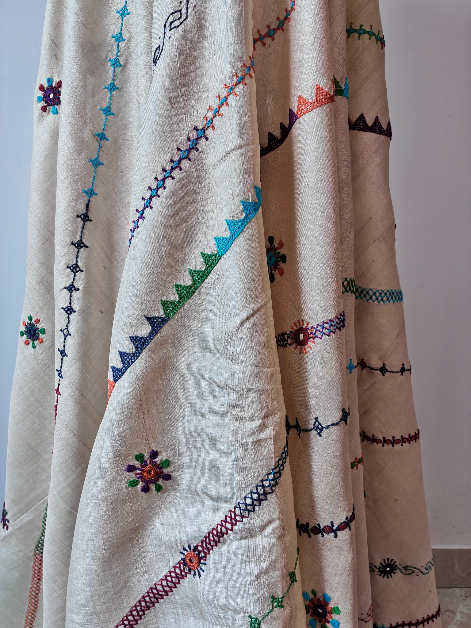 Intricately detailed Lambani hand embroidered pure tussar silk dupatta. The base fabric is handwoven unbleached tussar silk fabric handwoven in the Vidarbha region of Maharashtra.